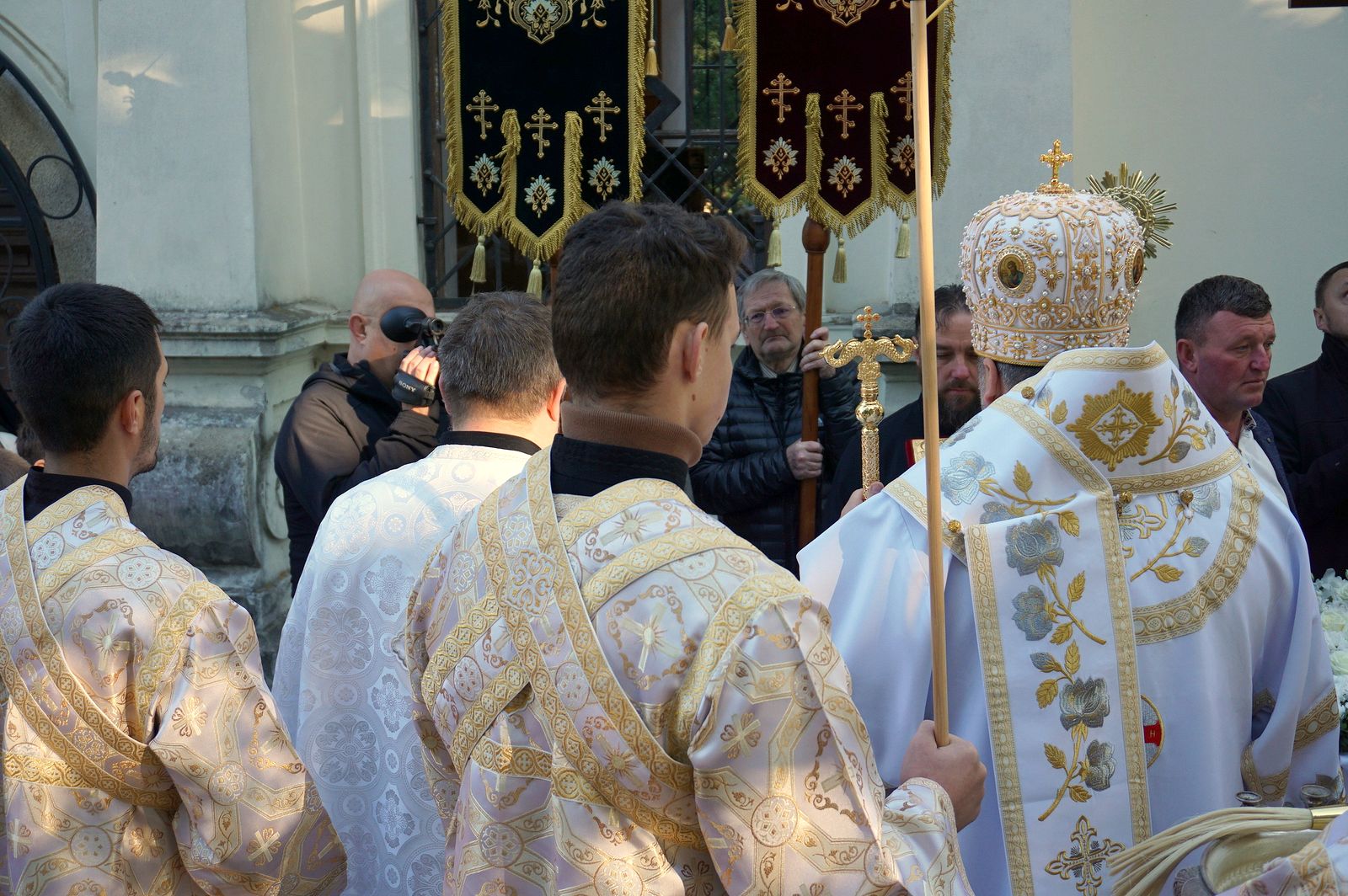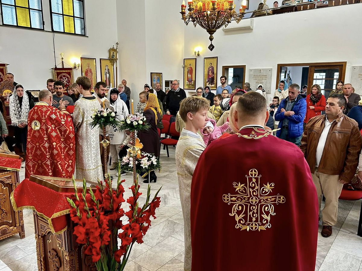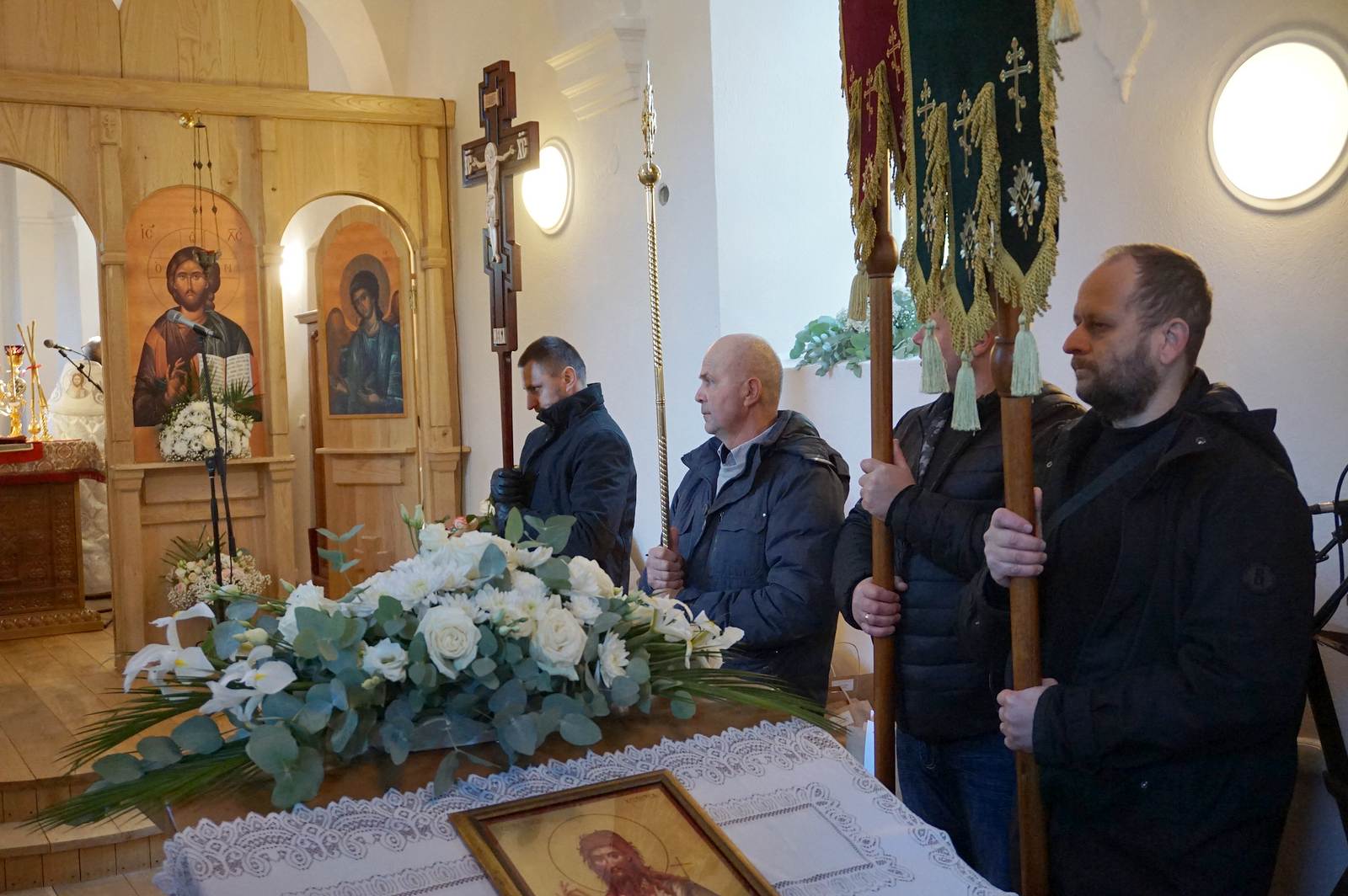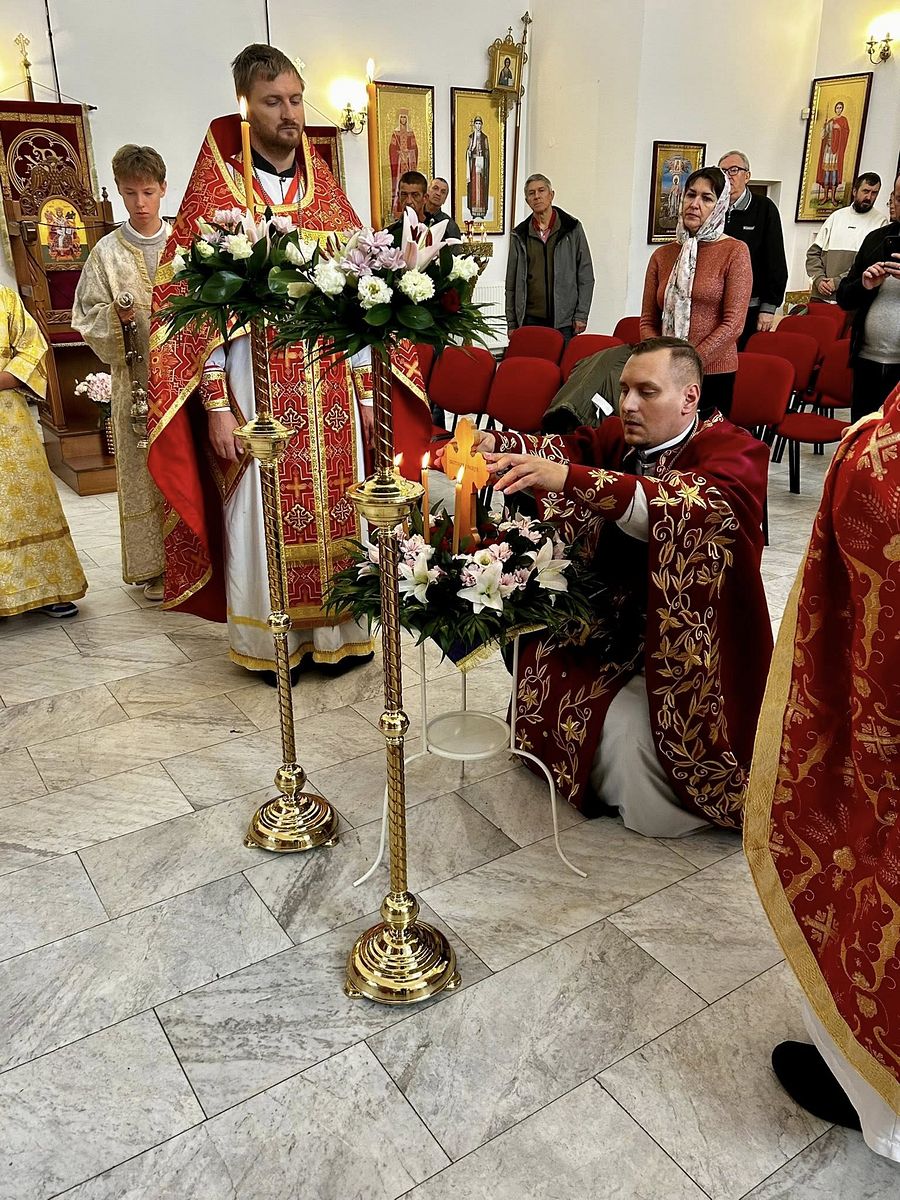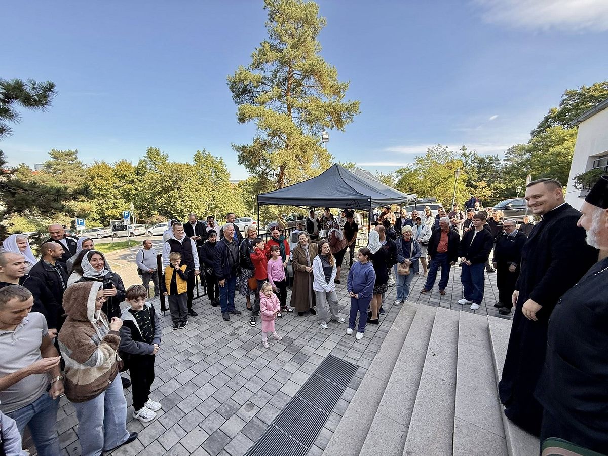 Druhý den svěcení jihlavského chrámu začal v sobotu 4. října 2025 v 9 hod. ráno, kdy jsme vyšli z chrámu s křížem, korouhvemi, ripidami, sváteční ikonou, Evangeliářem, kadidlem a vykonali slavnostní průvod kolem chrámu. Prestol vladyka posvětil včera, takže dnes byla na řadě druhá část slavnosti – svěcení chrámu.