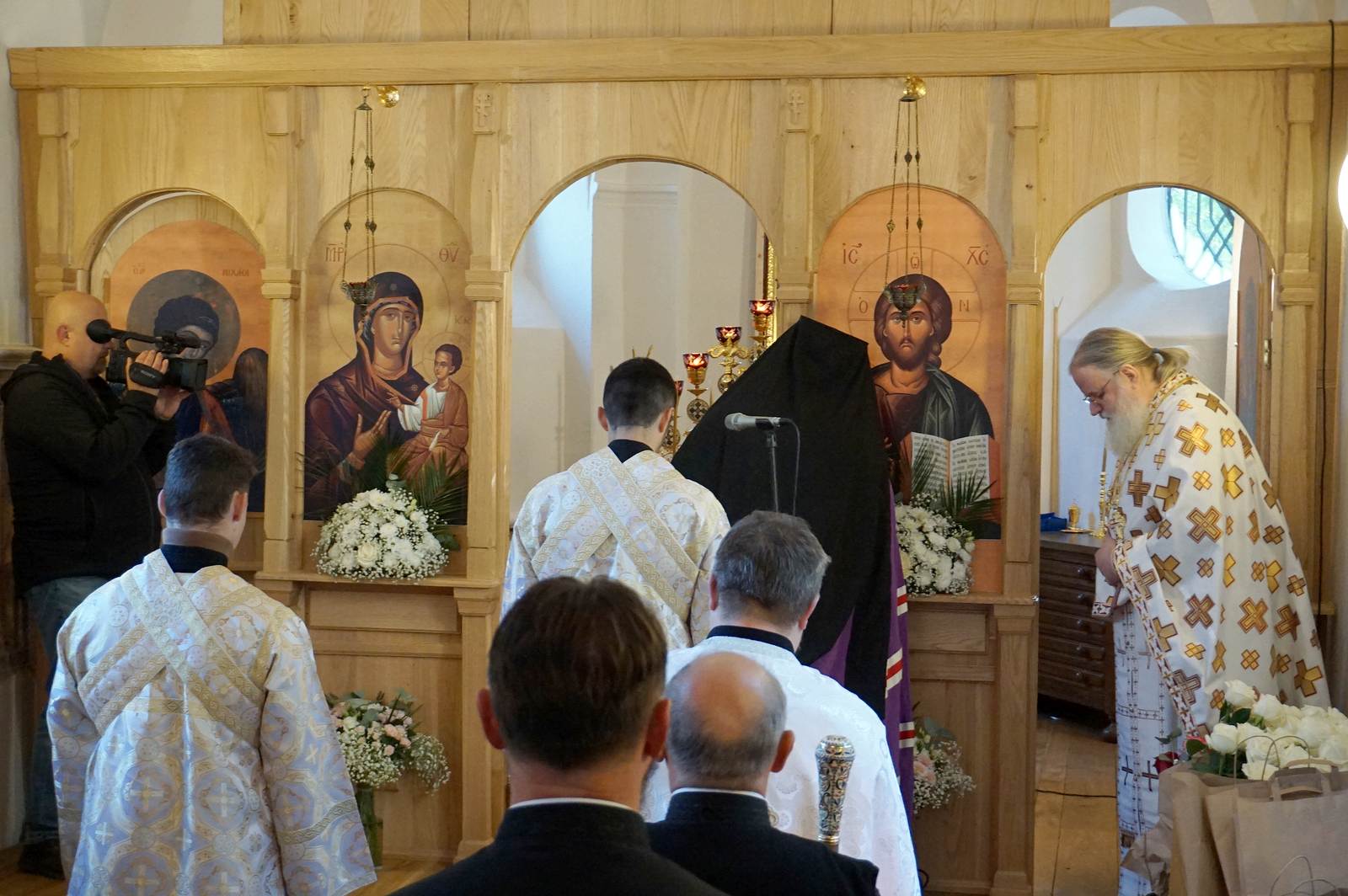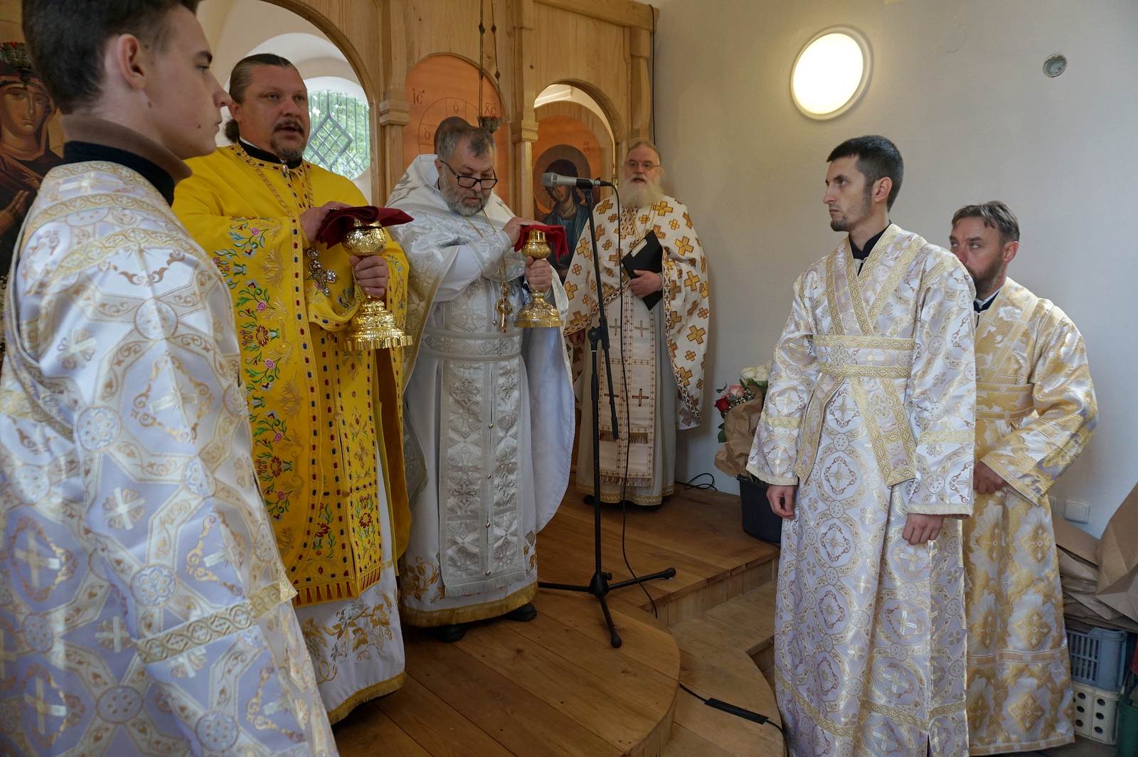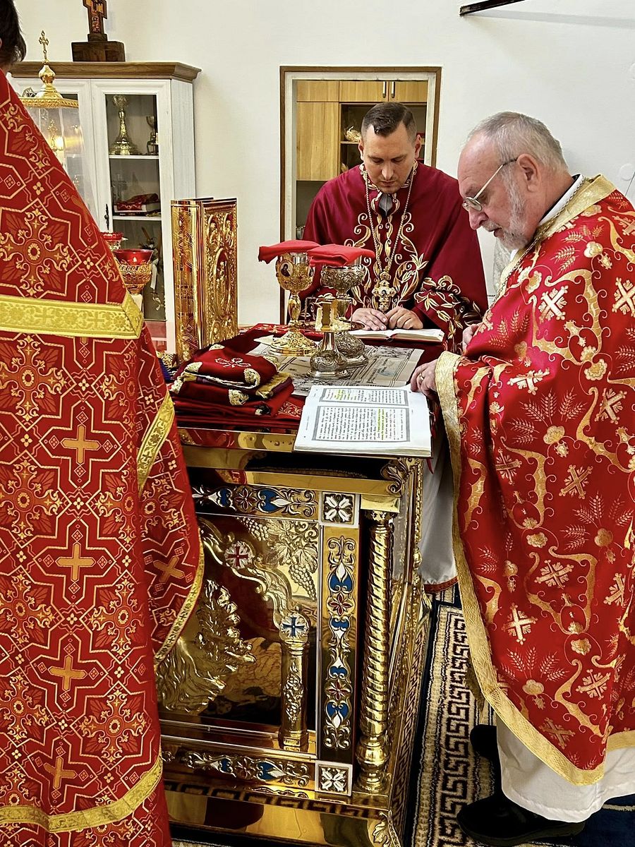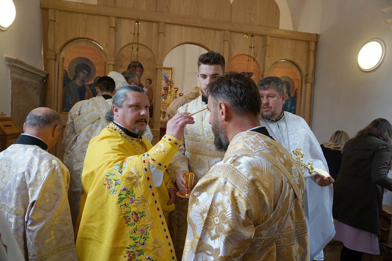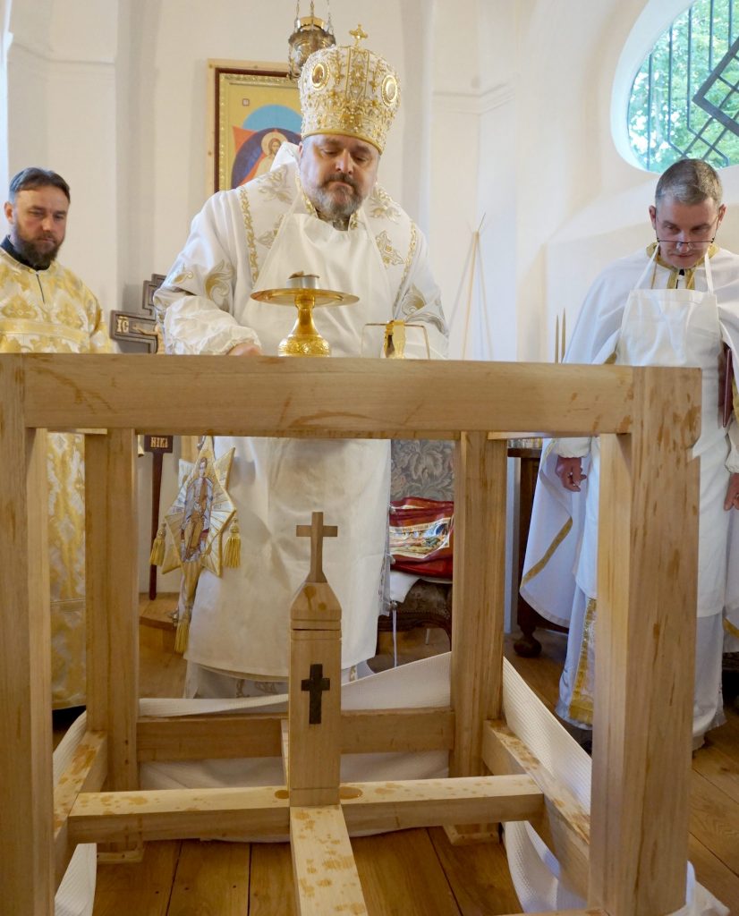 V pátek 3. října jsme se tedy dobrali k dlouho očekávané události – posvěcení oltářního stolu čili mensy, kde se přináší nekrvavá oběť. V 16 hod. přijel náš Přeosvícený vladyka Izaiáš, biskup olomoucko-brněnský, s doprovodem. Přijela už i řada duchovních. Obřad velkého svěcení mohl začít. Bohoslužebný řád probíhal podle řeckého způsobu, který je trochu delší než ruský a má jiné (myslím, že logičtější) pořadí jednotlivých součástí. S požehnáním vladyky jsme nechali oponu ikonostasu rozhrnutou a královskou bránu otevřenou. Věřící byli vyzváni, aby se shromáždili hned pod ambonem a zblízka mohli pozorovat celý postup obřadu.