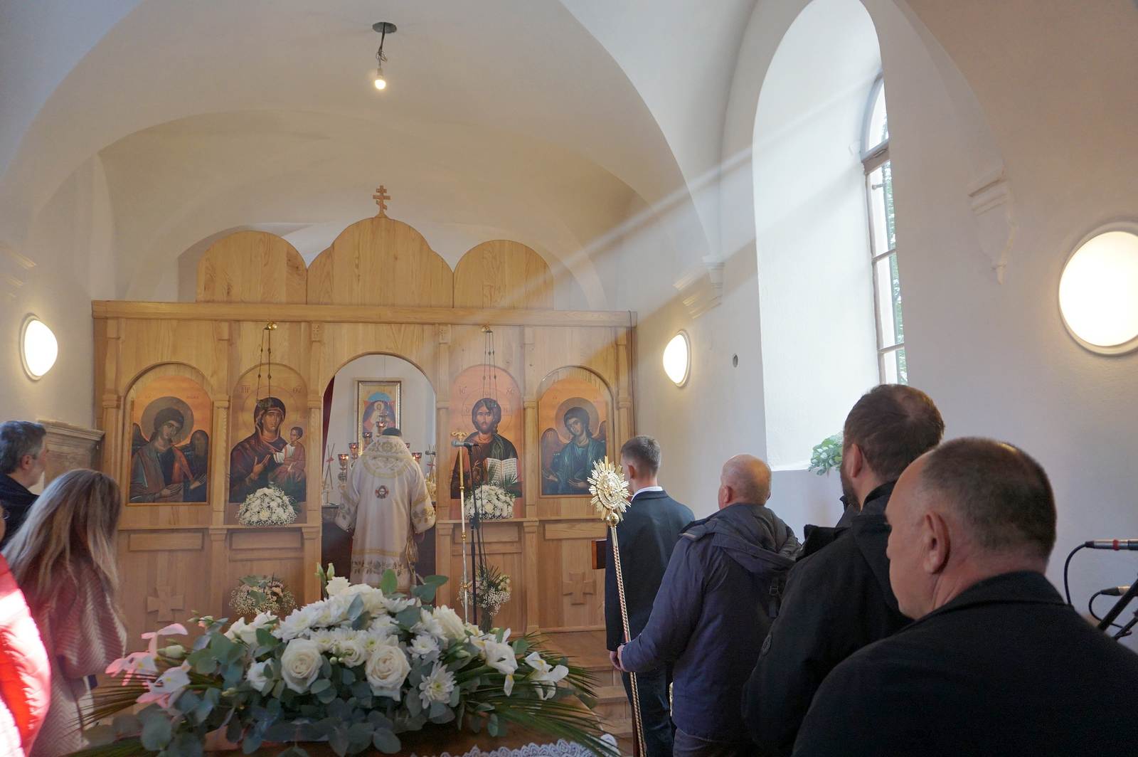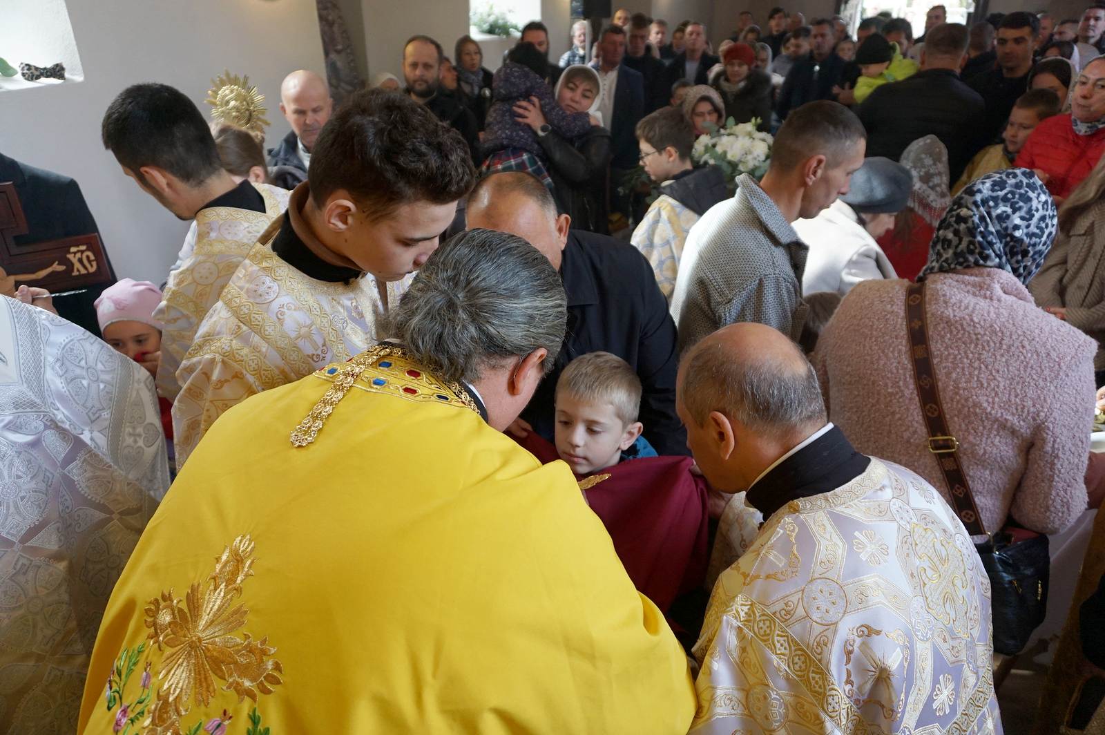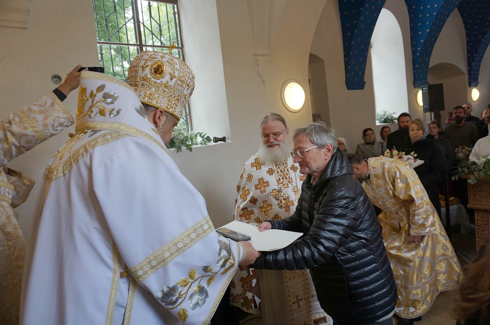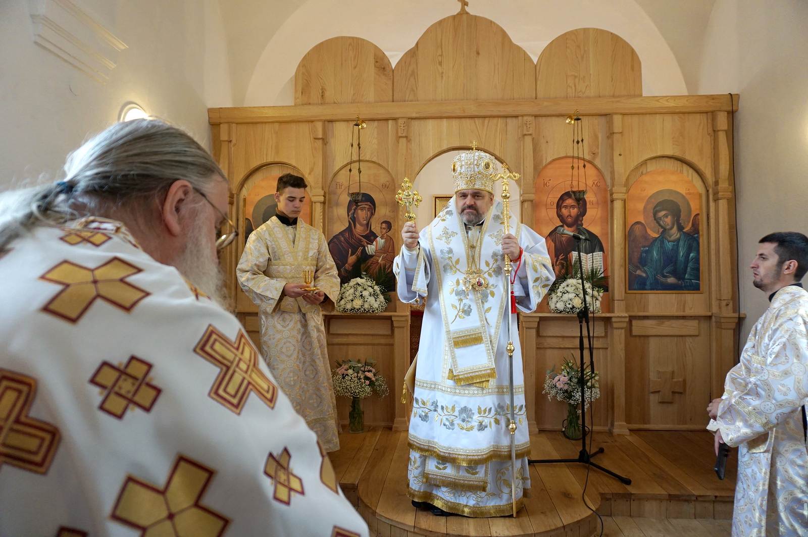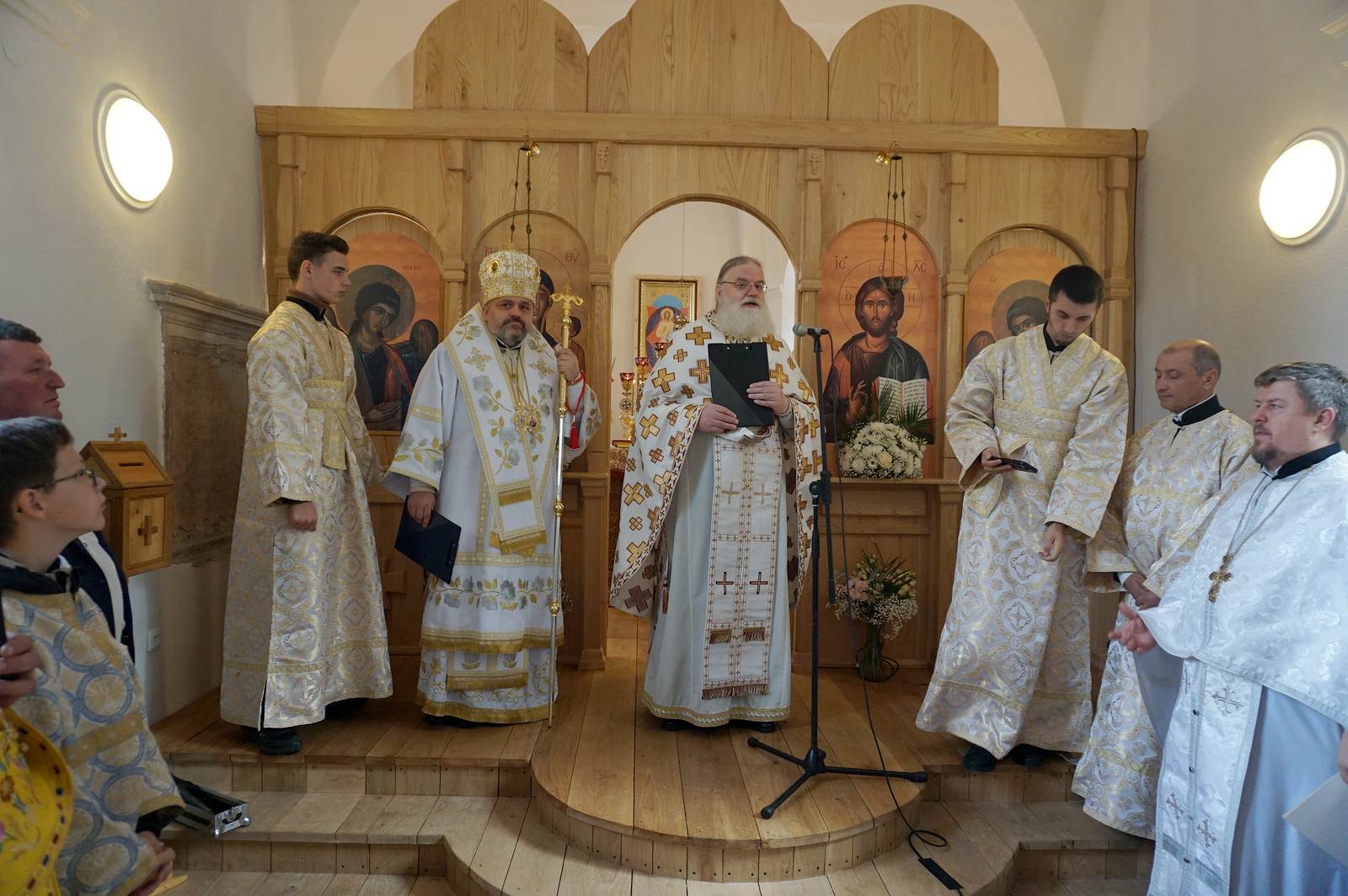 V pátek 3. října jsme se tedy dobrali k dlouho očekávané události – posvěcení oltářního stolu čili mensy, kde se přináší nekrvavá oběť. V 16 hod. přijel náš Přeosvícený vladyka Izaiáš, biskup olomoucko-brněnský, s doprovodem. Přijela už i řada duchovních. Obřad velkého svěcení mohl začít. Bohoslužebný řád probíhal podle řeckého způsobu, který je trochu delší než ruský a má jiné (myslím, že logičtější) pořadí jednotlivých součástí. S požehnáním vladyky jsme nechali oponu ikonostasu rozhrnutou a královskou bránu otevřenou. Věřící byli vyzváni, aby se shromáždili hned pod ambonem a zblízka mohli pozorovat celý postup obřadu.