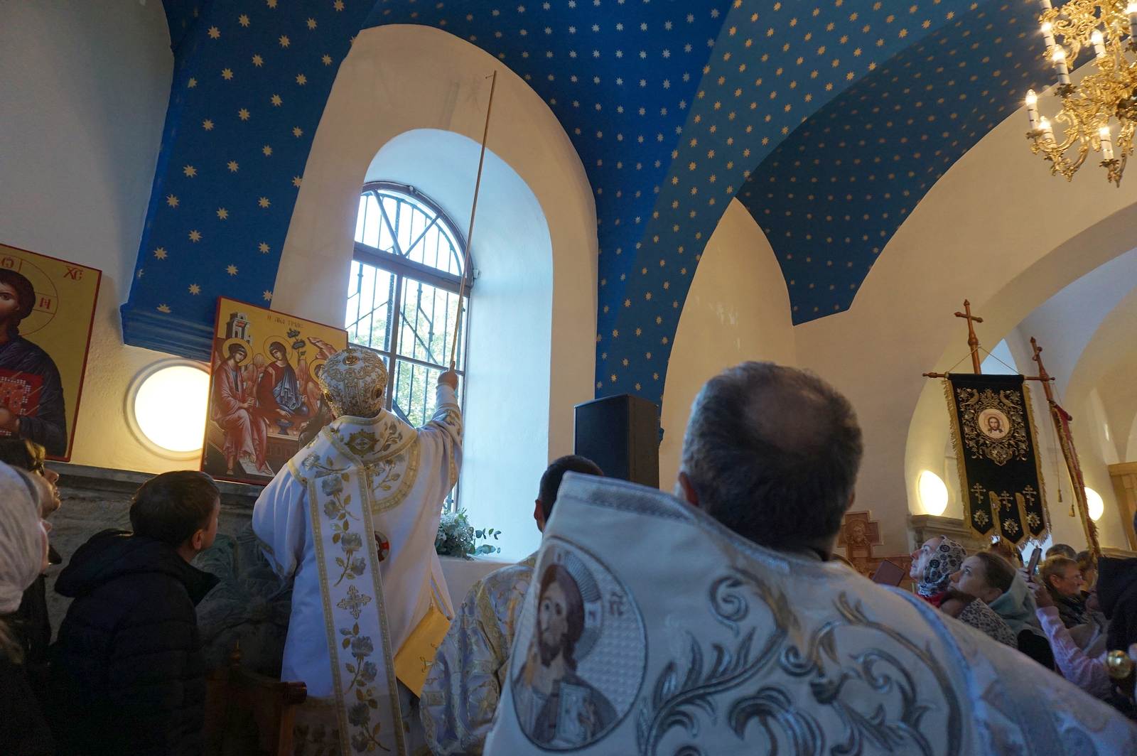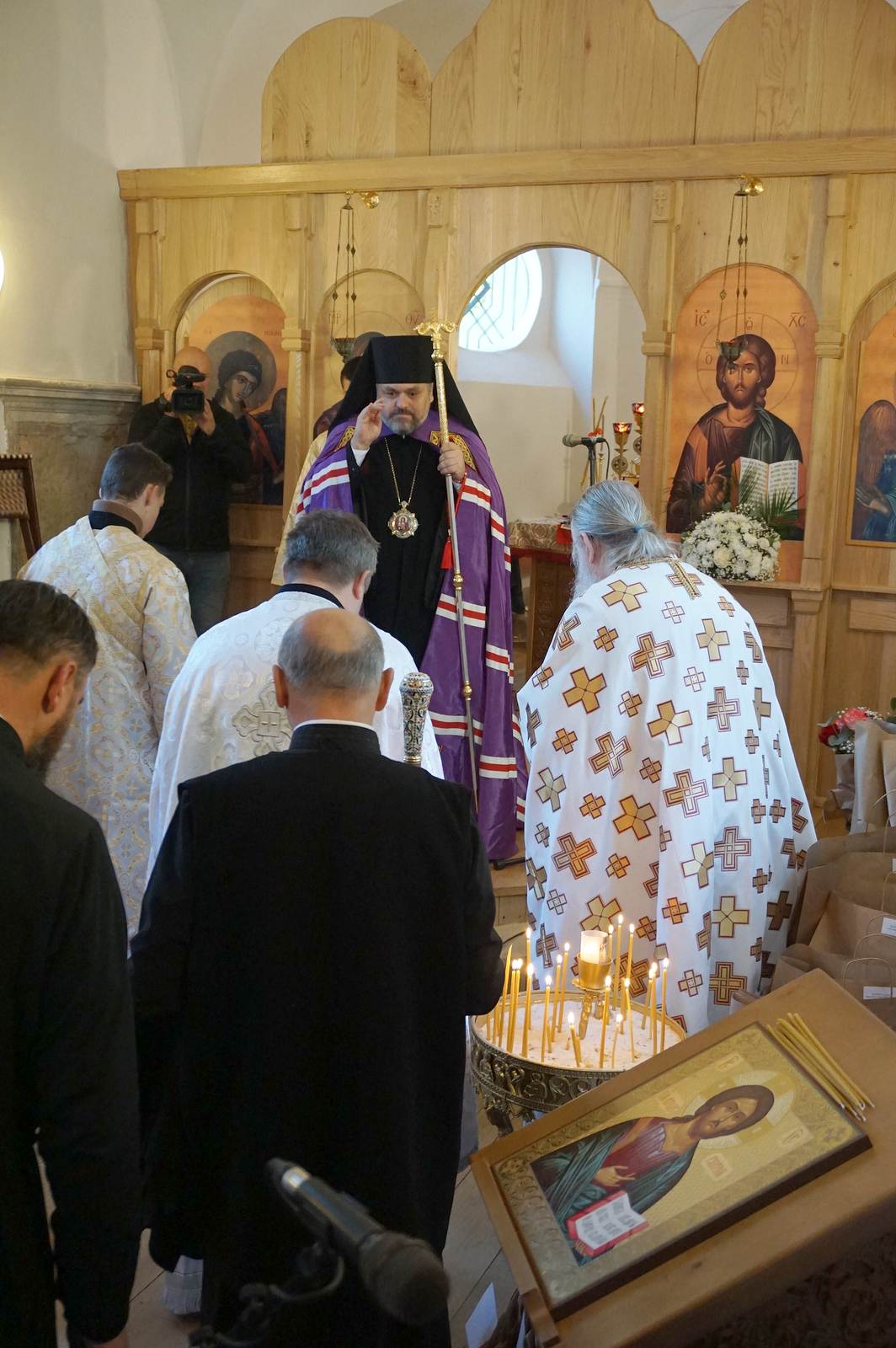 Uprostřed chrámu vladyka v modlitbě vzpomenul na svaté apoštoly, kteří: „nám v Duchu Svatém předali řád křtu čili rození synů Božích, ustanovili budování chrámů a službu oběti oltářní; kněžím uložili kánony a zákony, které i my hříšní dodržujeme, a tobě, Bohu věčnému se klaníme a prosíme tebe, milostivý Pane. Naplň slávou svou a blahodatí tento chrám, který byl zbudován k chválení tebe, a jeho oltář ukaž jako svou velesvatyni. Abychom i my, kteří před svatým prestolem této velesvatyně stojíme, jako před hrozivým trůnem tvého království, mohli s bázní a bez pohanění zde sloužiti tobě a vznášet modlitby za nás a veškerý lid tvůj.“