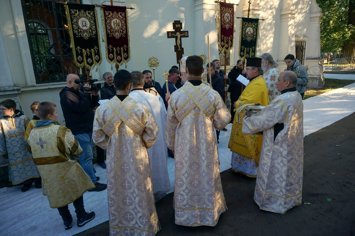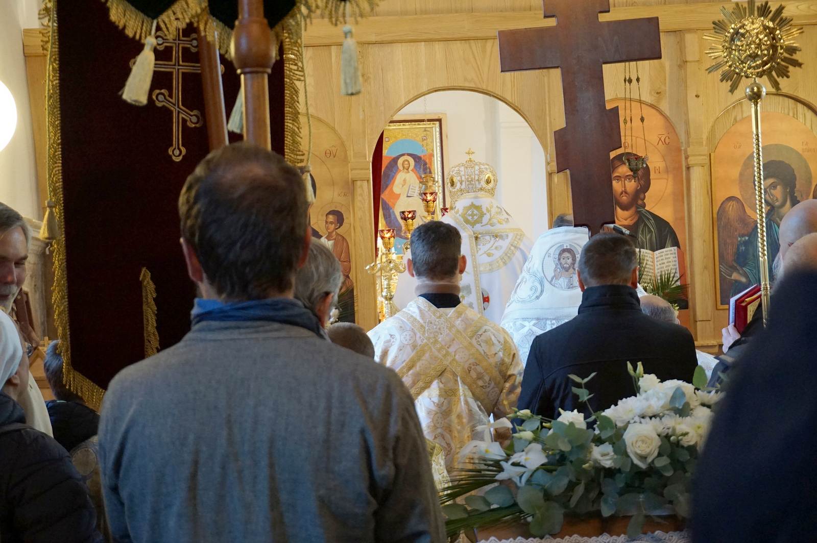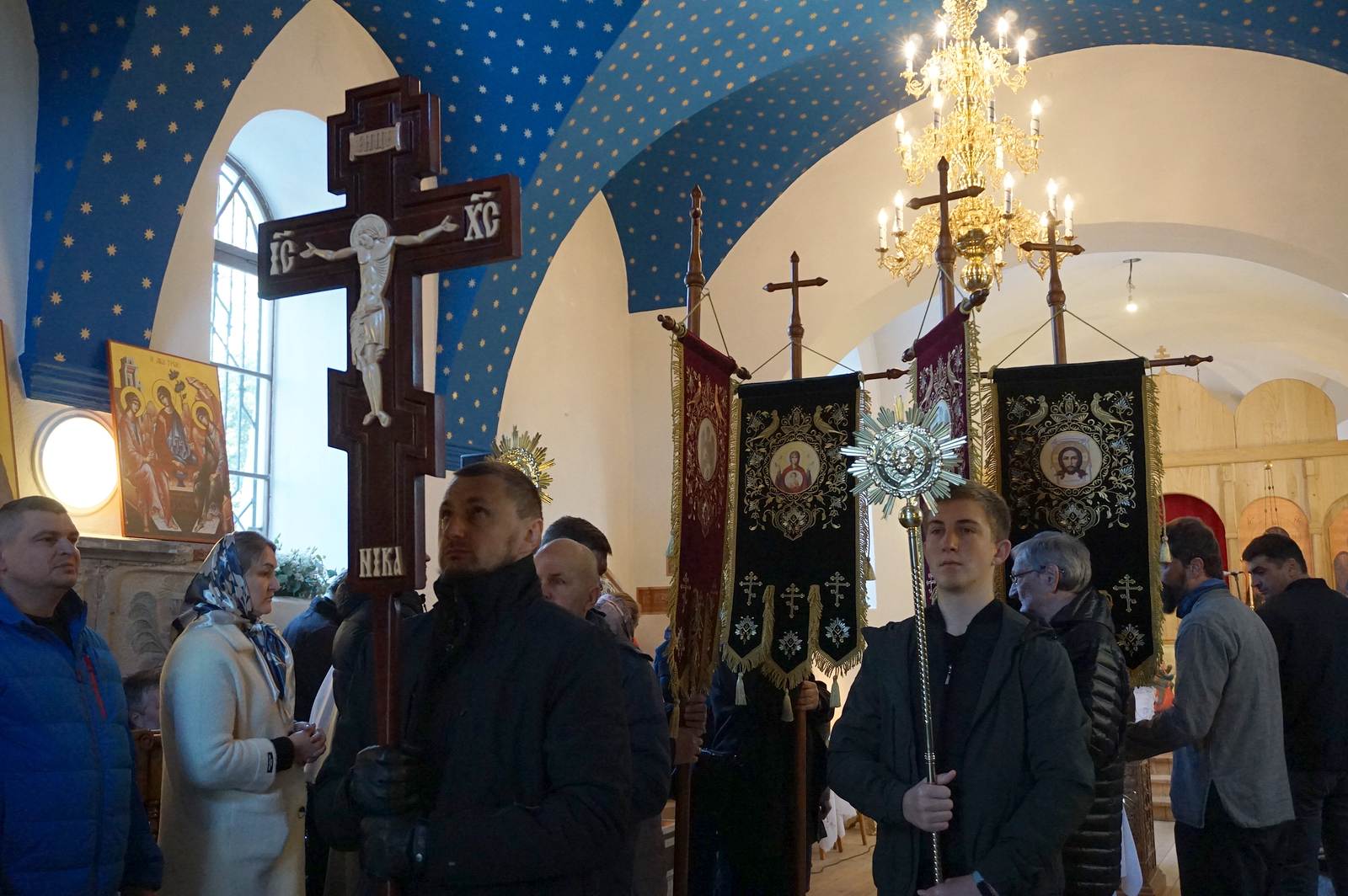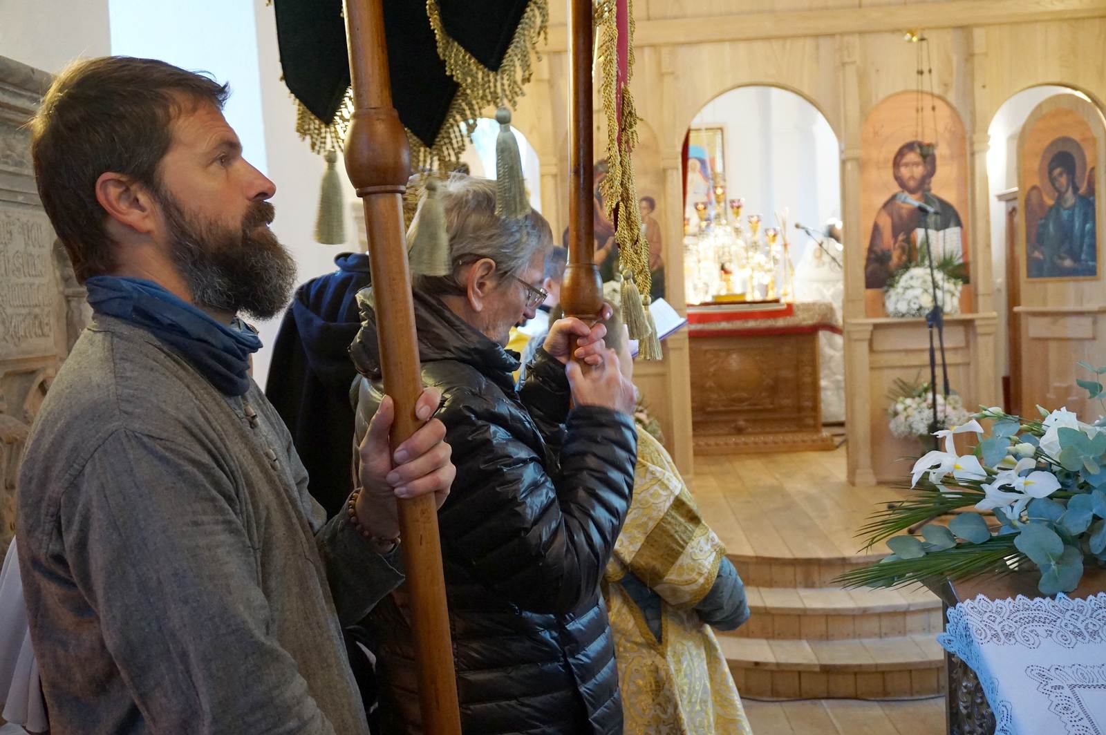 Ke konci archijerejské liturgie, naplněné duchovní krásou a pokojnou atmosférou, se konal průvod kolem chrámu spolu s čtením evangelií a skrápěním chrámových zdí svěcenou vodou.