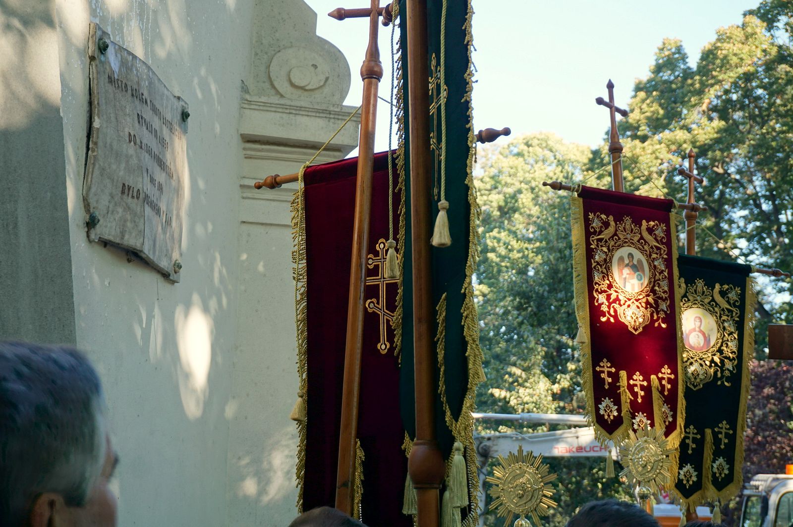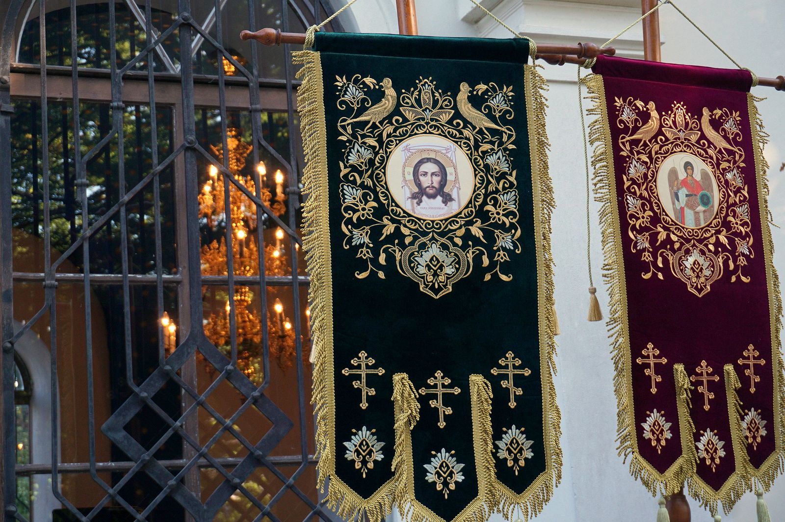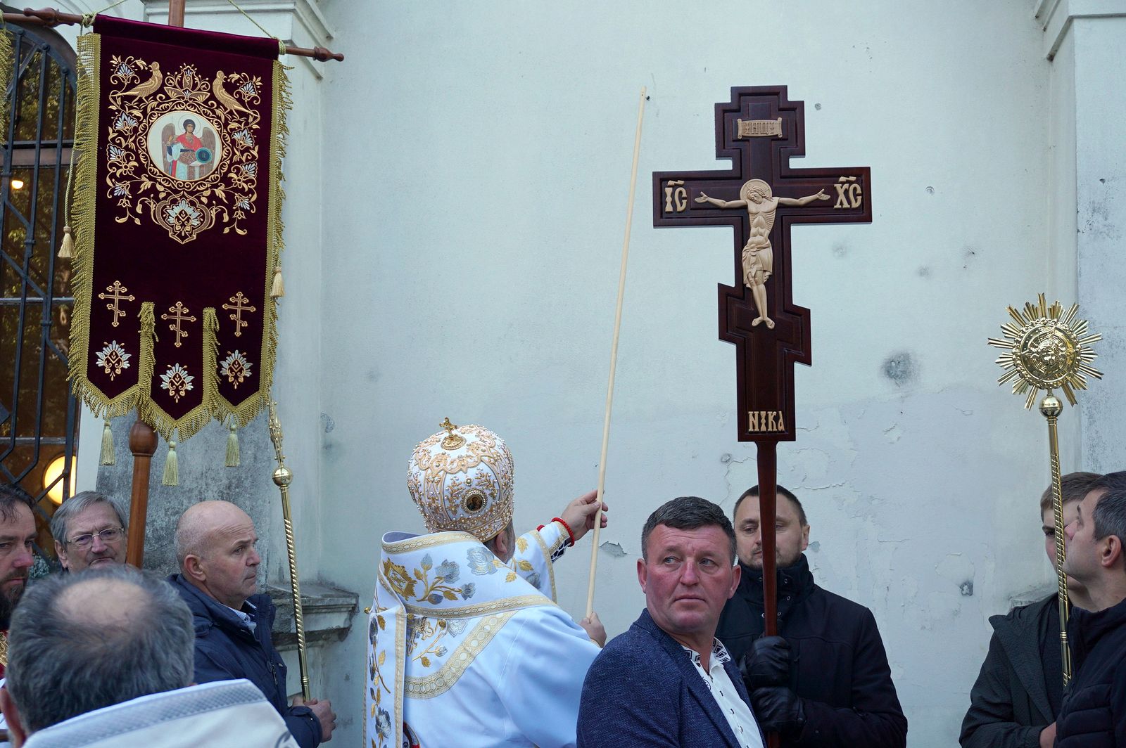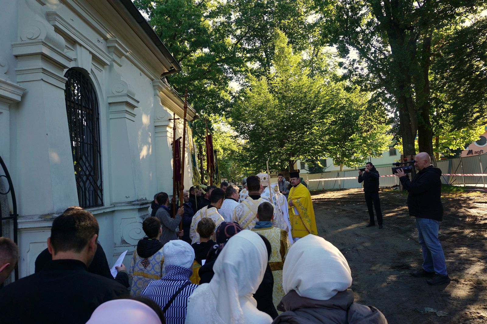 Ke konci archijerejské liturgie, naplněné duchovní krásou a pokojnou atmosférou, se konal průvod kolem chrámu spolu s čtením evangelií a skrápěním chrámových zdí svěcenou vodou.