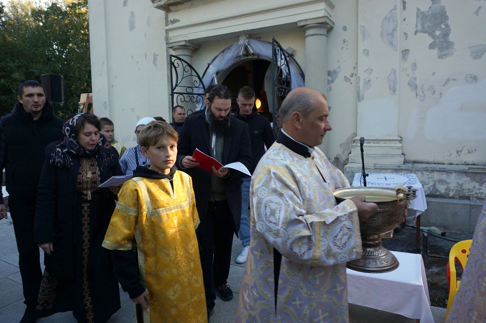 Všichni se shromáždili venku před chrámovými vraty, kde se četlo z Písma svatého – vladyka sám četl z 1. knihy Královské s modlitbou krále Šalomouna za chrám. Pak se četlo z evangelia o tom, jak se Pán Ježíš procházel v chrámě, v sloupoví Šalomounově. K tomu připojil vladyka modlitbu: „abychom nyní bez zahanbení vykonali posvěcení tohoto chrámu, který byl postaven ke chválení tvé slávy a k naší spáse“.