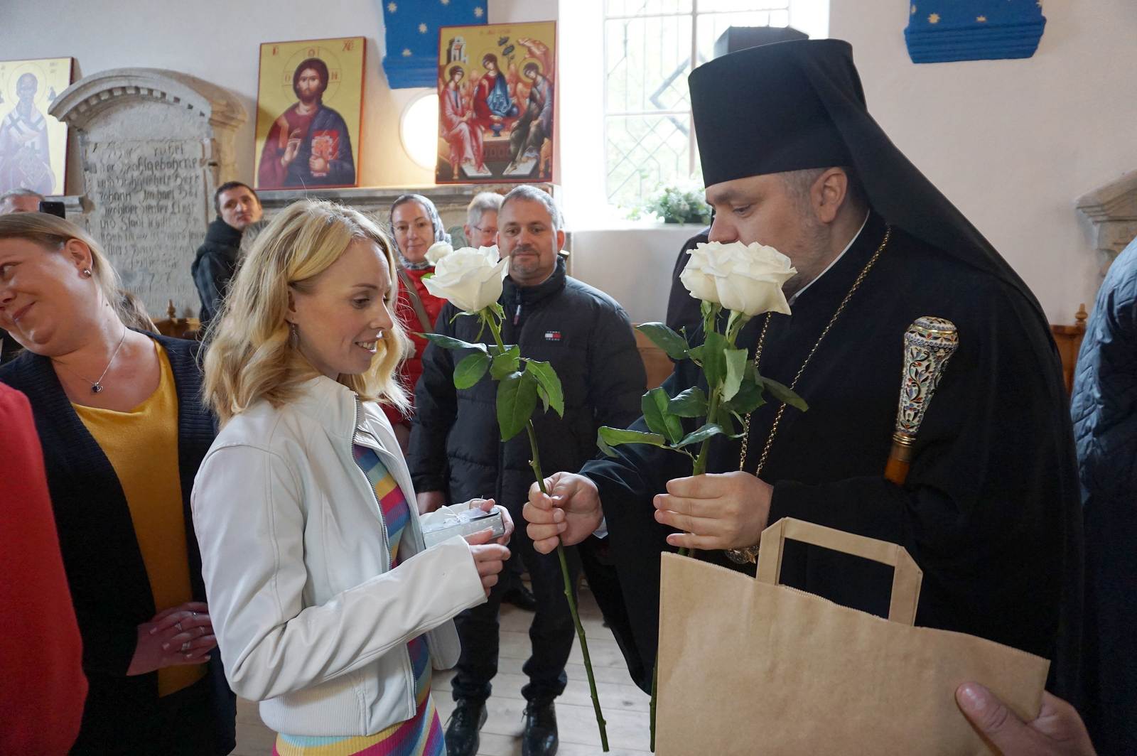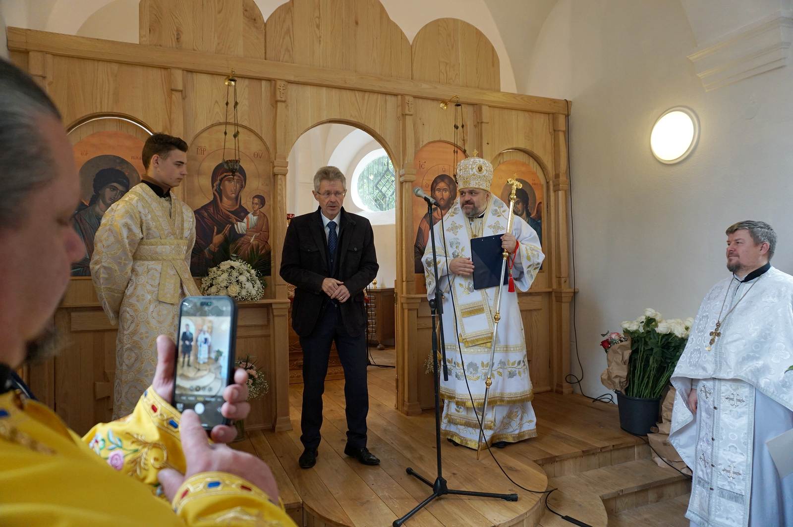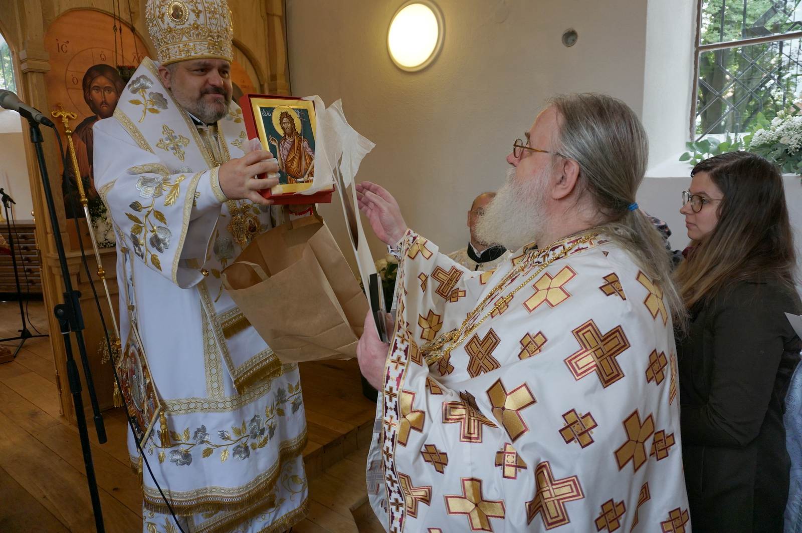 V průběhu obřadu a na závěr promlouval k přítomným vladyka i duchovní správce. Všichni jsme s úctou poděkovali věřícím za jejich námahu, dílo, dary, čas, modlitby a vše, čím jakkoliv přispěli ke zbudování tohoto chrámu. Je to svědectví jejich lásky k Bohu a potažmo lásky k Jeho Církvi, čili k pravoslaví. Vladyka připomněl výrok z evangelia o tom, že každý vlas na našich hlavách je spočítaný (Mat 10,30; Luk 12,7), tak na každého pamatuje Bůh, a o každém je v nebeských knihách zapsáno, co zde učinil pro svou spásu, pro Církev, pro spásu druhých lidí. Vše dojde své odměny. To jsou naše poklady, které si střádáme na nebi, jak to po nás Kristus Pán žádá. (Mat 6,19-21)