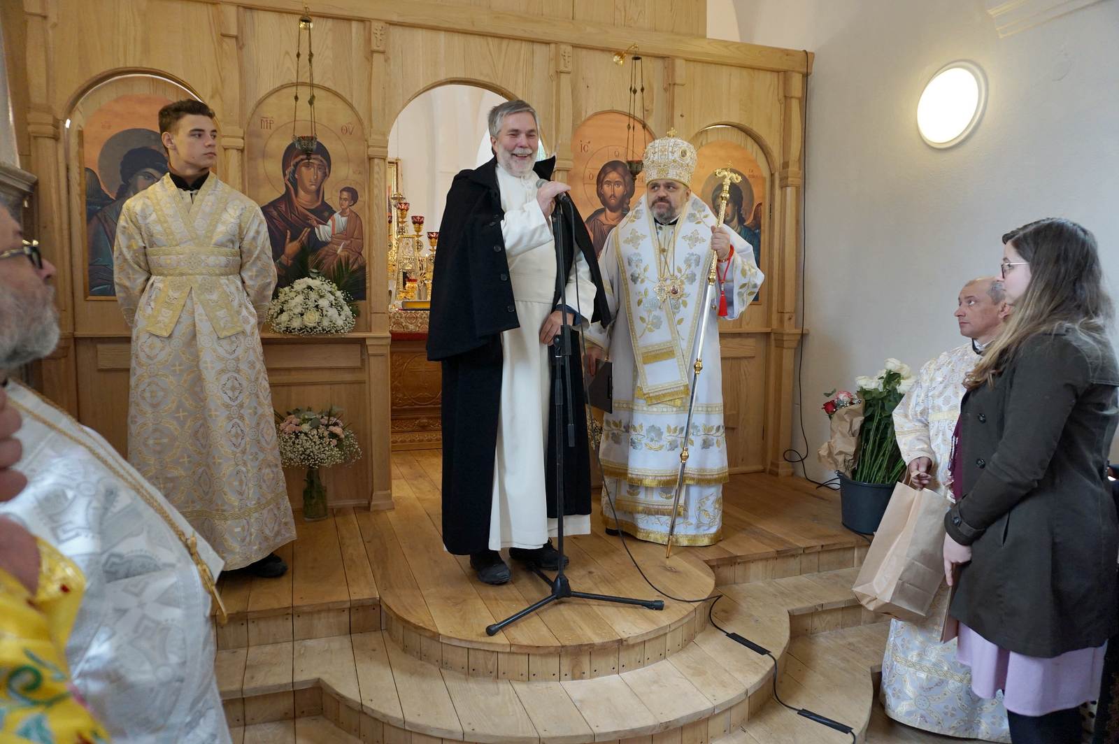Po proslovu vladyky vystoupil duchovní správce s krátkým zamyšlením nad právě končící událostí a s poděkováním vladykovi a duchovním z jiných farností v naší eparchii, kteří podnikli cestu, aby zde byli s námi. Zvláštní díky adresoval místnímu římsko-katolickému duchovnímu otci Marianu Huskovi, který má zvláštní zásluhy na tom, že tu v tento den jsme a světíme náš nový pravoslavný chrám. Dále poděkoval primátoru města Jihlavy panu Mgr. Petru Ryškovi, který oficiálně převzal záštitu nad dílem oprav a adaptací. To nám morálně pomáhalo při procházení tohoto procesu, ve kterém nám bylo Město i dalšími způsoby nápomocné.