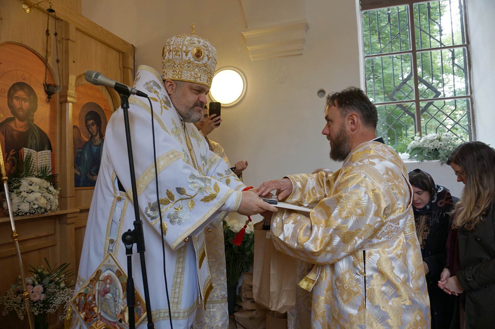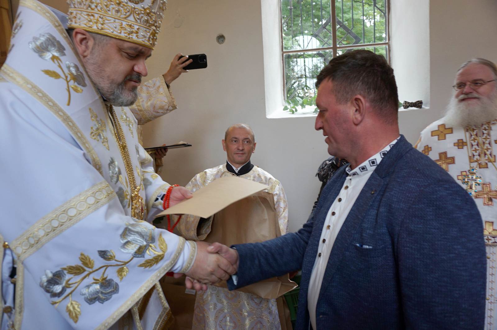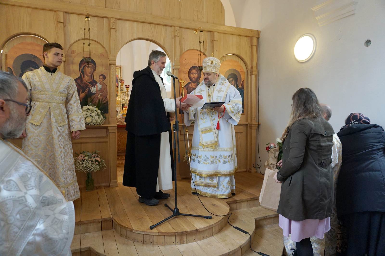 K věřícím se duchovní správce obrátil se slovy: »Byly to Vaše ruce, Váš čas, Vaše pomoc, práce a příspěvky i dary, které budovaly a adaptovaly tento chrám, aby ožil a abychom se zde mohli modlit. Některým z vás, kteří nejvíce pomohli, ještě bude na závěr předáno zvláštní poděkování. Ale nyní bych rád děkoval všem bez rozdílu. Všem, kteří jakoukoliv pomocí, či jakýmkoliv darem, třeba i malým příspěvkem a nebo modlitbou či sympatiemi pomáhali tomuto chrámu, aby se stal opět prostorem duchovního života a příbytkem svaté liturgie, kde se ke spáse podává svaté přijímání. Vám všem patří veliké díky od nás zástupců místní pravoslavné církve, a věřím, že Vás všechny za to odmění Hospodin v království svém. Ať vám všem i vašim rodinám slouží tento chrám k získávání věčné spásy, ať dobrotivý a milující Bůh vám všem daruje blažené přebývání v jeho náruči po všechny věky!«