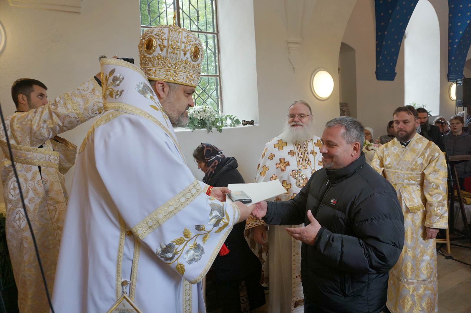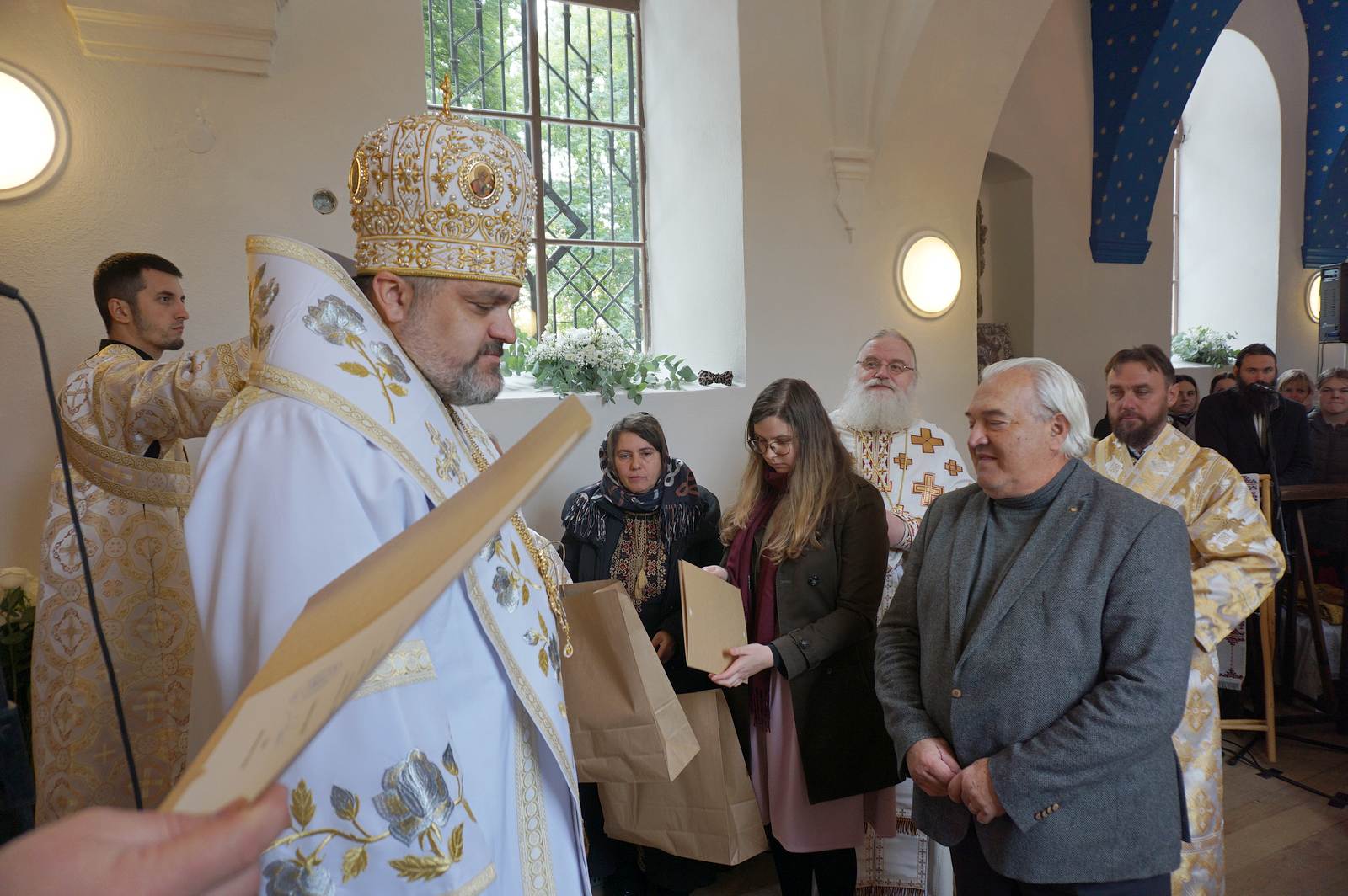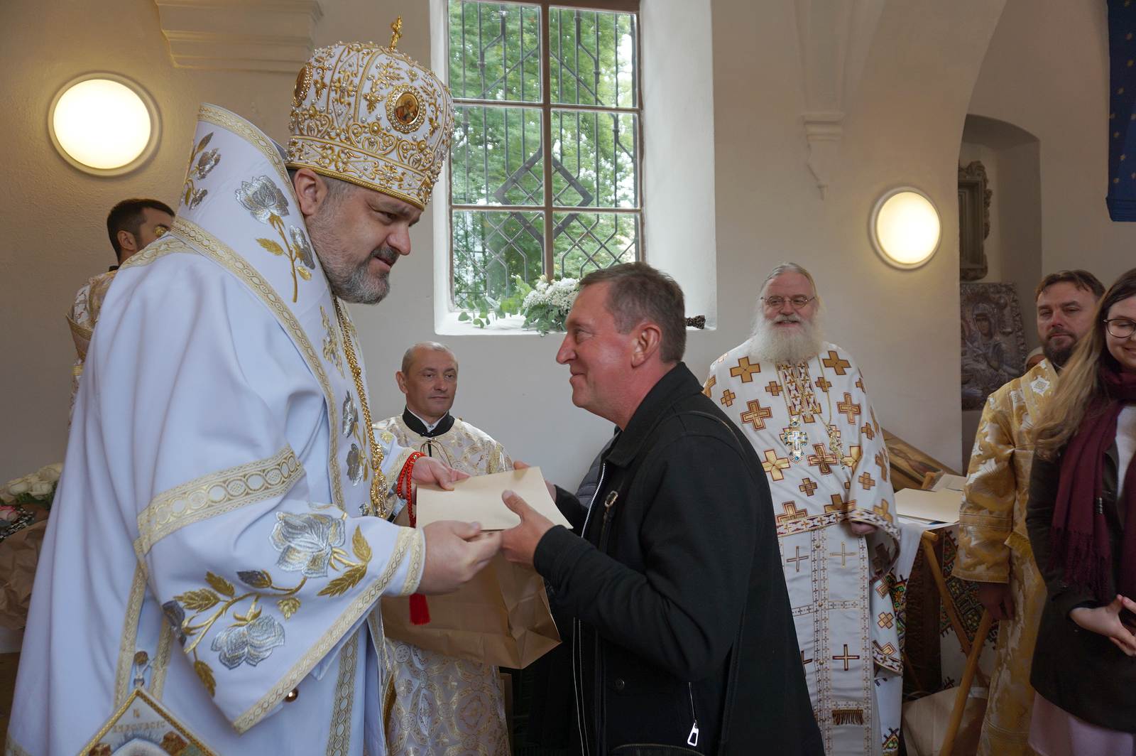 Vladyka ve své laskavosti obdaroval duchovního správce jihlavské farnosti náprsním křížem s ozdobami, a poté začala poslední část a závěr slavnosti – předávání vyznamenání a poděkování. Vladyka Izaiáš udělil církevní vyznamenání Řád sv. Gorazda III. stupně s dárkem pěti nejzasloužilejším příslušníkům jihlavské farnosti. Dále z jeho rukou převzalo listinu s poděkováním a dárek několik desítek přítomných, kteří také významně pomohli či dlouhodobě pomáhají životu farnosti. Na samotný závěr jsme předali vladykovi malou pozornost.