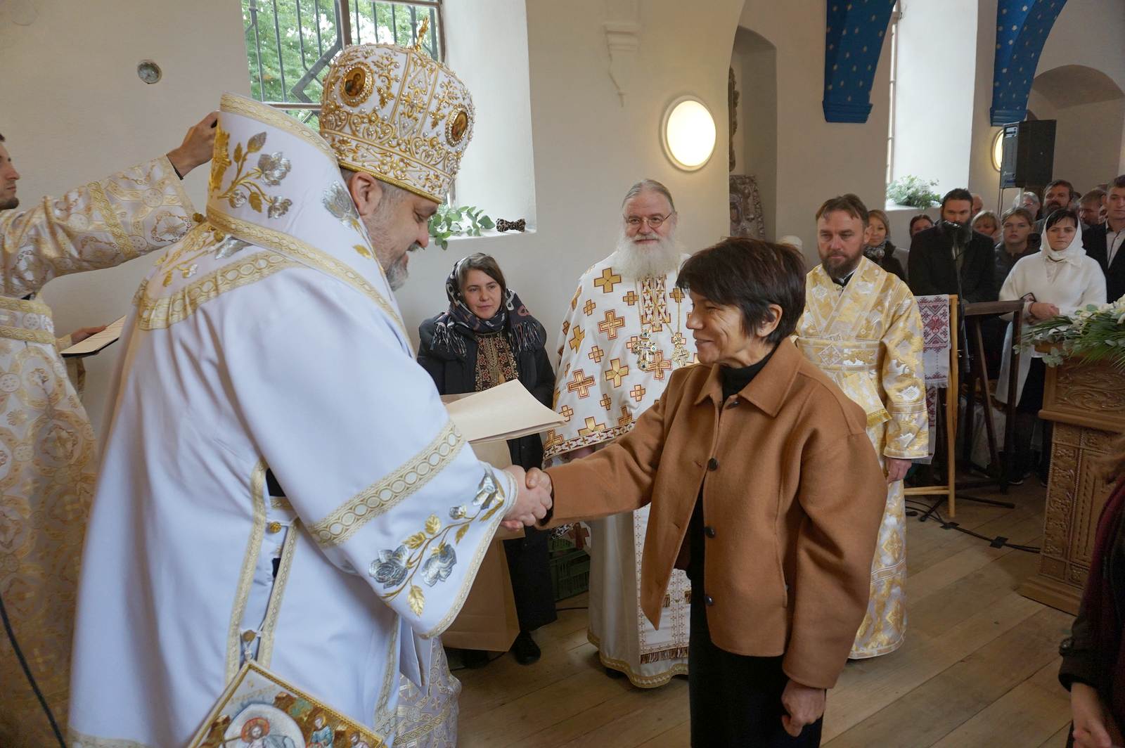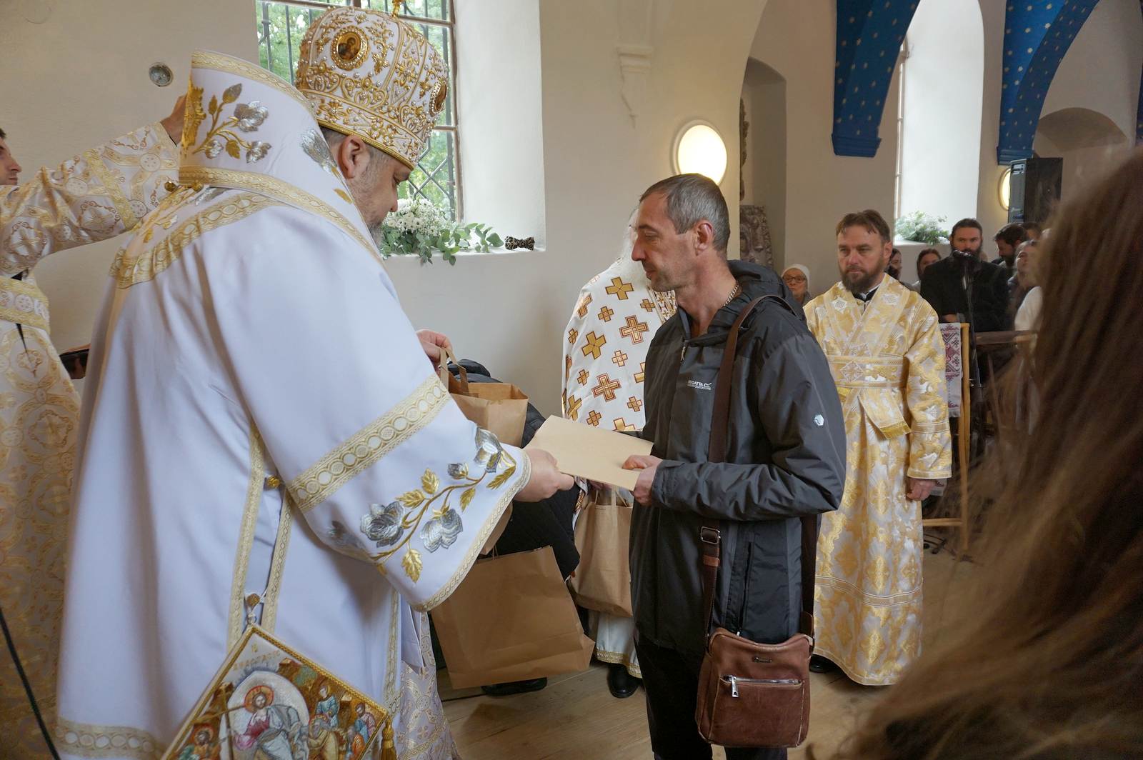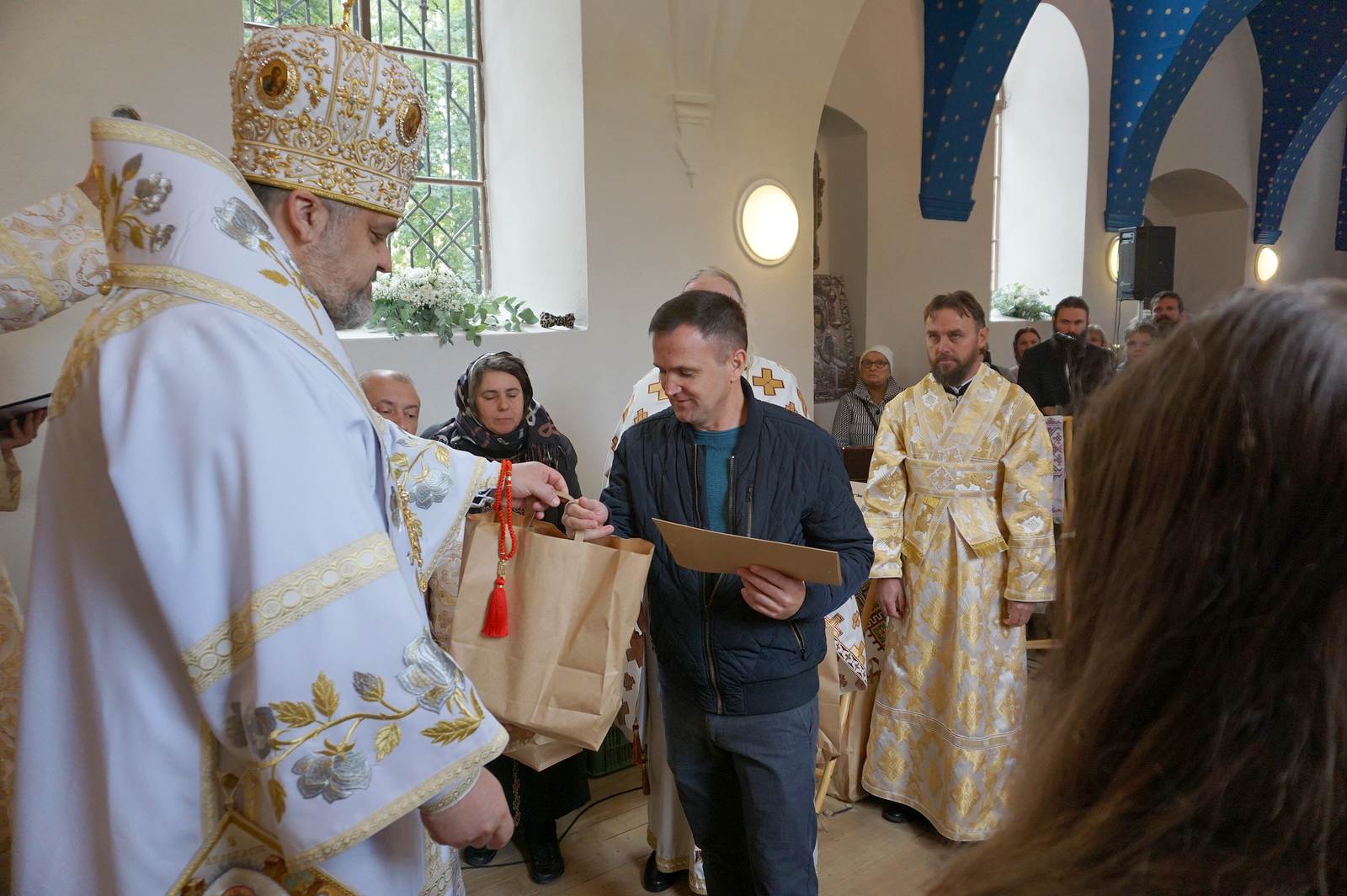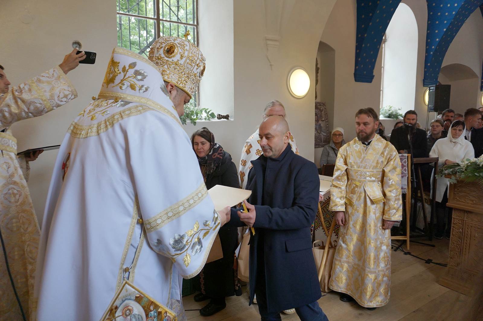 Vladyka ve své laskavosti obdaroval duchovního správce jihlavské farnosti náprsním křížem s ozdobami, a poté začala poslední část a závěr slavnosti – předávání vyznamenání a poděkování. Vladyka Izaiáš udělil církevní vyznamenání Řád sv. Gorazda III. stupně s dárkem pěti nejzasloužilejším příslušníkům jihlavské farnosti. Dále z jeho rukou převzalo listinu s poděkováním a dárek několik desítek přítomných, kteří také významně pomohli či dlouhodobě pomáhají životu farnosti. Na samotný závěr jsme předali vladykovi malou pozornost.