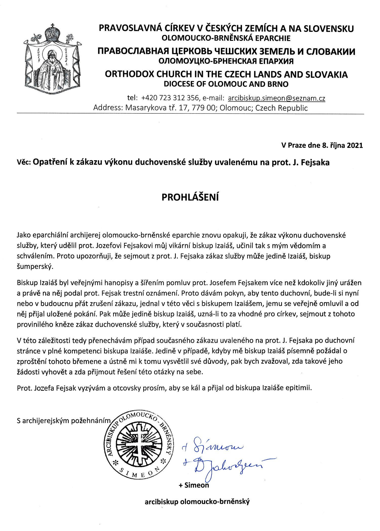 jako Váš biskup a pověřený vyslanec eparchiálního archijereje vladyky Simeona bych Vás rád těmito slovy pozval k pokání. Chci Vás tímto ujistit, že má otcovská náruč je Vám stále otevřena. Stále bych rád věřil, že vše, co bylo podniknuto z Vaší strany, je nějaké hrozné nedorozumění nebo pokušení. Pokud toho všeho litujete a toužíte se očistit od svých skutků, jsem stále připraven přijmout Vás a můžeme začít jednat o nápravě.