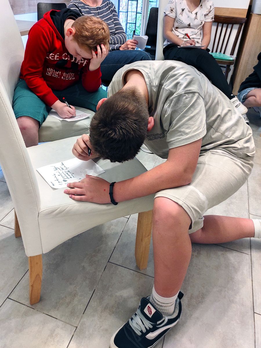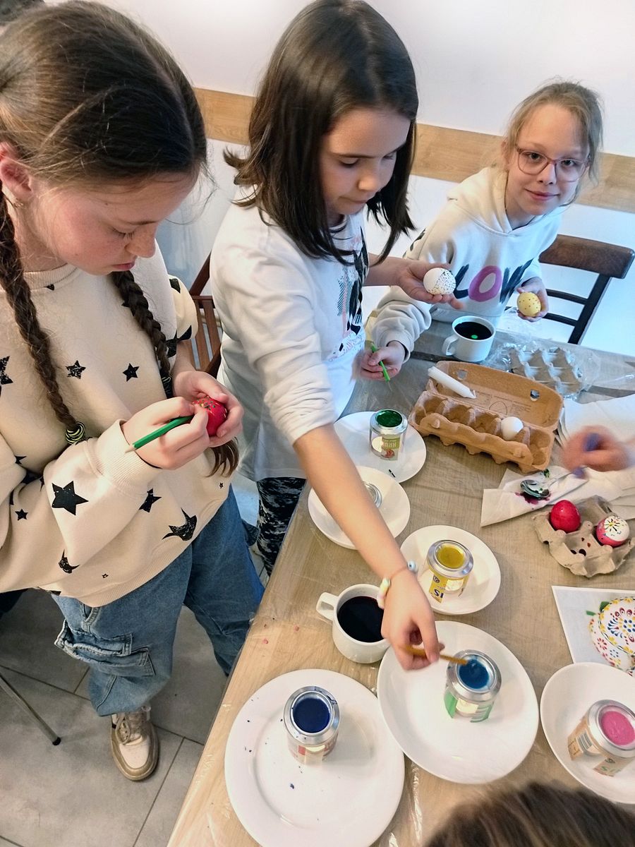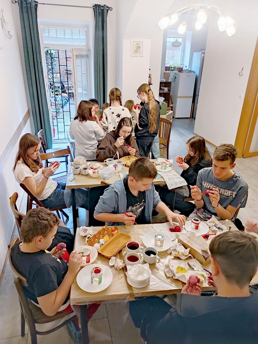 Na této hodině jsme s dětmi barvili velikonoční vajíčka. Po nabarvení jsme je zdobili roztavenými barevnými vosky. Během naší práce jsme si četli z dětské bible a o událostech Velké středy, Velkého čtvrtku a Velkého pátku. Vajíčka se povedla a děti se rozhodly, že několik ozdobených vajíček darují. A hned jsme to také udělali a zavezli je jedné z našich věřících, paní Slávě.