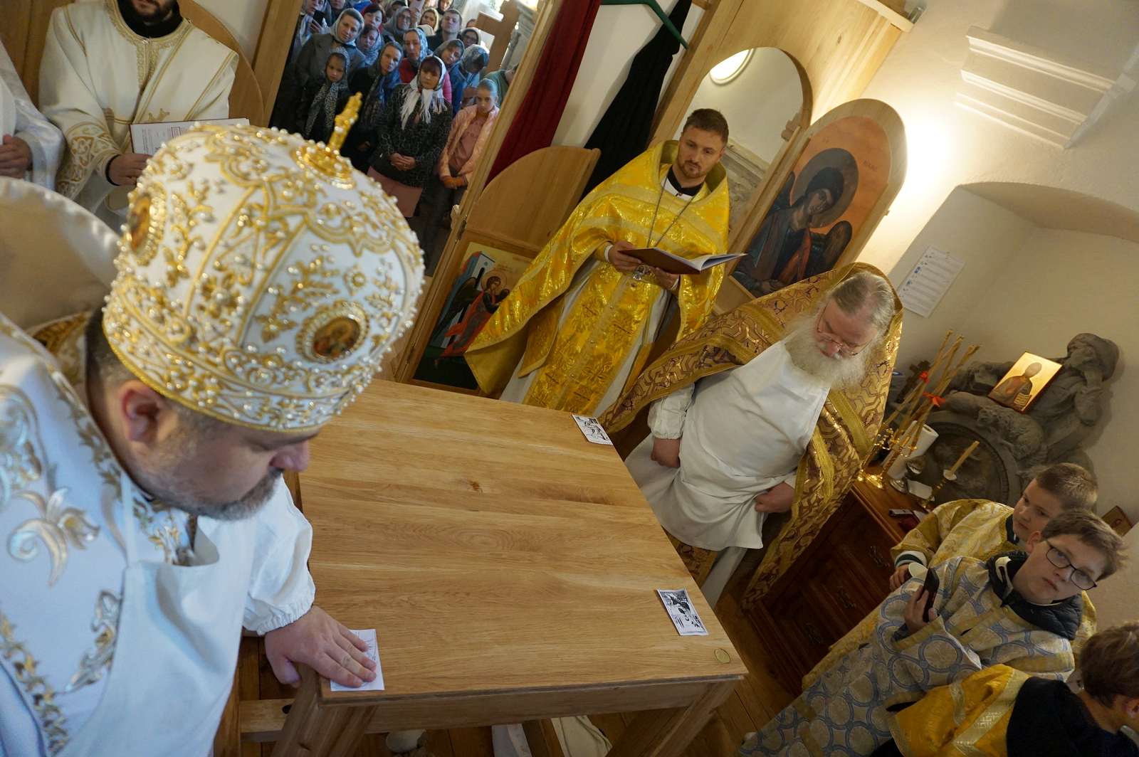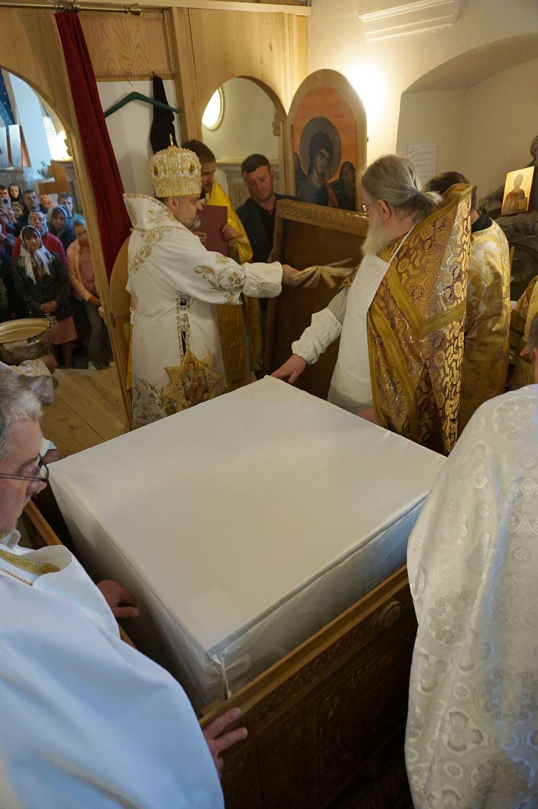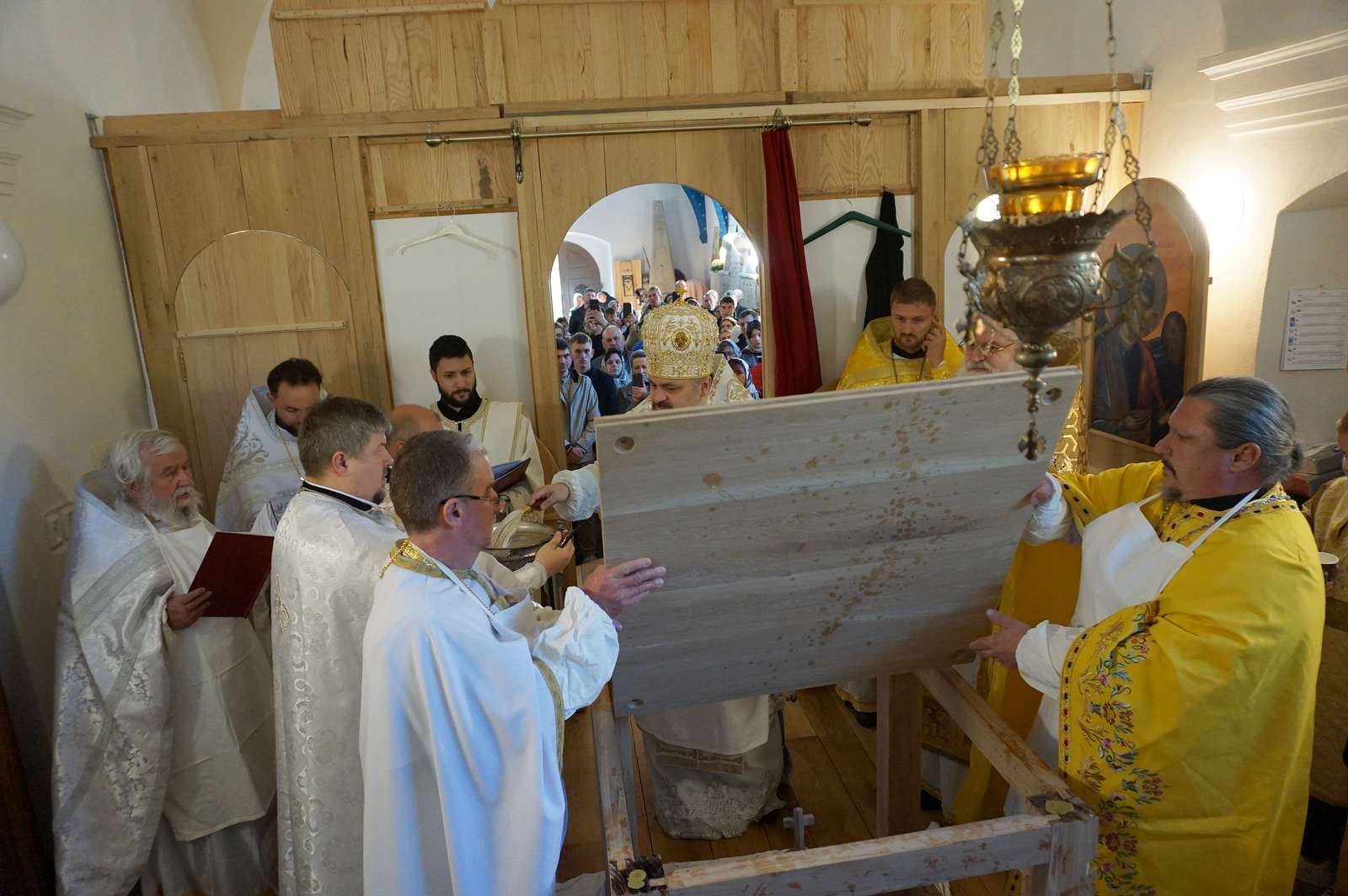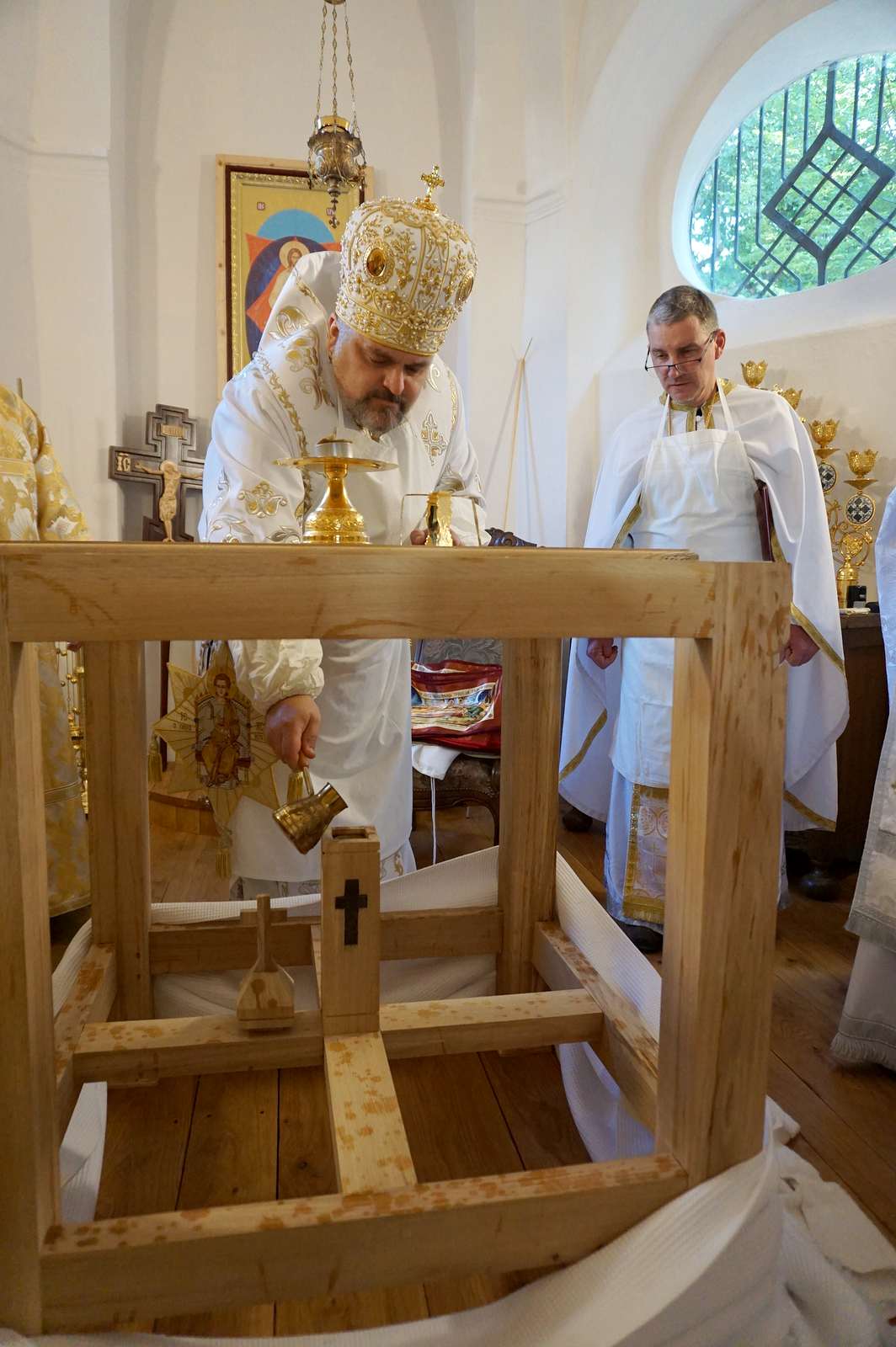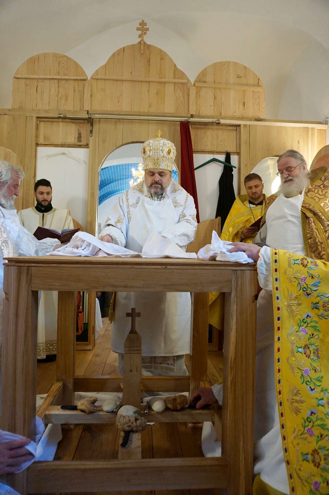 V pátek 3. října jsme se tedy dobrali k dlouho očekávané události – posvěcení oltářního stolu čili mensy, kde se přináší nekrvavá oběť. V 16 hod. přijel náš Přeosvícený vladyka Izaiáš, biskup olomoucko-brněnský, s doprovodem. Přijela už i řada duchovních. Obřad velkého svěcení mohl začít. Bohoslužebný řád probíhal podle řeckého způsobu, který je trochu delší než ruský a má jiné (myslím, že logičtější) pořadí jednotlivých součástí. S požehnáním vladyky jsme nechali oponu ikonostasu rozhrnutou a královskou bránu otevřenou. Věřící byli vyzváni, aby se shromáždili hned pod ambonem a zblízka mohli pozorovat celý postup obřadu.