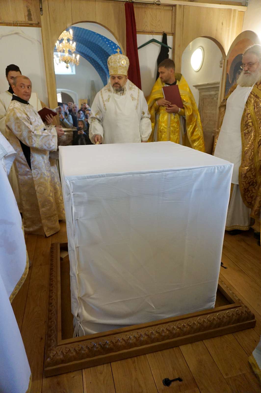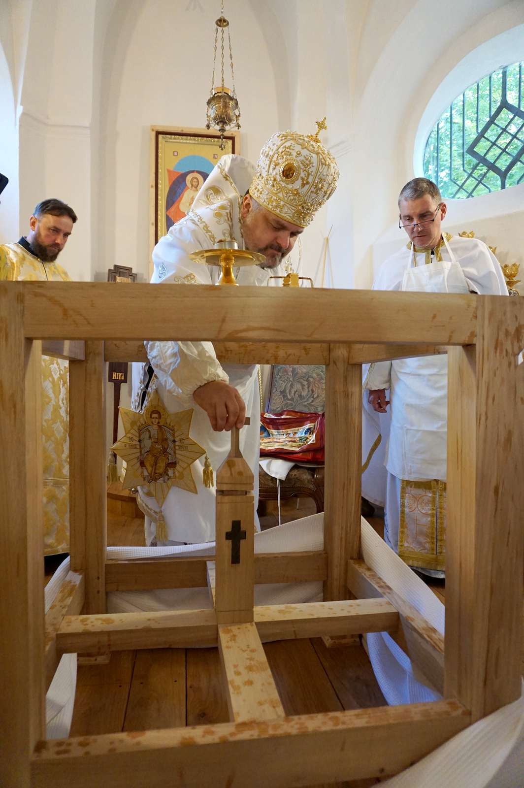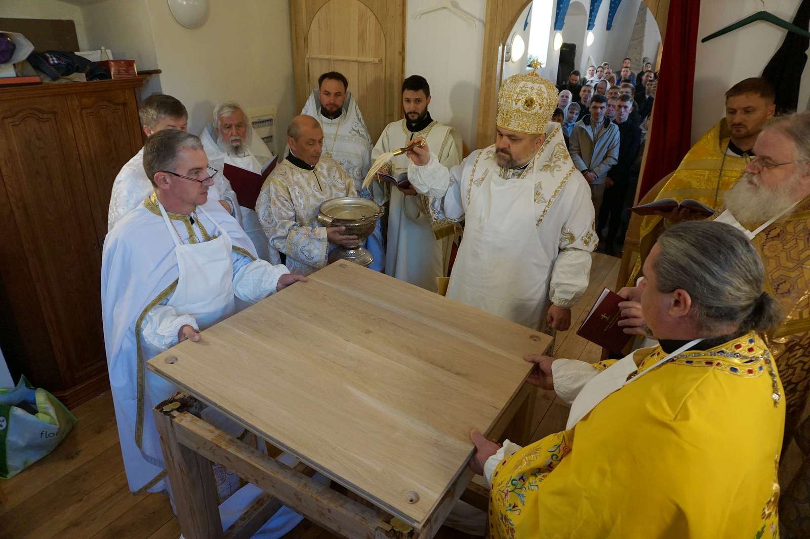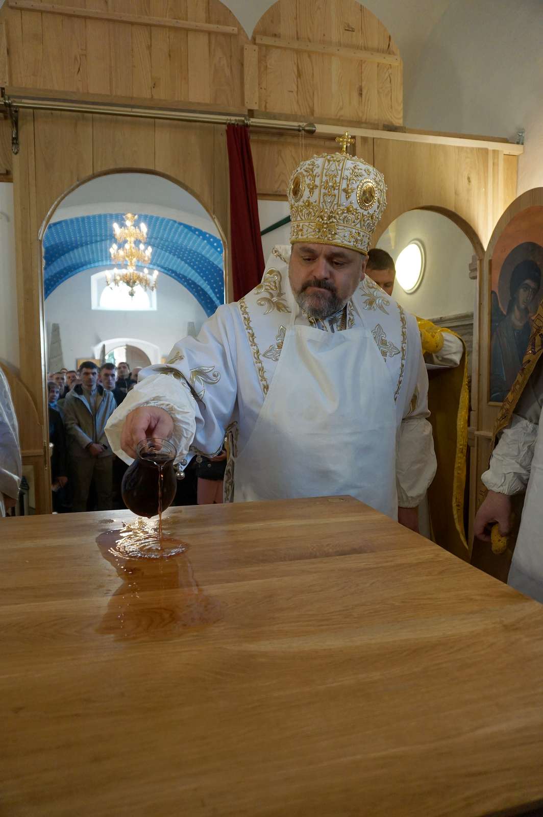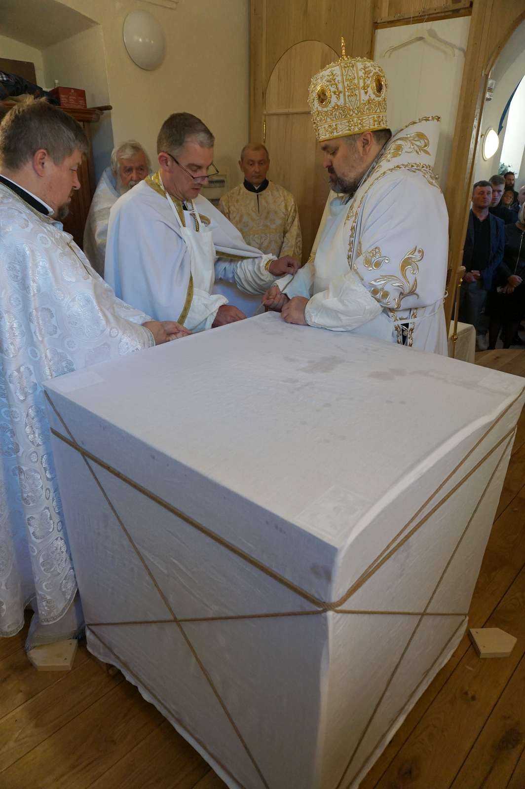 V pátek 3. října jsme se tedy dobrali k dlouho očekávané události – posvěcení oltářního stolu čili mensy, kde se přináší nekrvavá oběť. V 16 hod. přijel náš Přeosvícený vladyka Izaiáš, biskup olomoucko-brněnský, s doprovodem. Přijela už i řada duchovních. Obřad velkého svěcení mohl začít. Bohoslužebný řád probíhal podle řeckého způsobu, který je trochu delší než ruský a má jiné (myslím, že logičtější) pořadí jednotlivých součástí. S požehnáním vladyky jsme nechali oponu ikonostasu rozhrnutou a královskou bránu otevřenou. Věřící byli vyzváni, aby se shromáždili hned pod ambonem a zblízka mohli pozorovat celý postup obřadu.