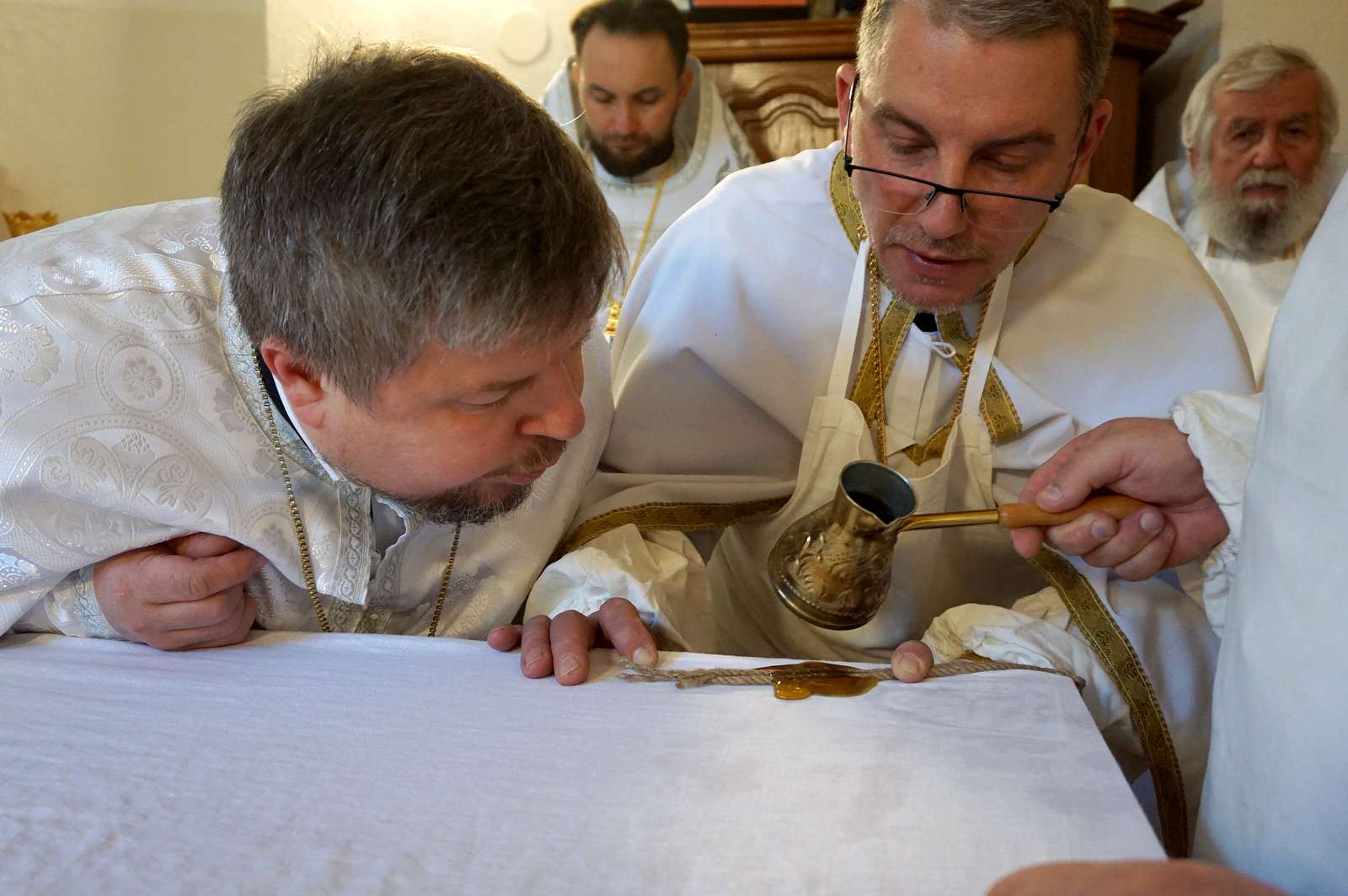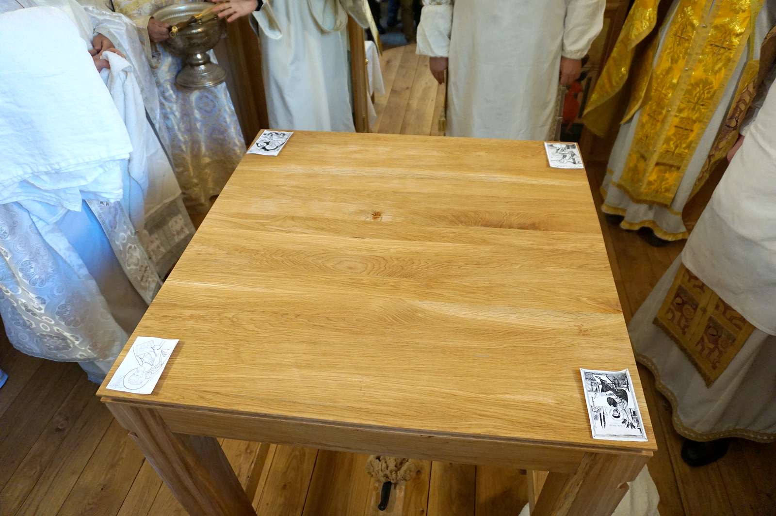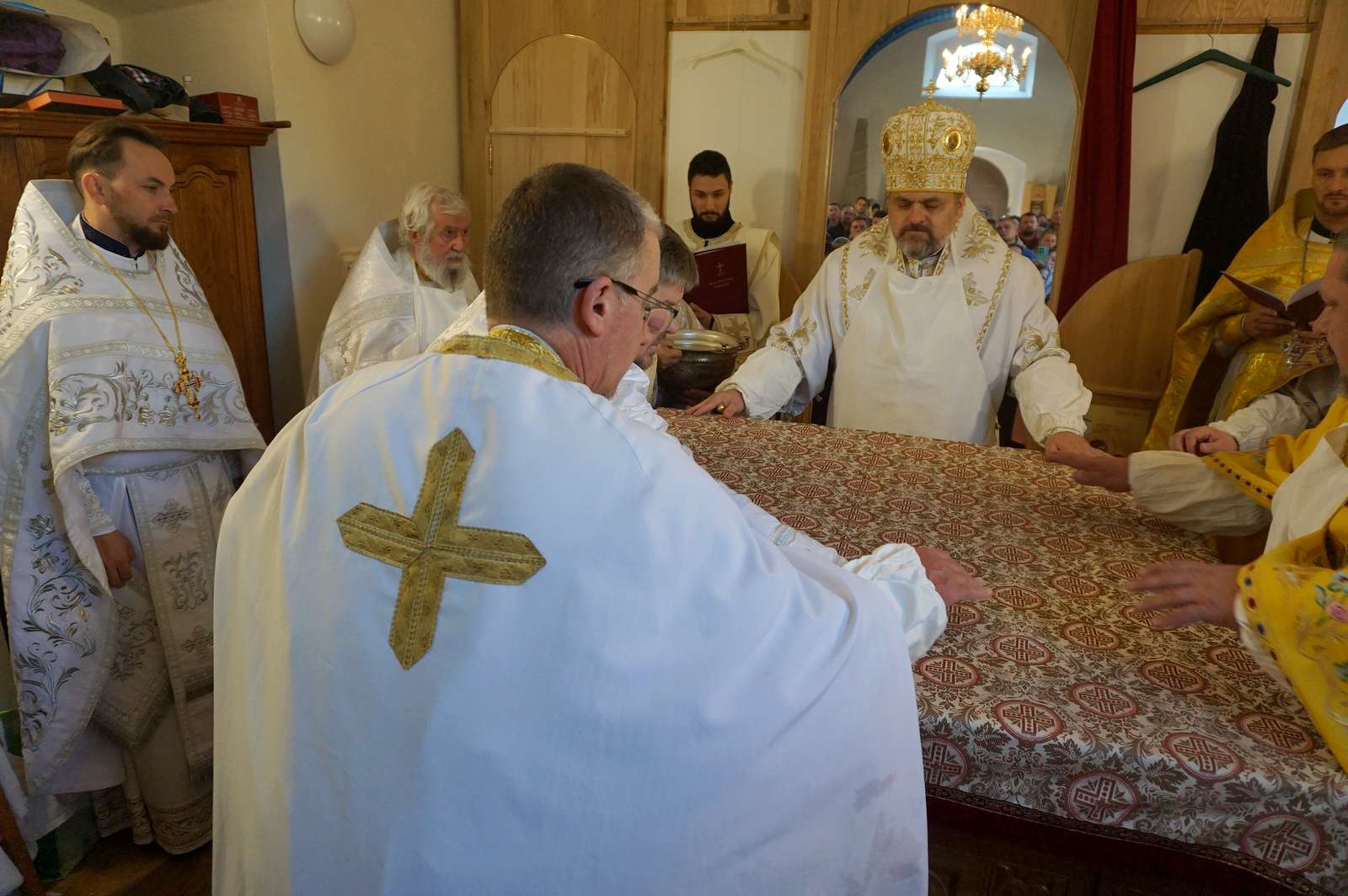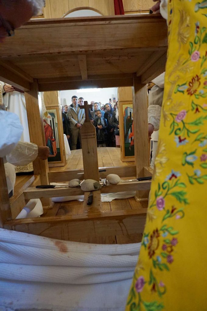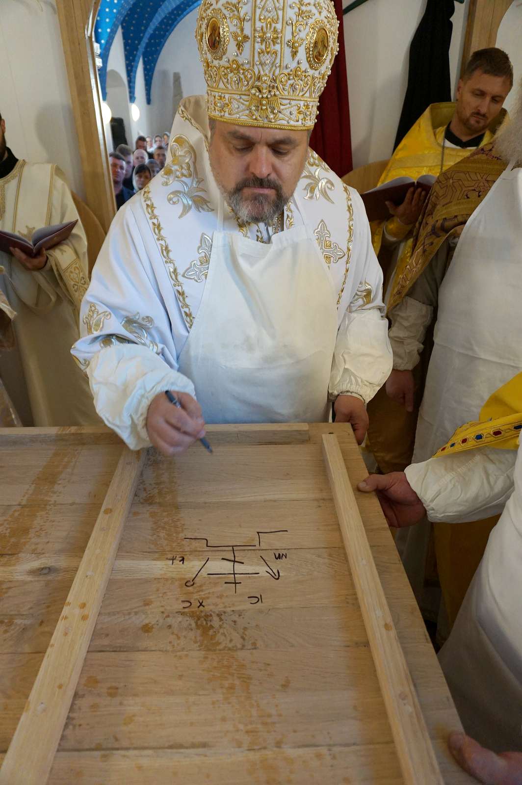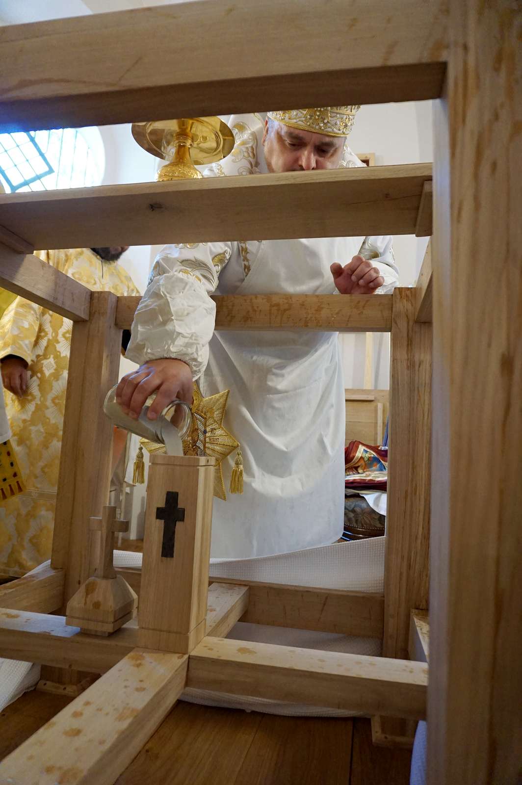 V pátek 3. října jsme se tedy dobrali k dlouho očekávané události – posvěcení oltářního stolu čili mensy, kde se přináší nekrvavá oběť. V 16 hod. přijel náš Přeosvícený vladyka Izaiáš, biskup olomoucko-brněnský, s doprovodem. Přijela už i řada duchovních. Obřad velkého svěcení mohl začít. Bohoslužebný řád probíhal podle řeckého způsobu, který je trochu delší než ruský a má jiné (myslím, že logičtější) pořadí jednotlivých součástí. S požehnáním vladyky jsme nechali oponu ikonostasu rozhrnutou a královskou bránu otevřenou. Věřící byli vyzváni, aby se shromáždili hned pod ambonem a zblízka mohli pozorovat celý postup obřadu.
