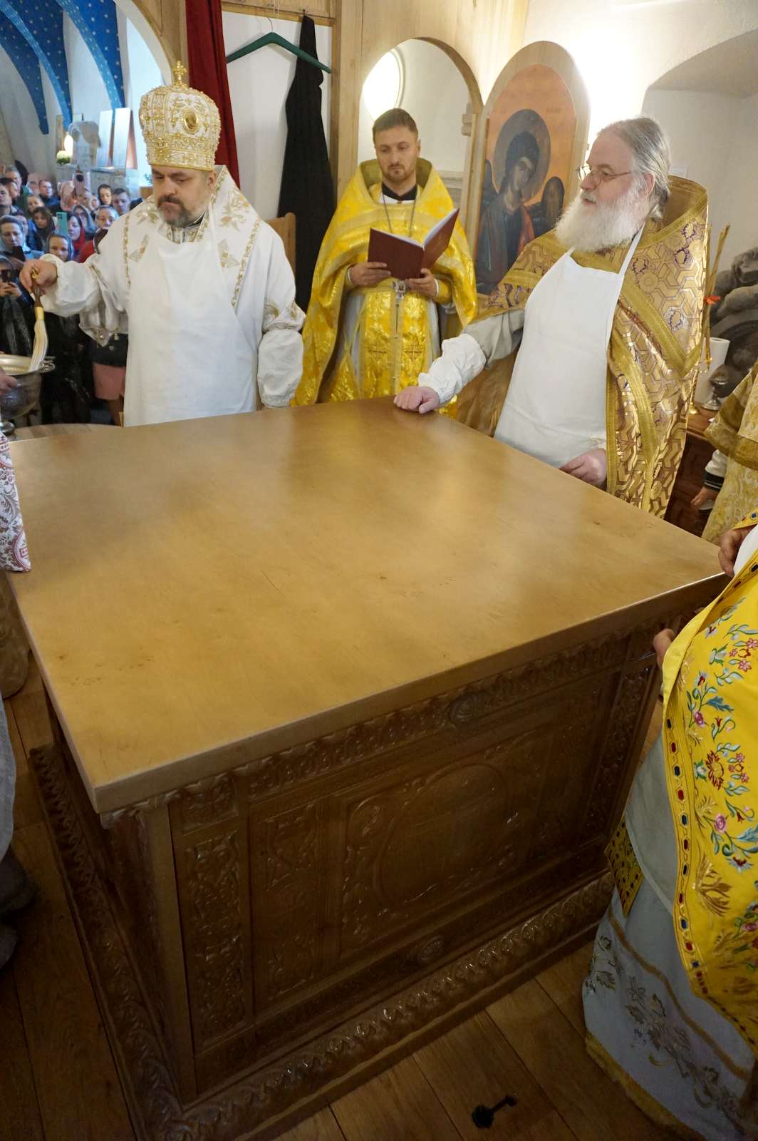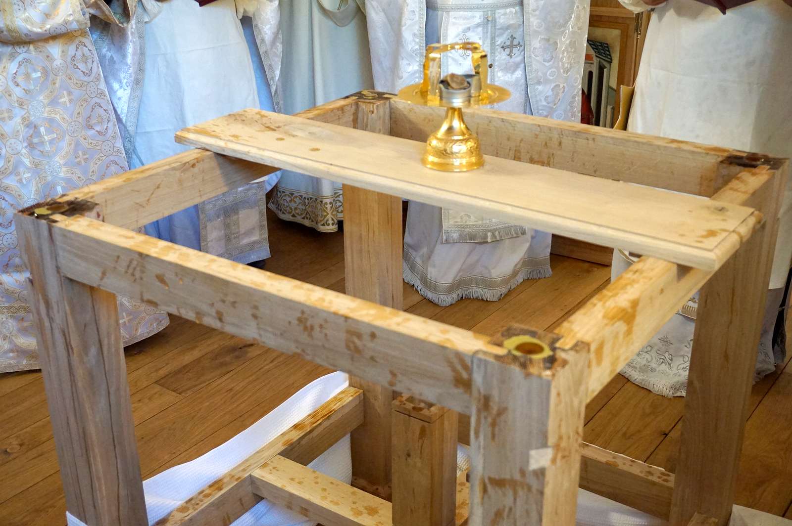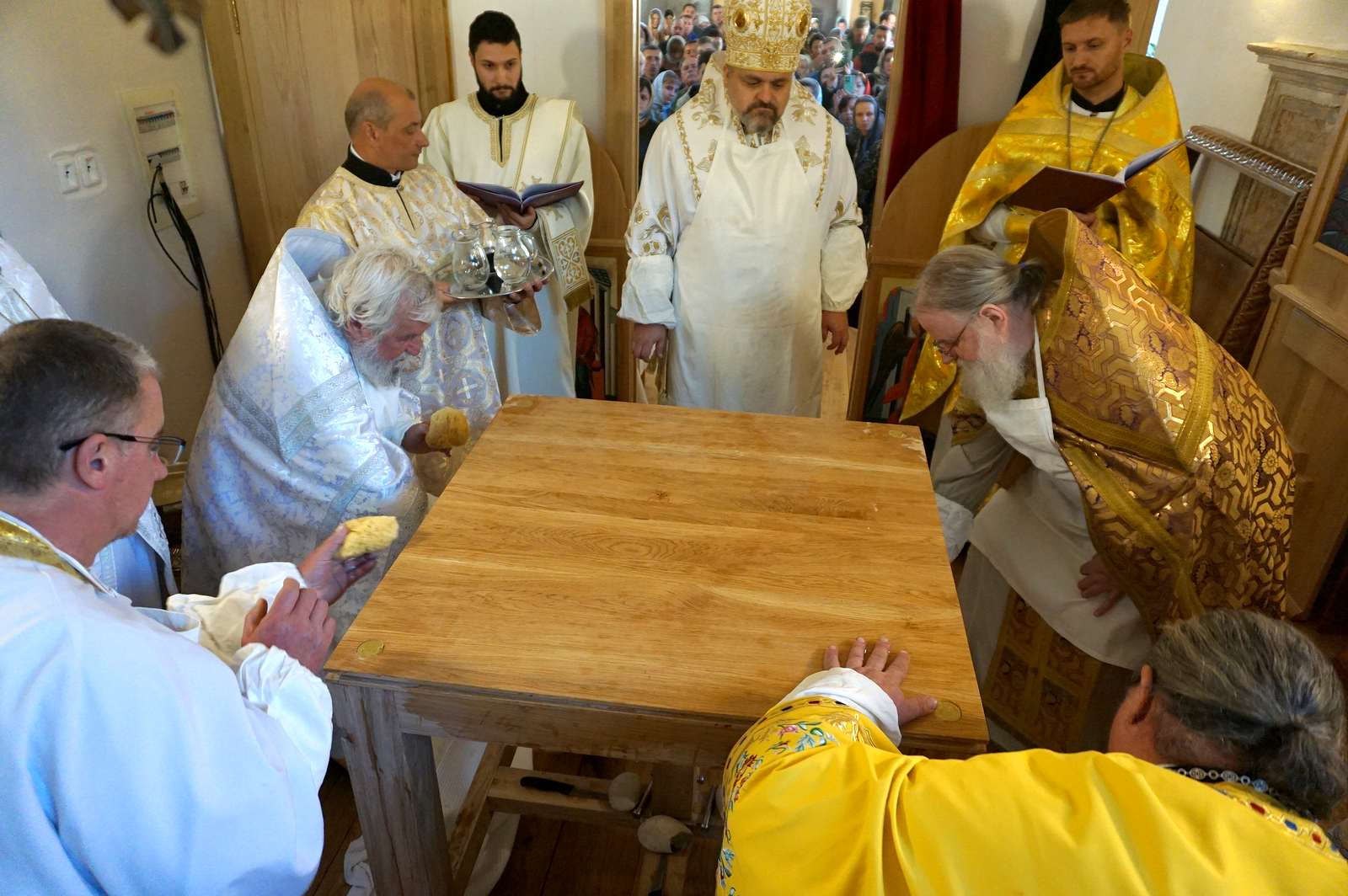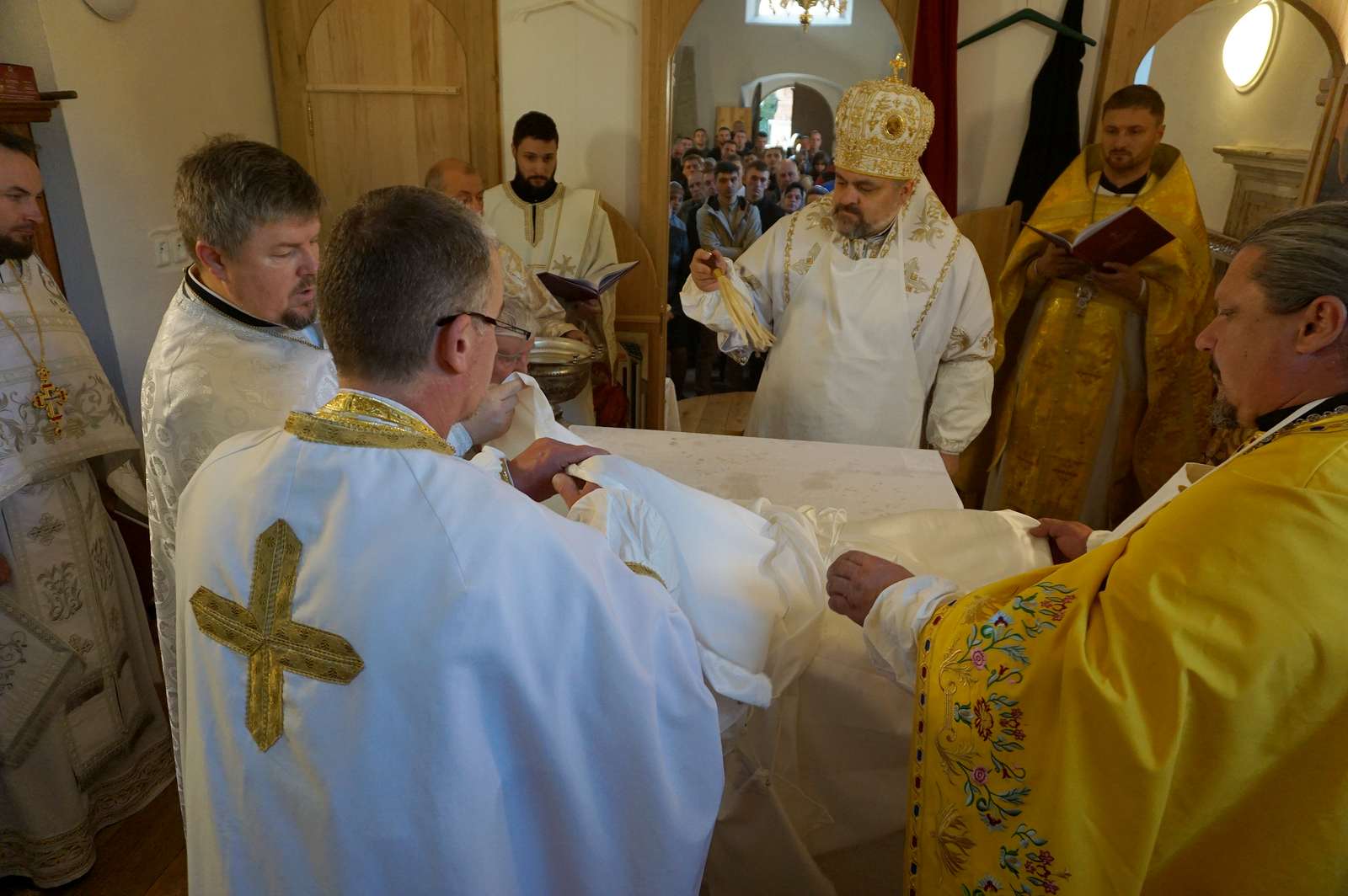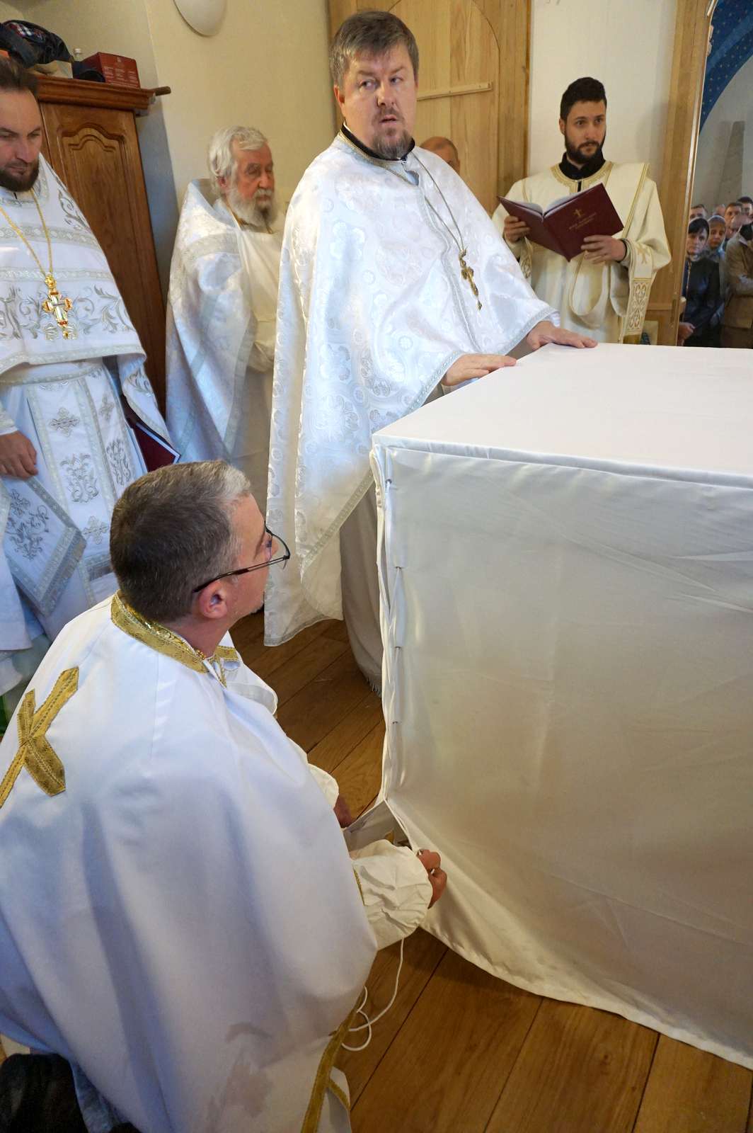V pátek 3. října jsme se tedy dobrali k dlouho očekávané události – posvěcení oltářního stolu čili mensy, kde se přináší nekrvavá oběť. V 16 hod. přijel náš Přeosvícený vladyka Izaiáš, biskup olomoucko-brněnský, s doprovodem. Přijela už i řada duchovních. Obřad velkého svěcení mohl začít. Bohoslužebný řád probíhal podle řeckého způsobu, který je trochu delší než ruský a má jiné (myslím, že logičtější) pořadí jednotlivých součástí. S požehnáním vladyky jsme nechali oponu ikonostasu rozhrnutou a královskou bránu otevřenou. Věřící byli vyzváni, aby se shromáždili hned pod ambonem a zblízka mohli pozorovat celý postup obřadu.
