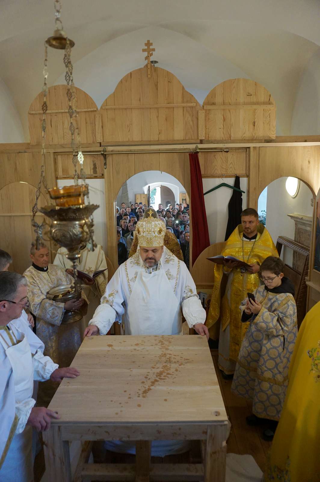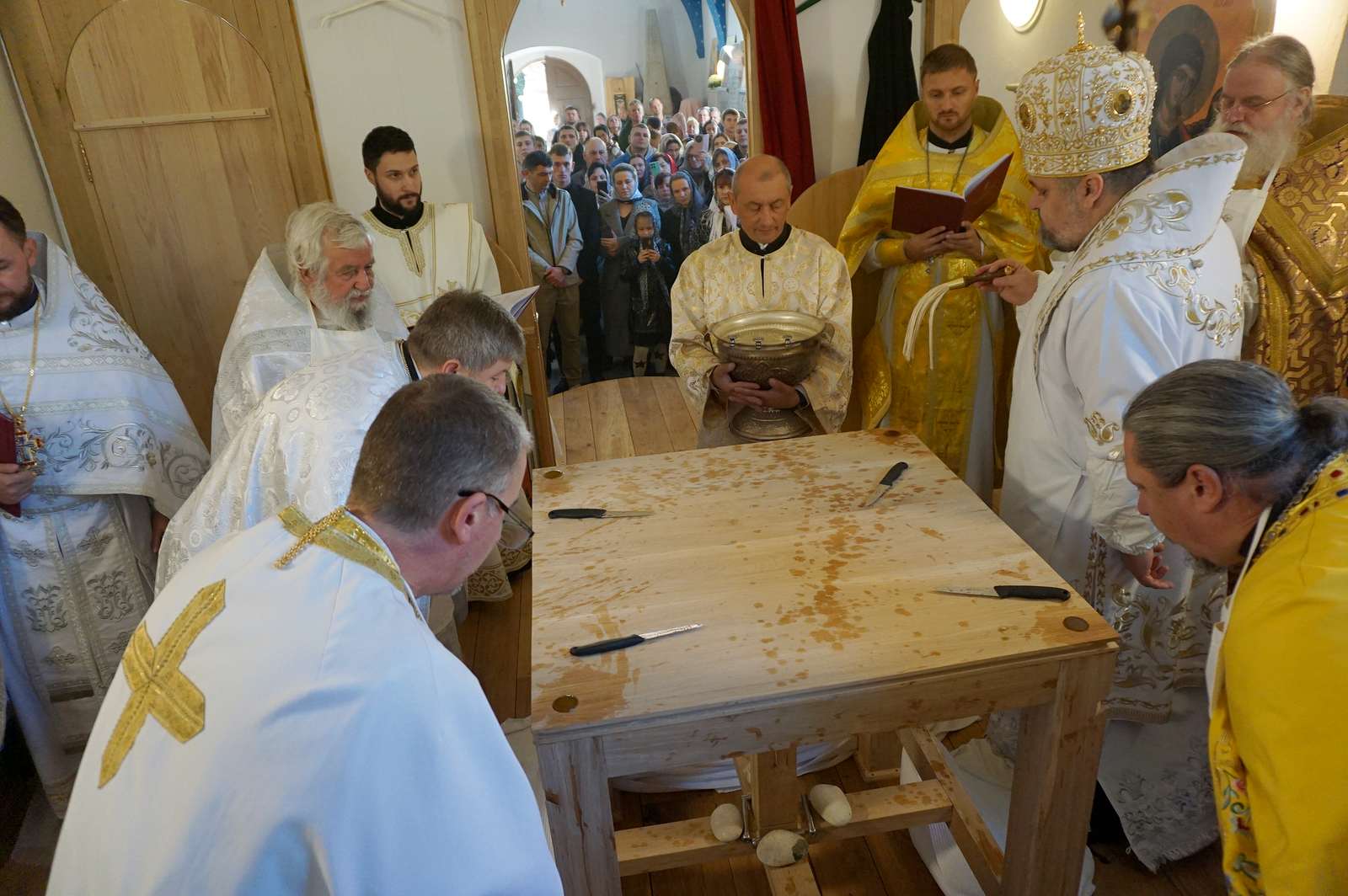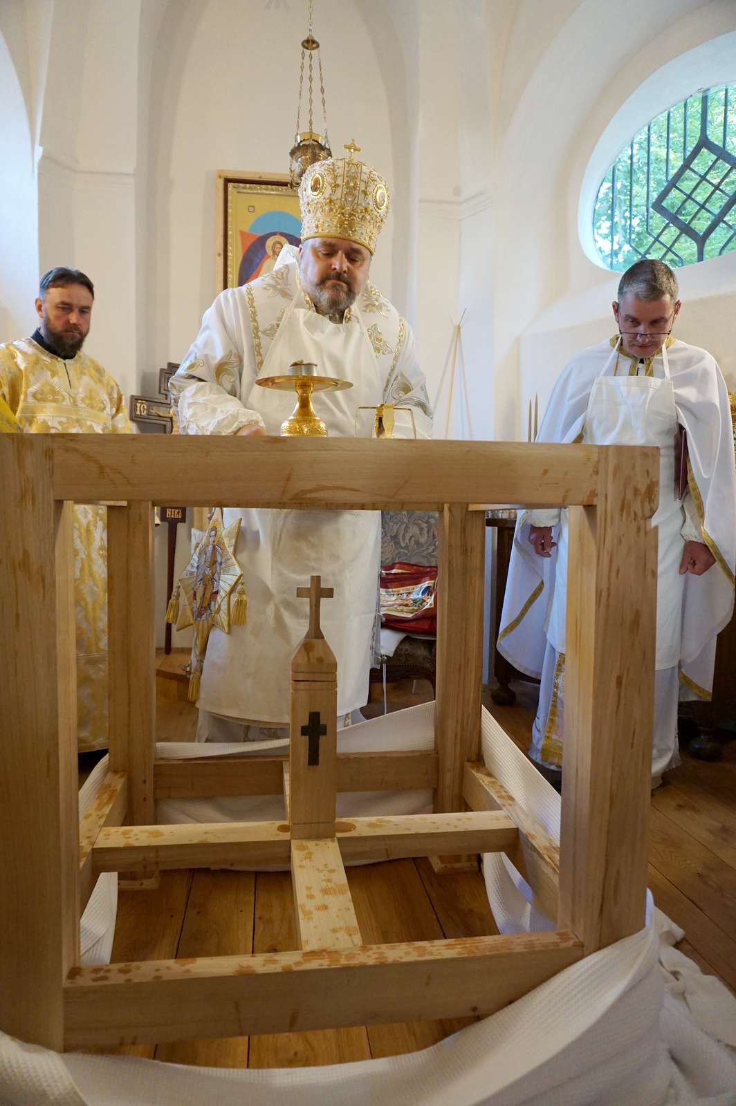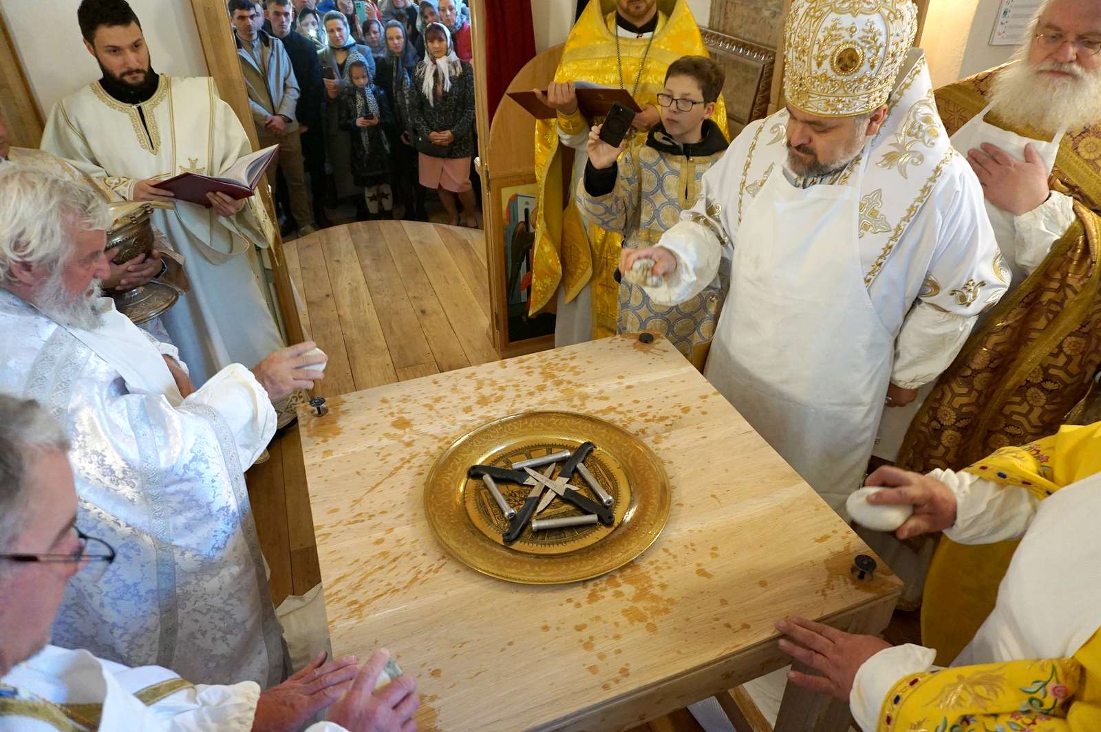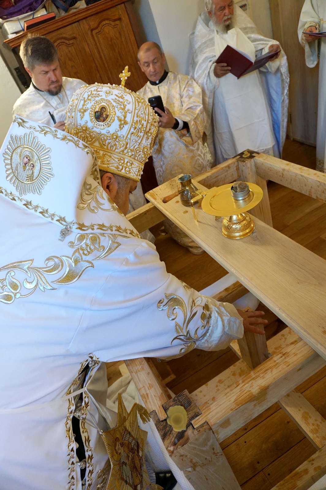 V pátek 3. října jsme se tedy dobrali k dlouho očekávané události – posvěcení oltářního stolu čili mensy, kde se přináší nekrvavá oběť. V 16 hod. přijel náš Přeosvícený vladyka Izaiáš, biskup olomoucko-brněnský, s doprovodem. Přijela už i řada duchovních. Obřad velkého svěcení mohl začít. Bohoslužebný řád probíhal podle řeckého způsobu, který je trochu delší než ruský a má jiné (myslím, že logičtější) pořadí jednotlivých součástí. S požehnáním vladyky jsme nechali oponu ikonostasu rozhrnutou a královskou bránu otevřenou. Věřící byli vyzváni, aby se shromáždili hned pod ambonem a zblízka mohli pozorovat celý postup obřadu.
