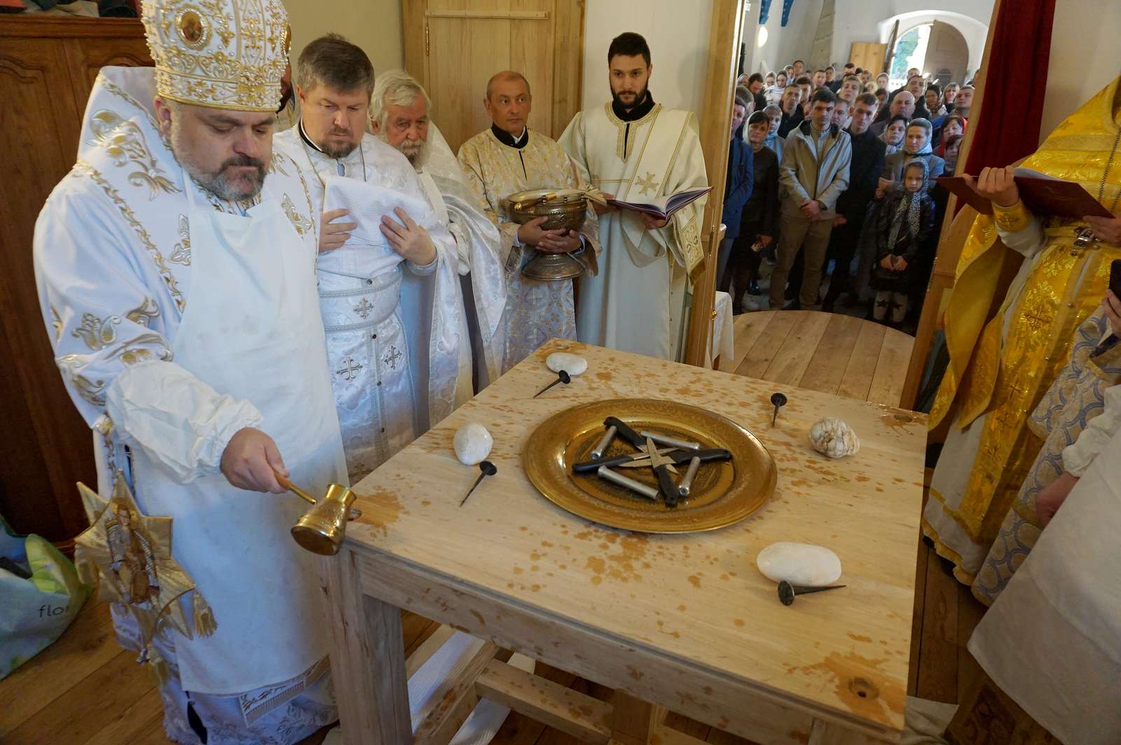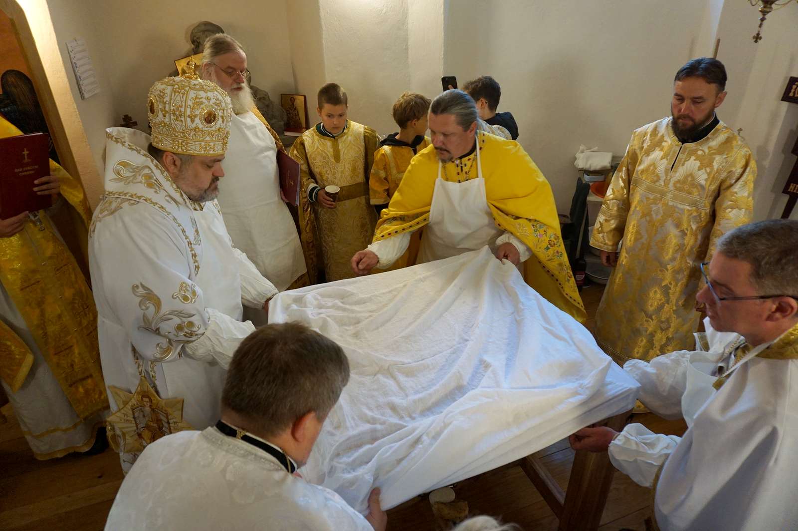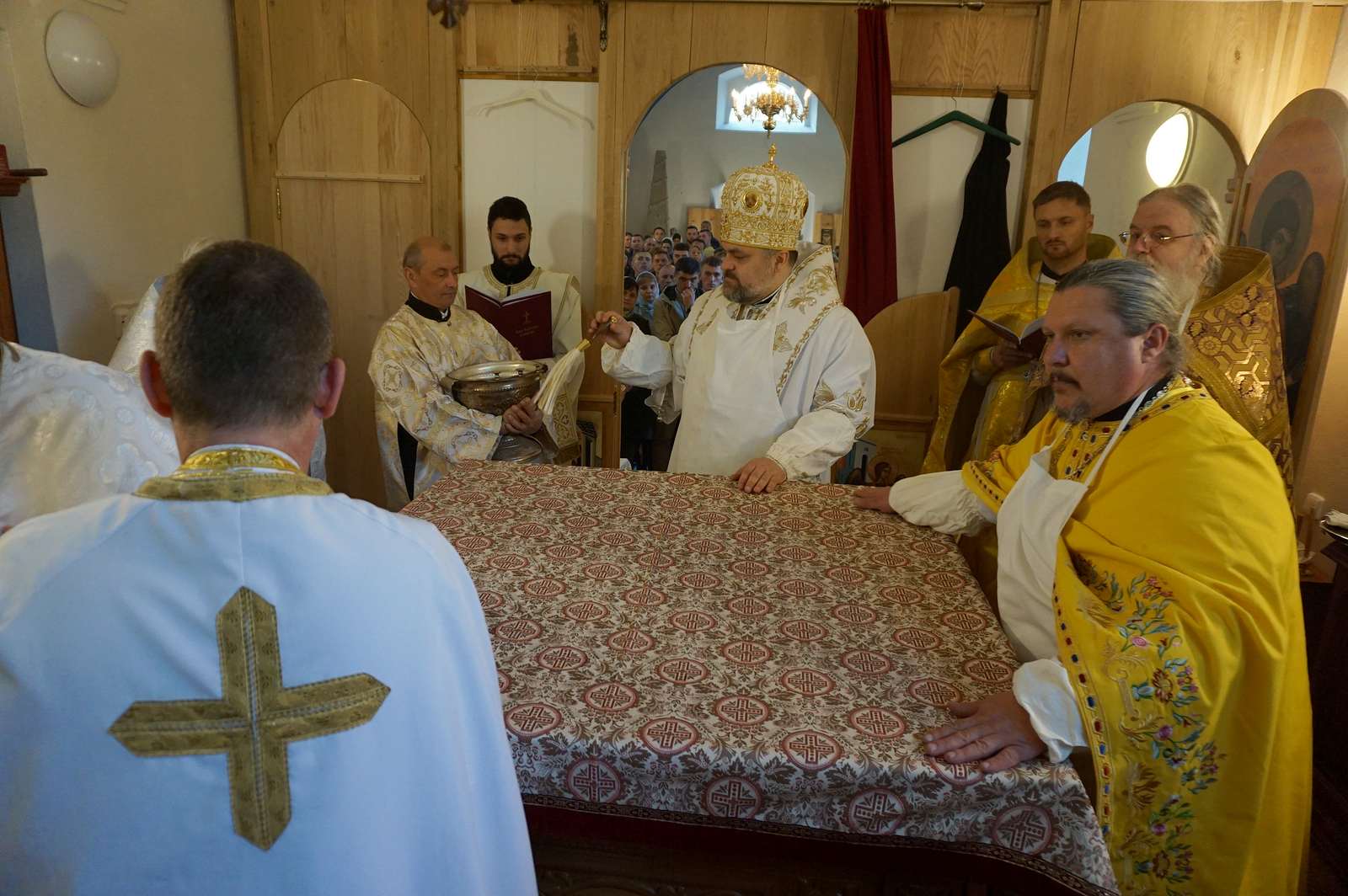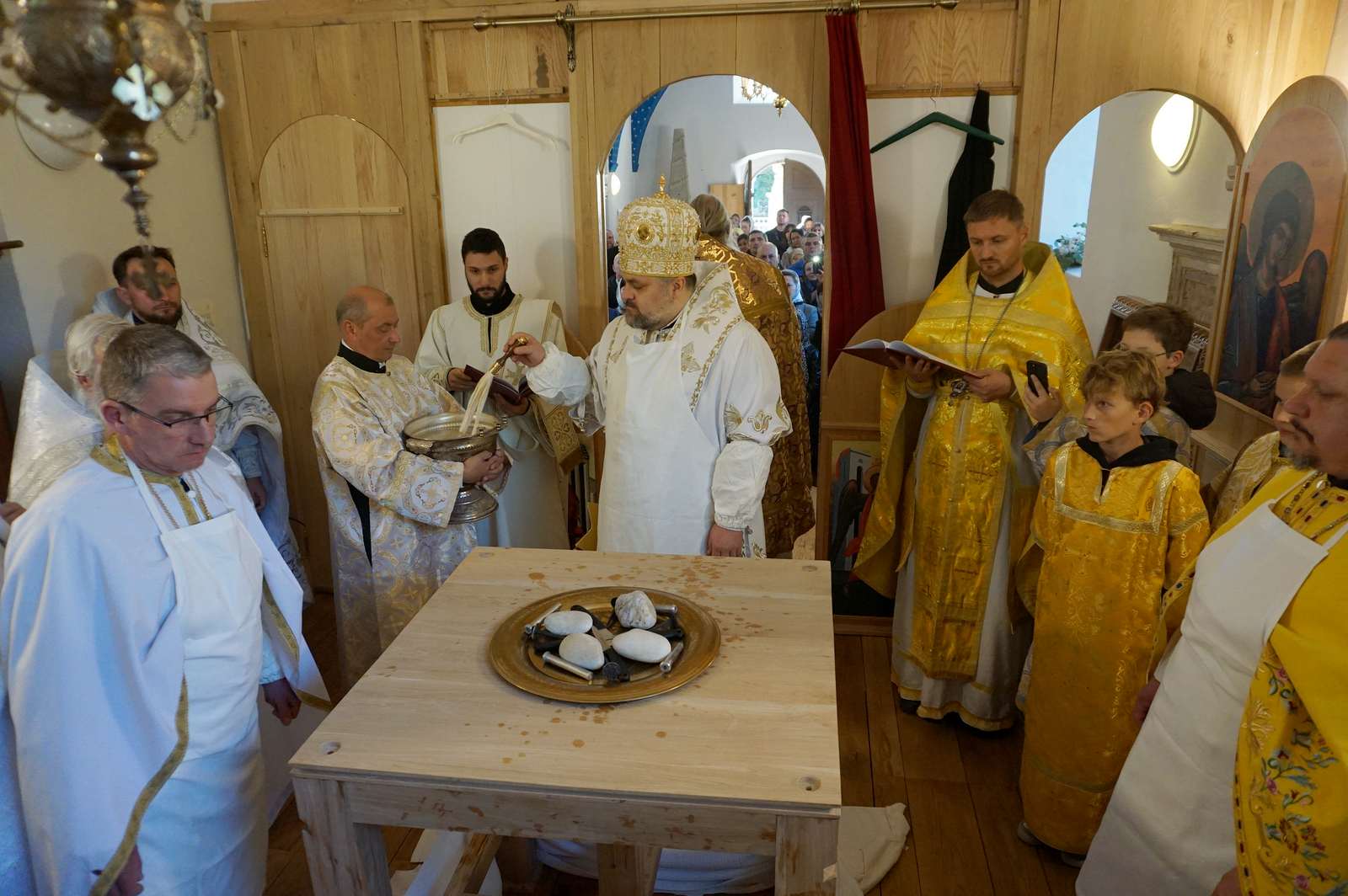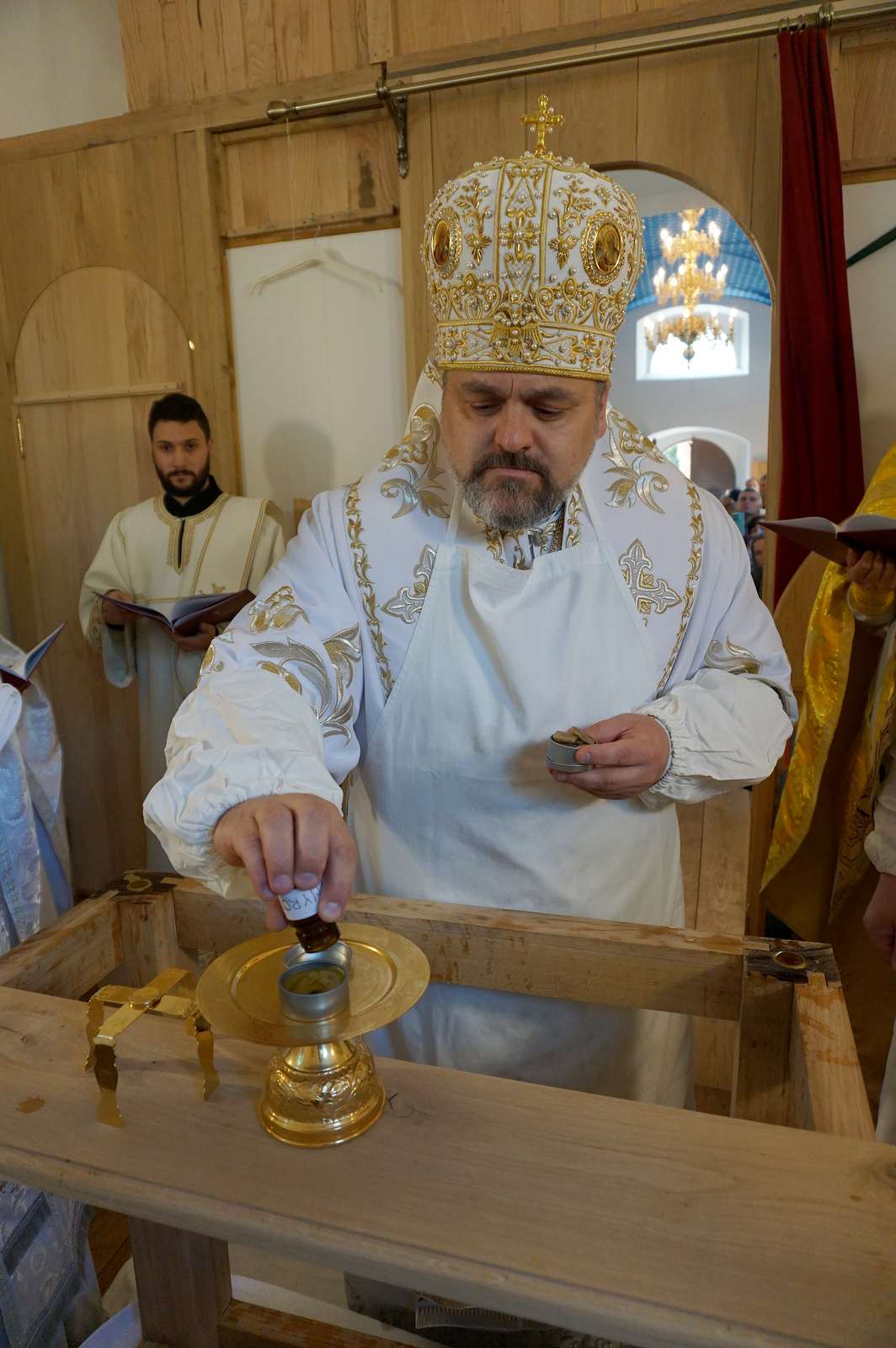V pátek 3. října jsme se tedy dobrali k dlouho očekávané události – posvěcení oltářního stolu čili mensy, kde se přináší nekrvavá oběť. V 16 hod. přijel náš Přeosvícený vladyka Izaiáš, biskup olomoucko-brněnský, s doprovodem. Přijela už i řada duchovních. Obřad velkého svěcení mohl začít. Bohoslužebný řád probíhal podle řeckého způsobu, který je trochu delší než ruský a má jiné (myslím, že logičtější) pořadí jednotlivých součástí. S požehnáním vladyky jsme nechali oponu ikonostasu rozhrnutou a královskou bránu otevřenou. Věřící byli vyzváni, aby se shromáždili hned pod ambonem a zblízka mohli pozorovat celý postup obřadu.