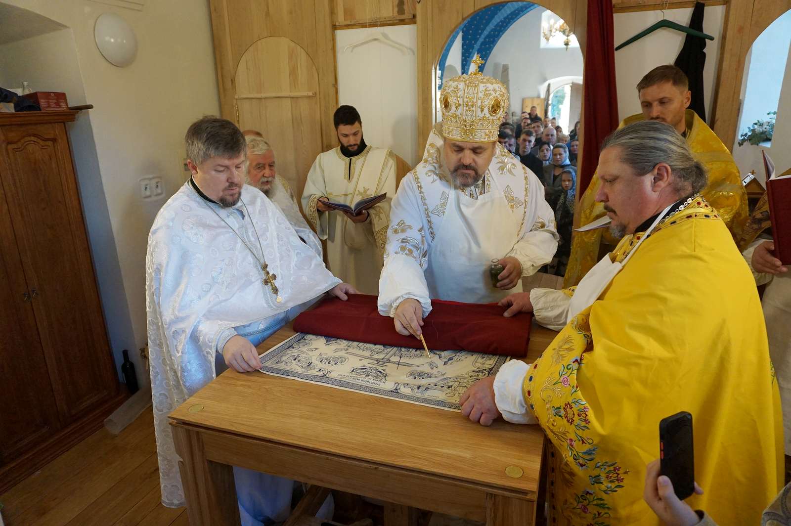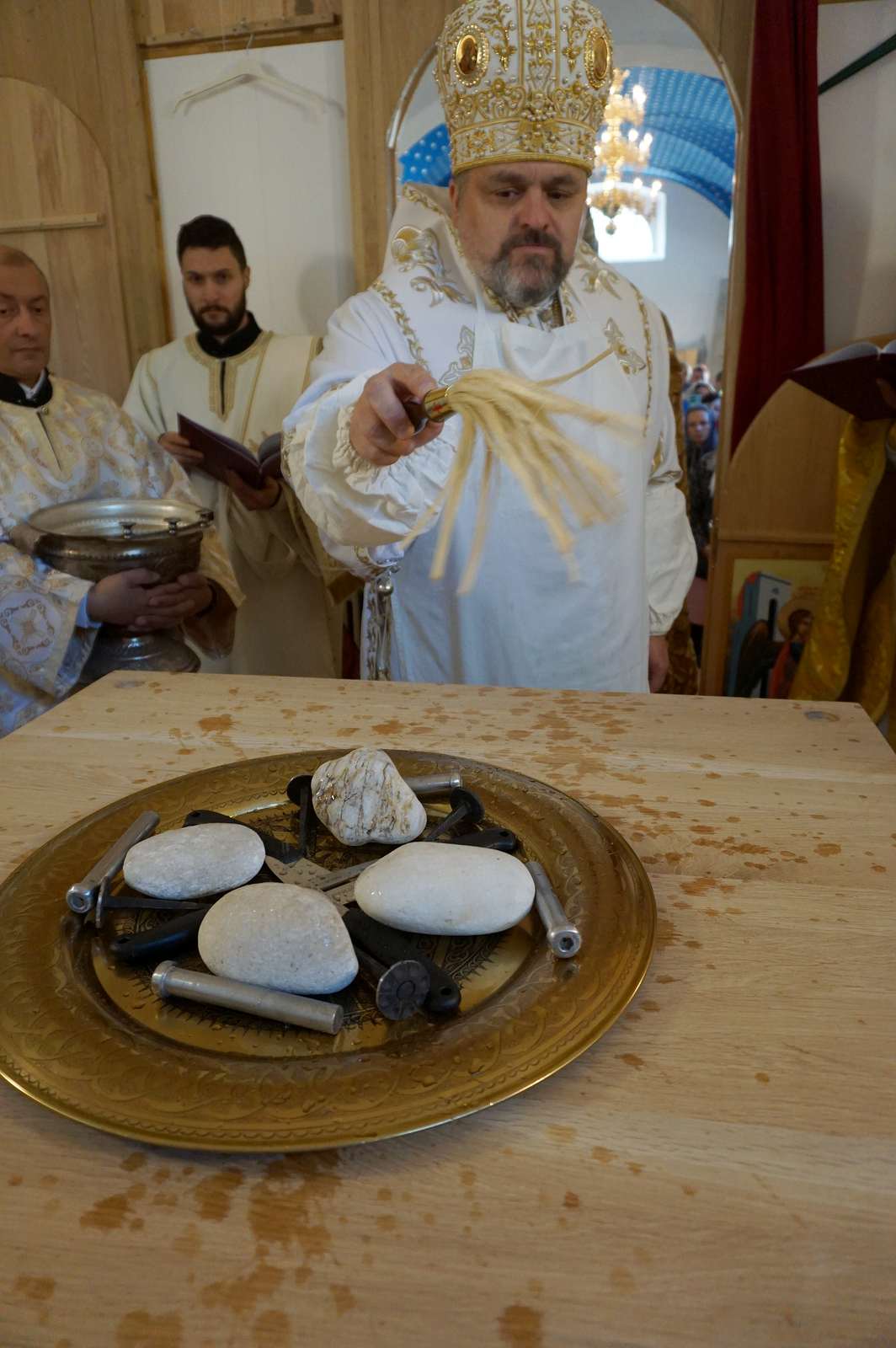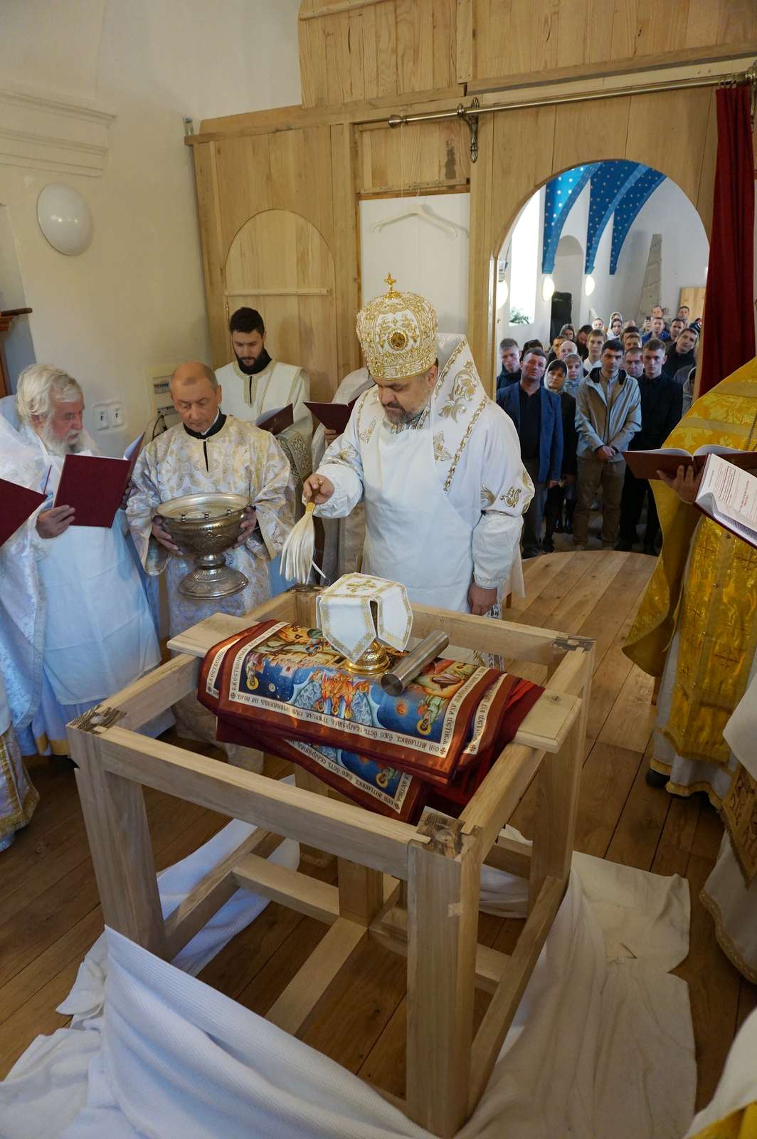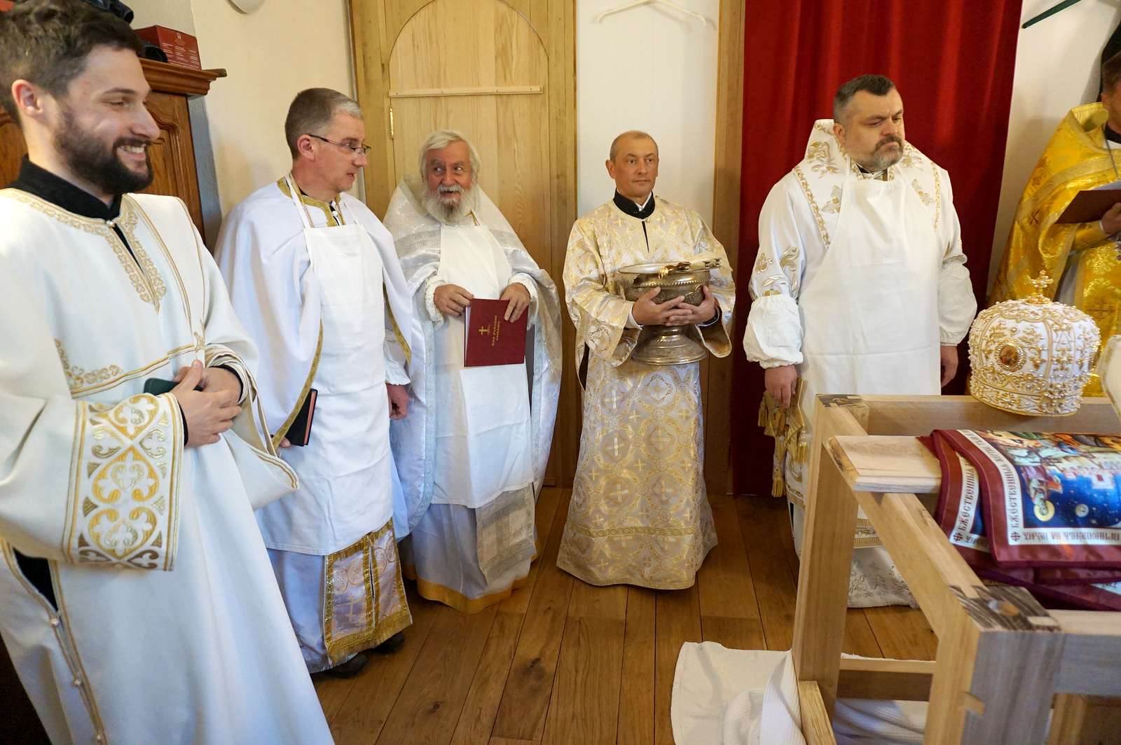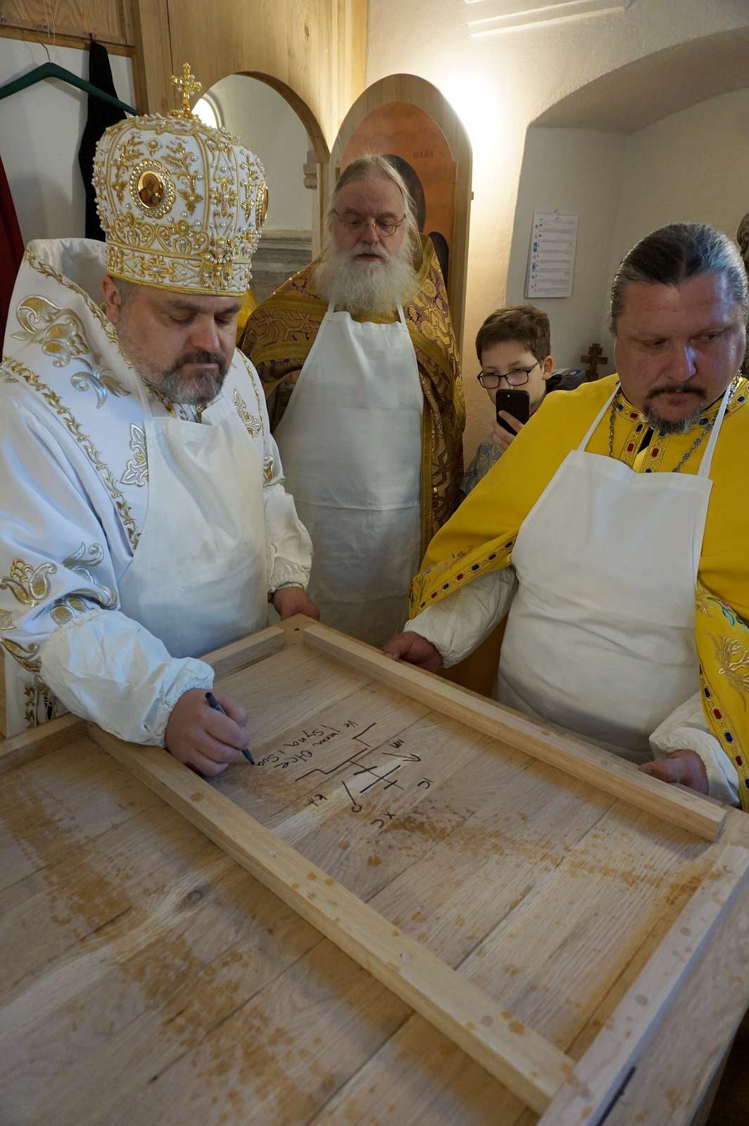 V pátek 3. října jsme se tedy dobrali k dlouho očekávané události – posvěcení oltářního stolu čili mensy, kde se přináší nekrvavá oběť. V 16 hod. přijel náš Přeosvícený vladyka Izaiáš, biskup olomoucko-brněnský, s doprovodem. Přijela už i řada duchovních. Obřad velkého svěcení mohl začít. Bohoslužebný řád probíhal podle řeckého způsobu, který je trochu delší než ruský a má jiné (myslím, že logičtější) pořadí jednotlivých součástí. S požehnáním vladyky jsme nechali oponu ikonostasu rozhrnutou a královskou bránu otevřenou. Věřící byli vyzváni, aby se shromáždili hned pod ambonem a zblízka mohli pozorovat celý postup obřadu.