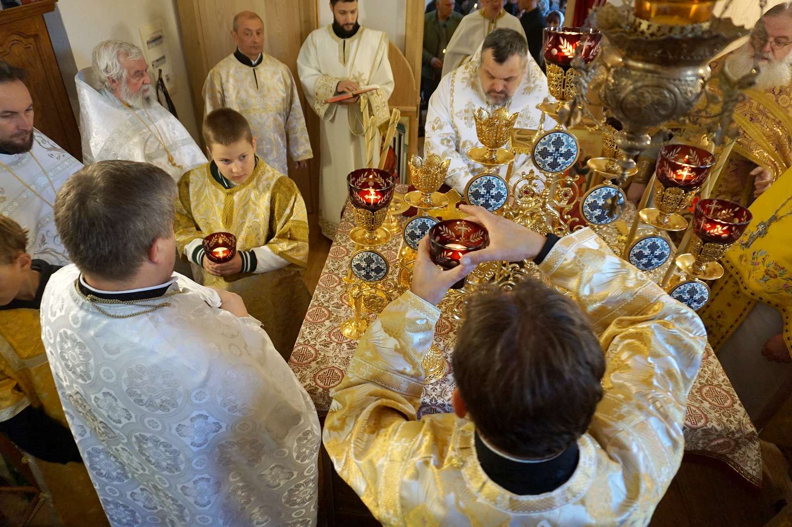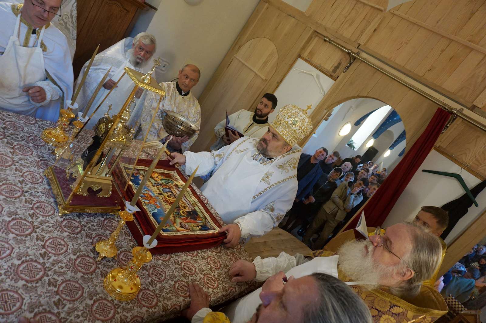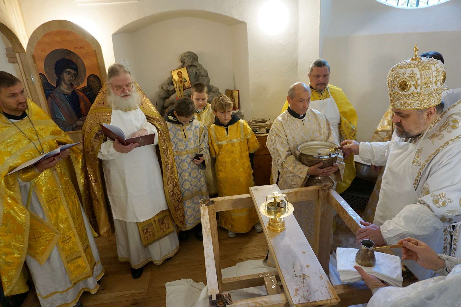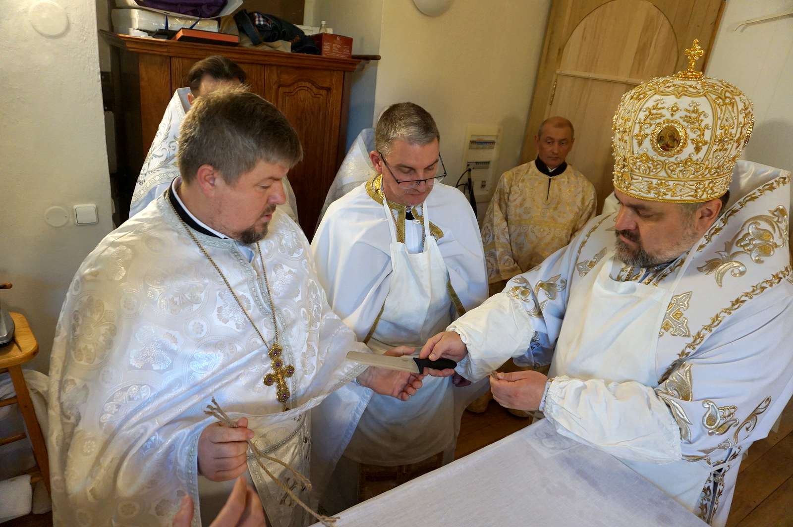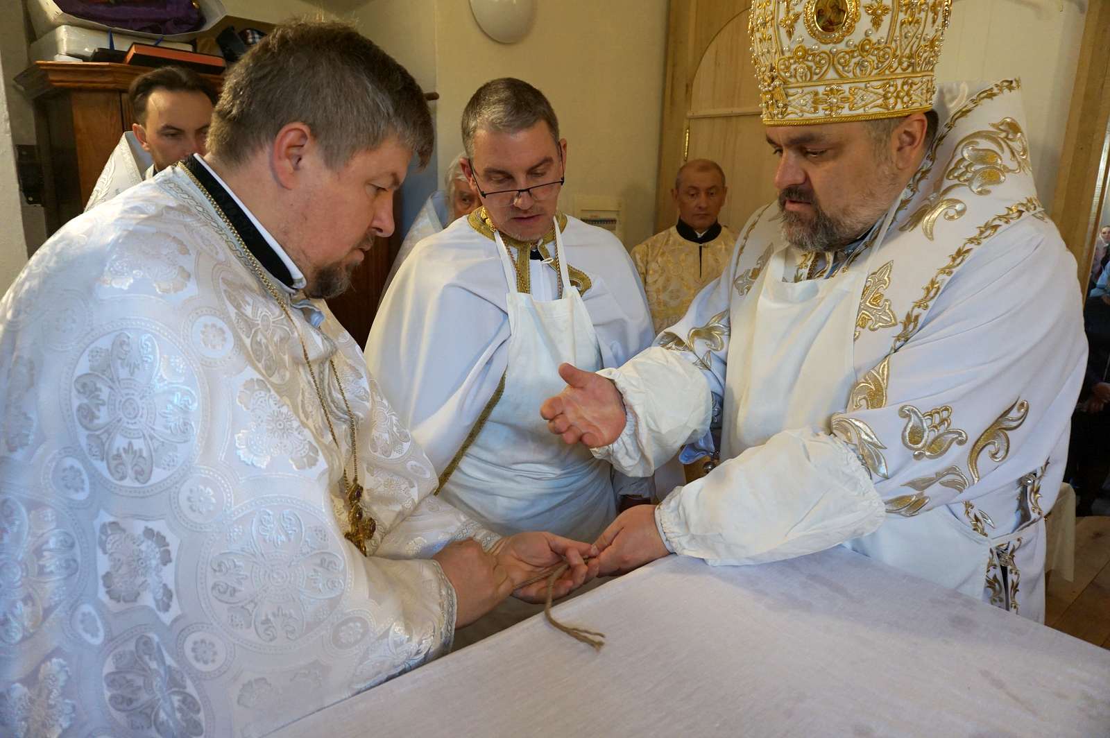 V pátek 3. října jsme se tedy dobrali k dlouho očekávané události – posvěcení oltářního stolu čili mensy, kde se přináší nekrvavá oběť. V 16 hod. přijel náš Přeosvícený vladyka Izaiáš, biskup olomoucko-brněnský, s doprovodem. Přijela už i řada duchovních. Obřad velkého svěcení mohl začít. Bohoslužebný řád probíhal podle řeckého způsobu, který je trochu delší než ruský a má jiné (myslím, že logičtější) pořadí jednotlivých součástí. S požehnáním vladyky jsme nechali oponu ikonostasu rozhrnutou a královskou bránu otevřenou. Věřící byli vyzváni, aby se shromáždili hned pod ambonem a zblízka mohli pozorovat celý postup obřadu.