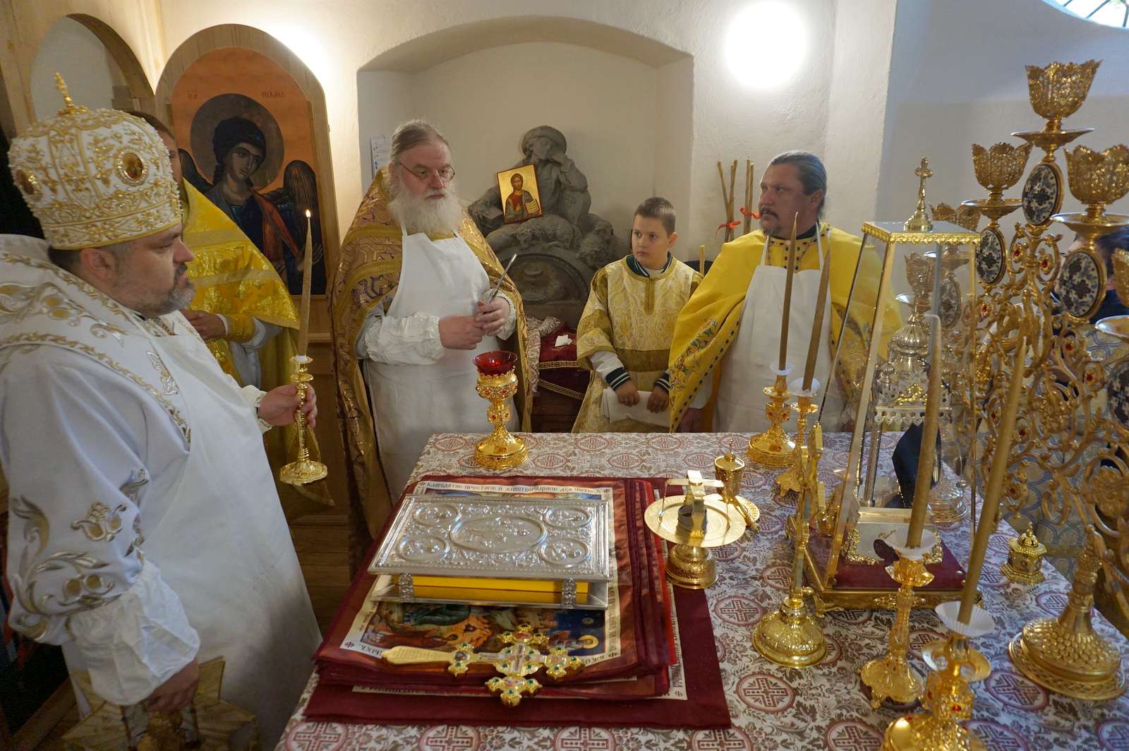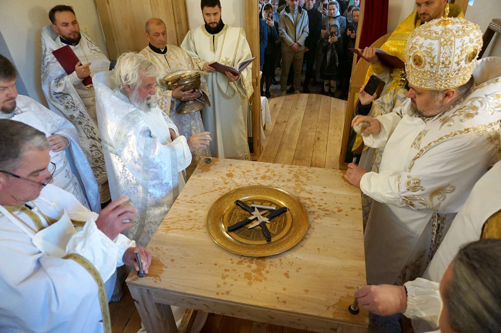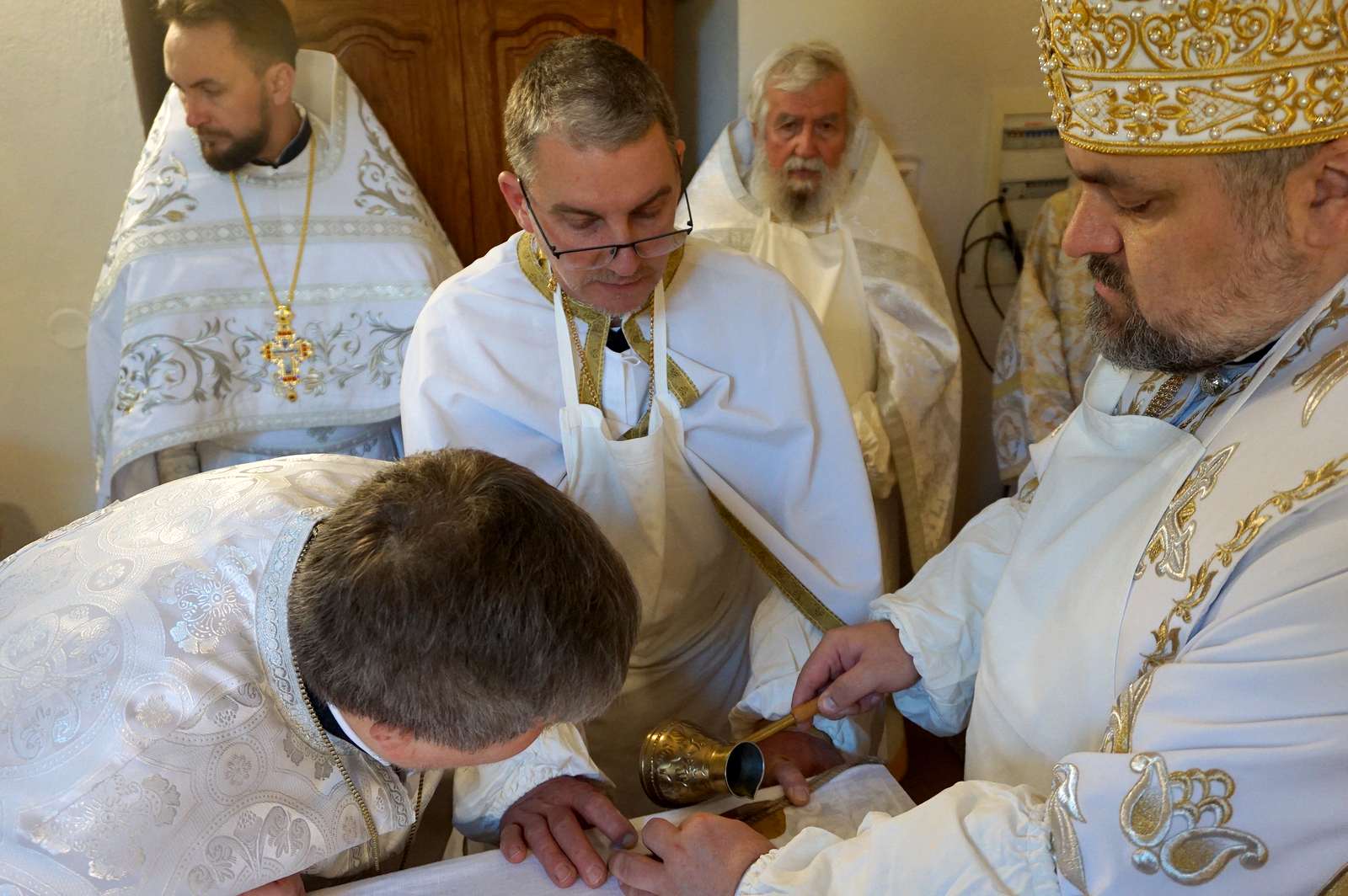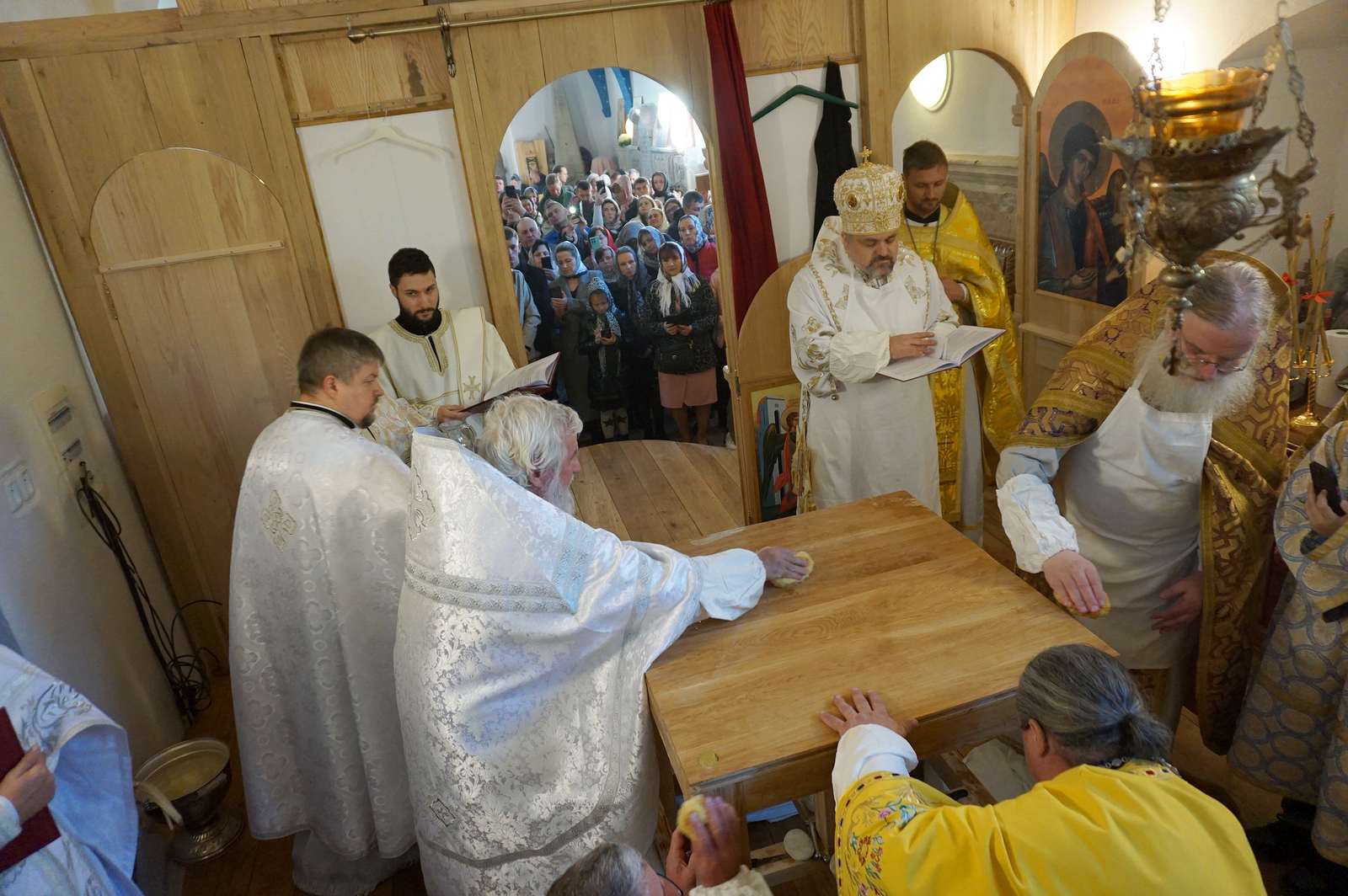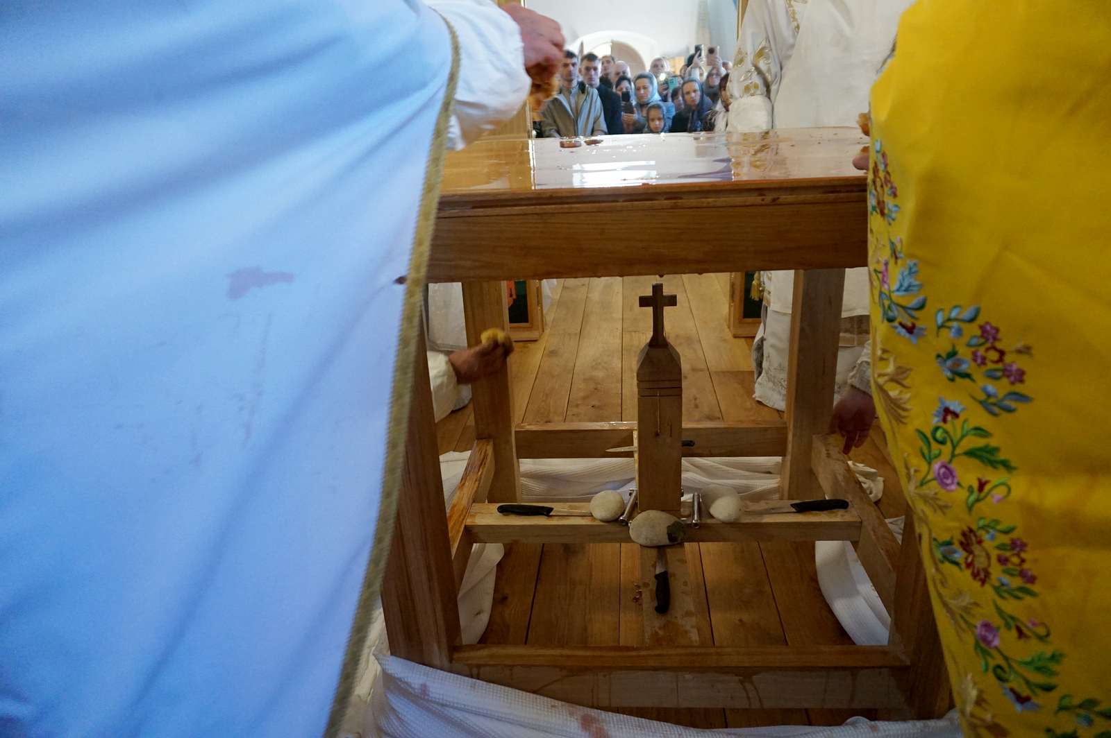 V pátek 3. října jsme se tedy dobrali k dlouho očekávané události – posvěcení oltářního stolu čili mensy, kde se přináší nekrvavá oběť. V 16 hod. přijel náš Přeosvícený vladyka Izaiáš, biskup olomoucko-brněnský, s doprovodem. Přijela už i řada duchovních. Obřad velkého svěcení mohl začít. Bohoslužebný řád probíhal podle řeckého způsobu, který je trochu delší než ruský a má jiné (myslím, že logičtější) pořadí jednotlivých součástí. S požehnáním vladyky jsme nechali oponu ikonostasu rozhrnutou a královskou bránu otevřenou. Věřící byli vyzváni, aby se shromáždili hned pod ambonem a zblízka mohli pozorovat celý postup obřadu.