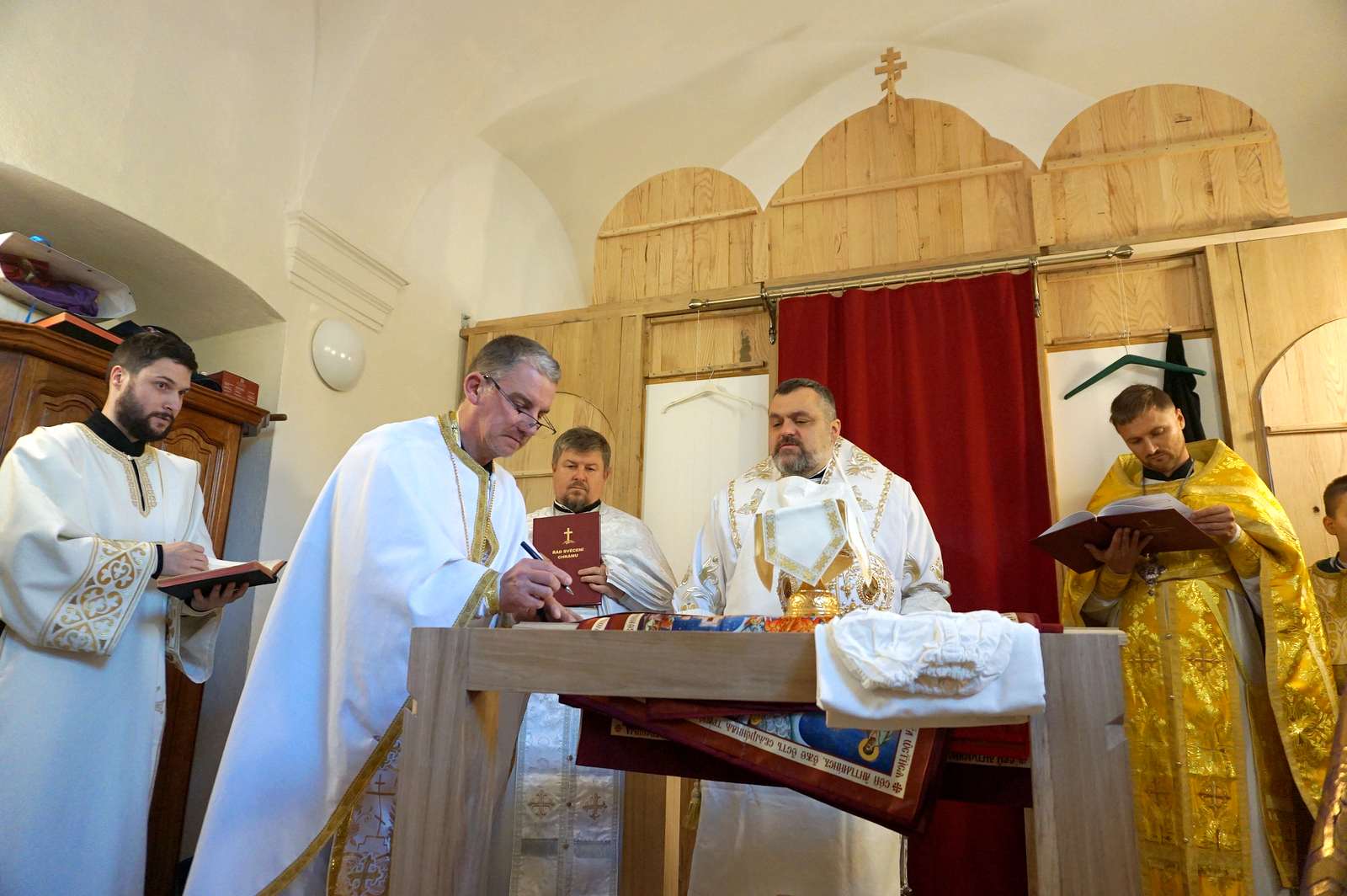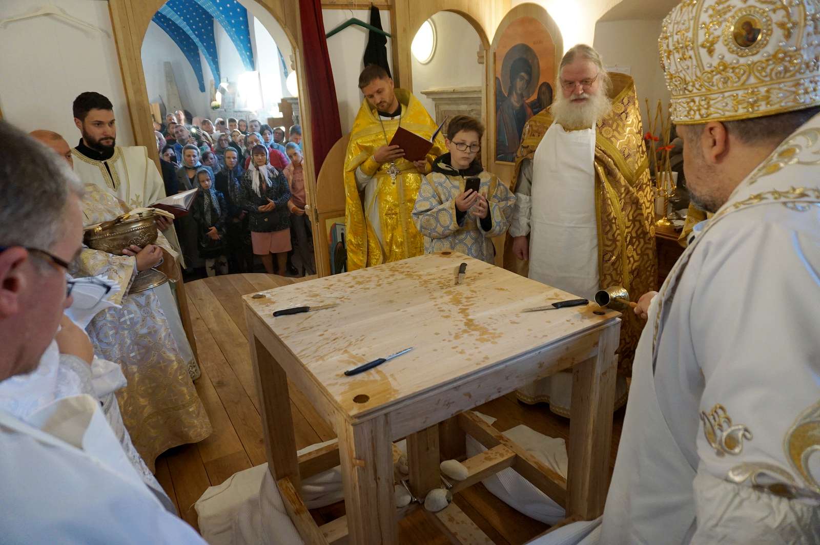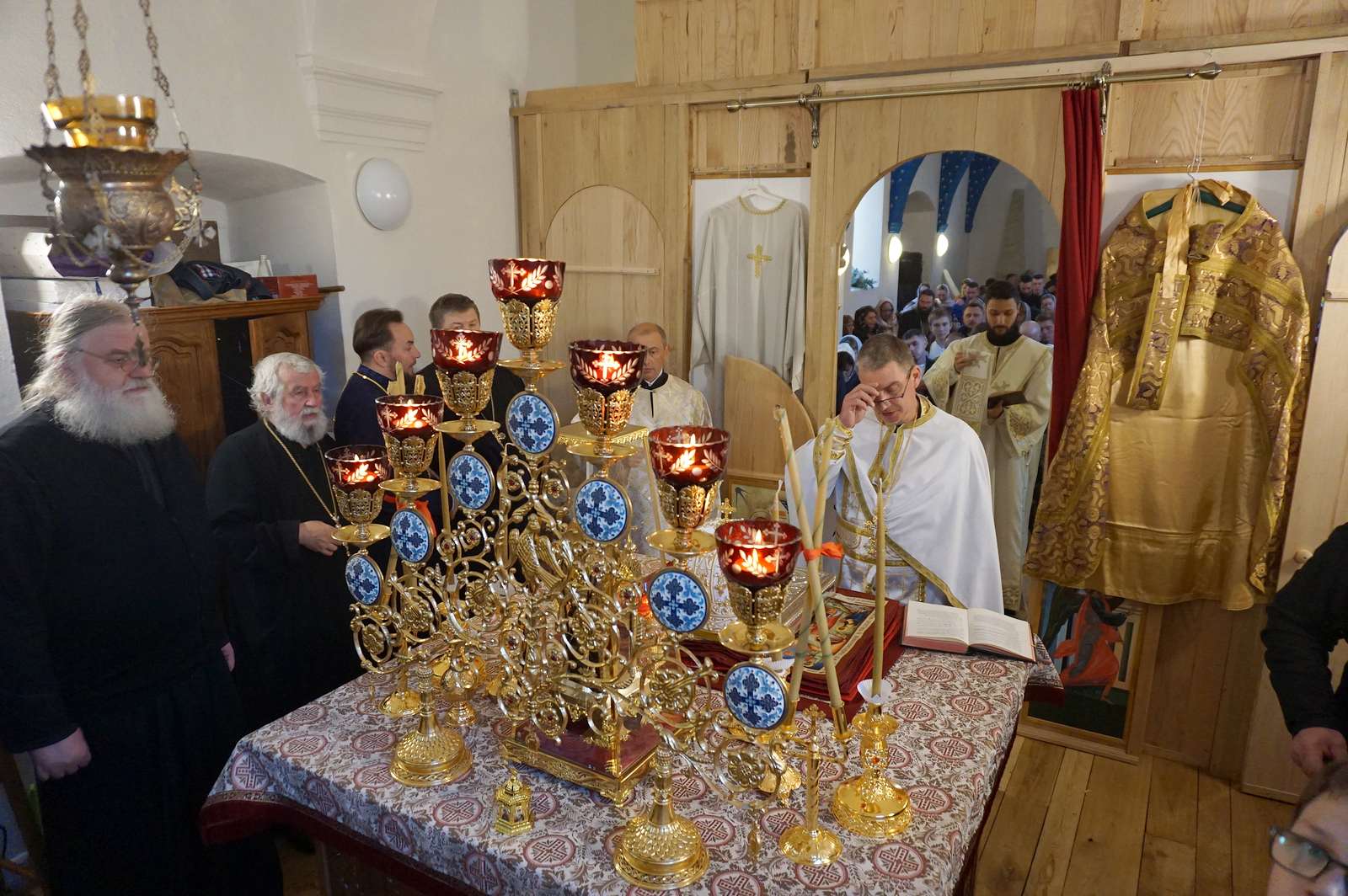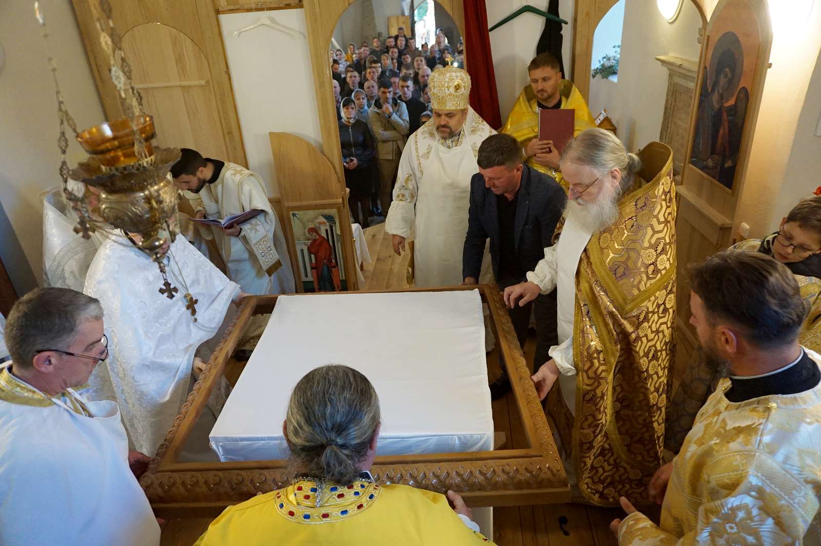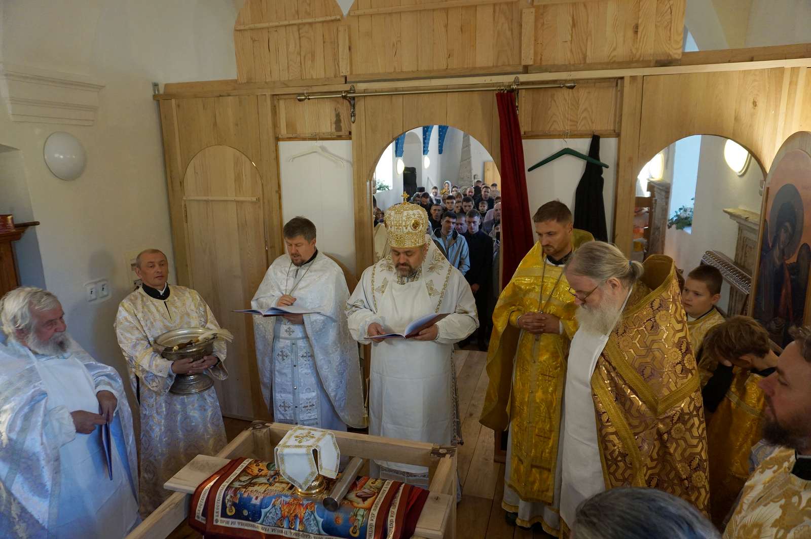 V pátek 3. října jsme se tedy dobrali k dlouho očekávané události – posvěcení oltářního stolu čili mensy, kde se přináší nekrvavá oběť. V 16 hod. přijel náš Přeosvícený vladyka Izaiáš, biskup olomoucko-brněnský, s doprovodem. Přijela už i řada duchovních. Obřad velkého svěcení mohl začít. Bohoslužebný řád probíhal podle řeckého způsobu, který je trochu delší než ruský a má jiné (myslím, že logičtější) pořadí jednotlivých součástí. S požehnáním vladyky jsme nechali oponu ikonostasu rozhrnutou a královskou bránu otevřenou. Věřící byli vyzváni, aby se shromáždili hned pod ambonem a zblízka mohli pozorovat celý postup obřadu.
