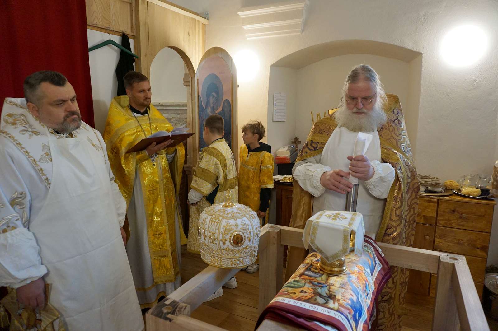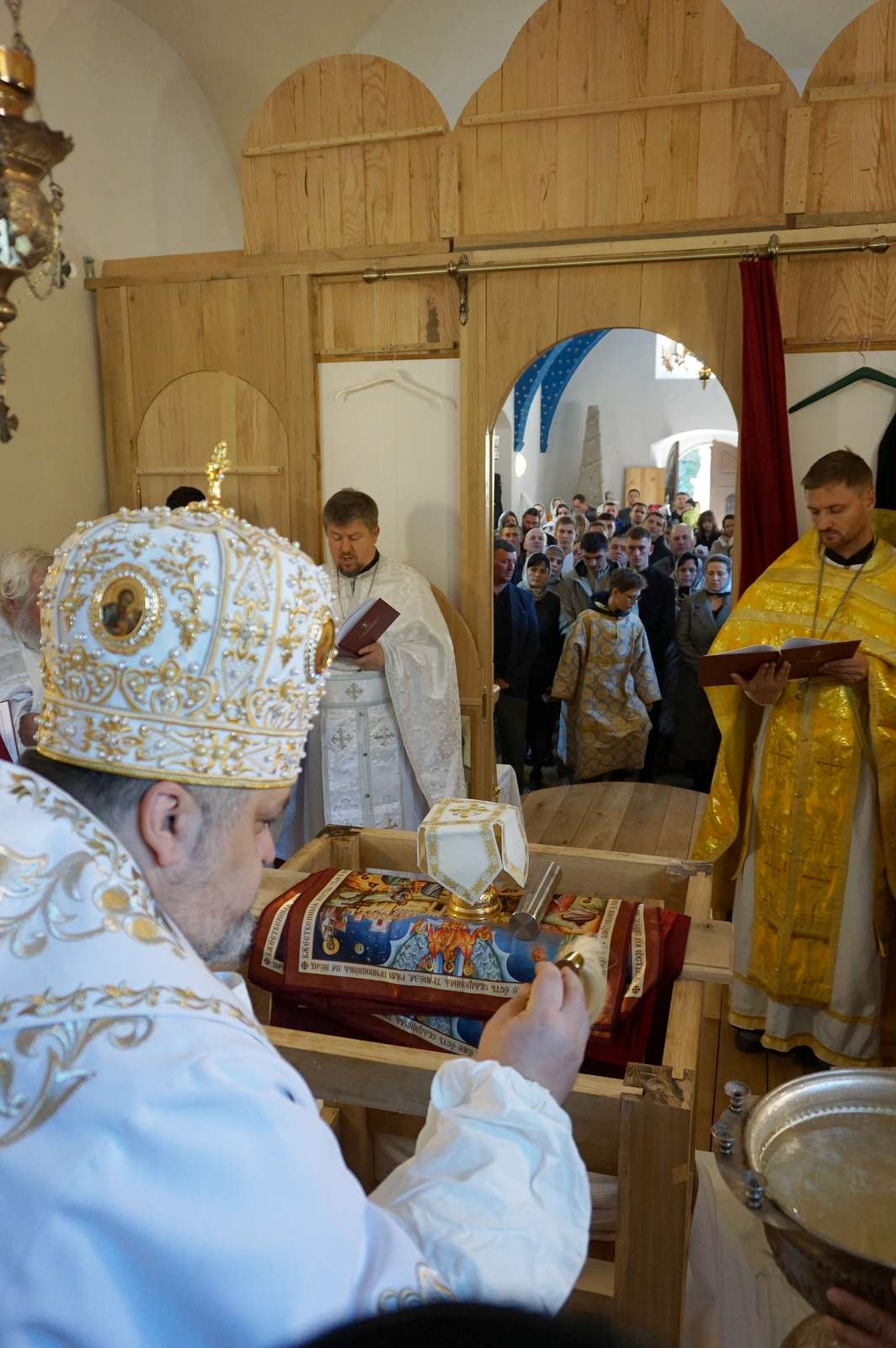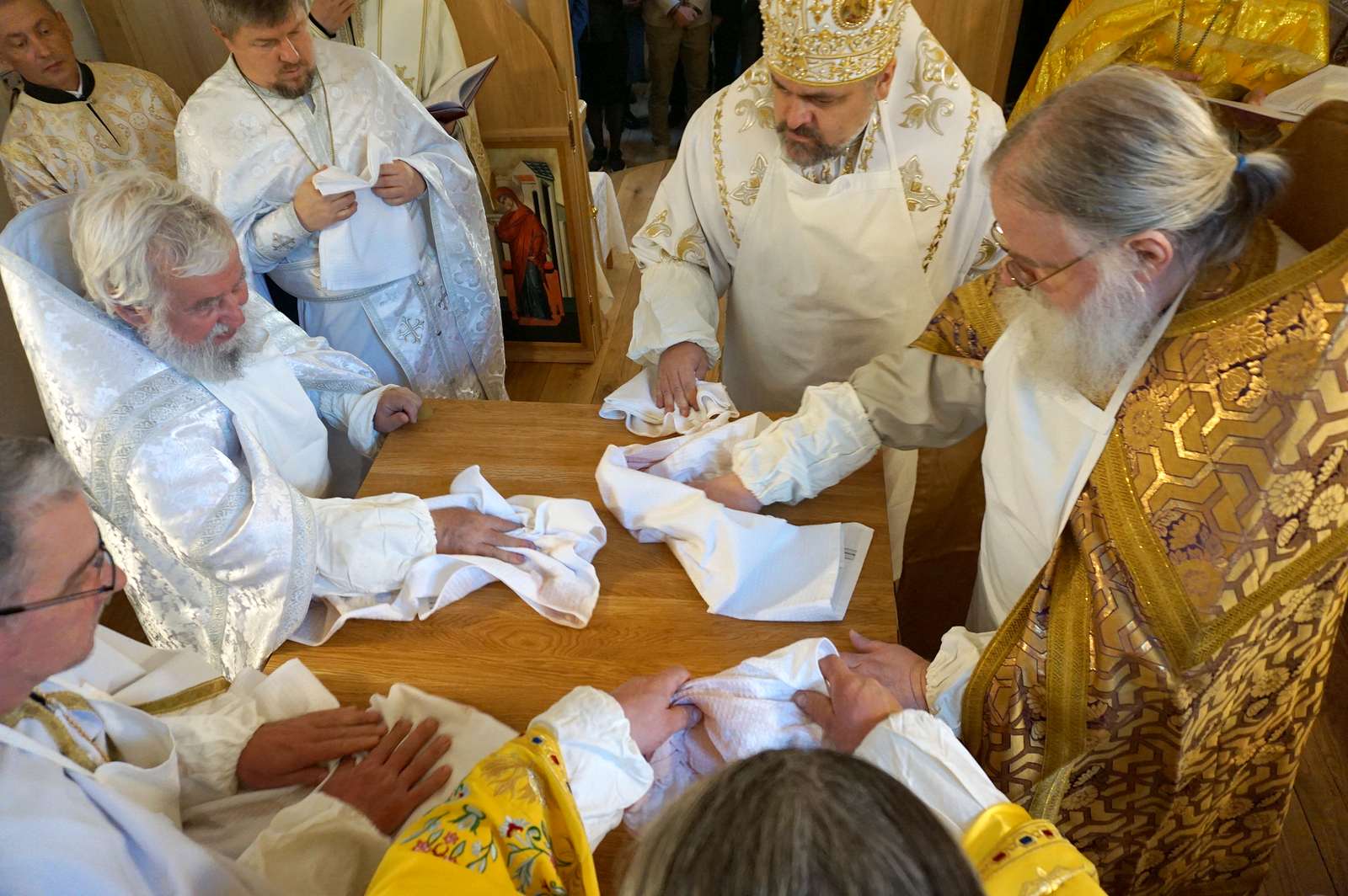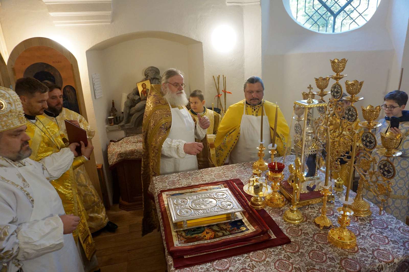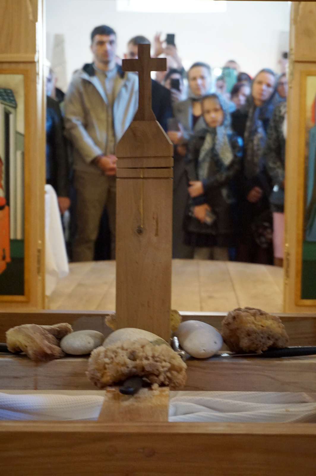V pátek 3. října jsme se tedy dobrali k dlouho očekávané události – posvěcení oltářního stolu čili mensy, kde se přináší nekrvavá oběť. V 16 hod. přijel náš Přeosvícený vladyka Izaiáš, biskup olomoucko-brněnský, s doprovodem. Přijela už i řada duchovních. Obřad velkého svěcení mohl začít. Bohoslužebný řád probíhal podle řeckého způsobu, který je trochu delší než ruský a má jiné (myslím, že logičtější) pořadí jednotlivých součástí. S požehnáním vladyky jsme nechali oponu ikonostasu rozhrnutou a královskou bránu otevřenou. Věřící byli vyzváni, aby se shromáždili hned pod ambonem a zblízka mohli pozorovat celý postup obřadu.