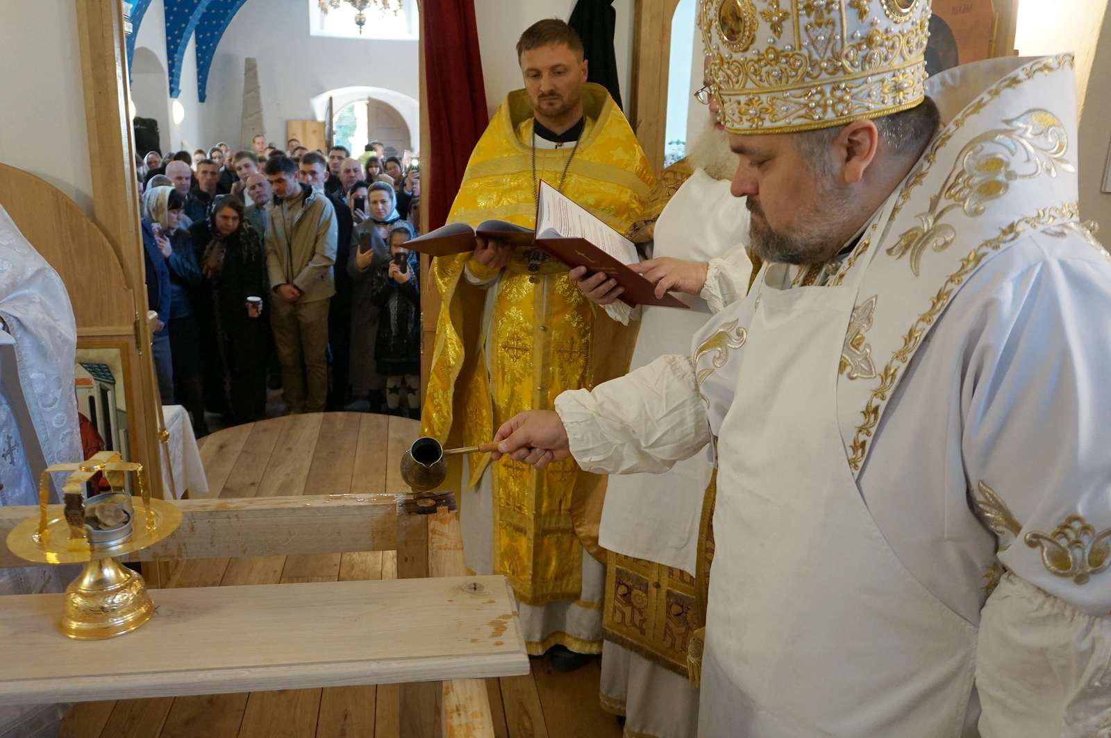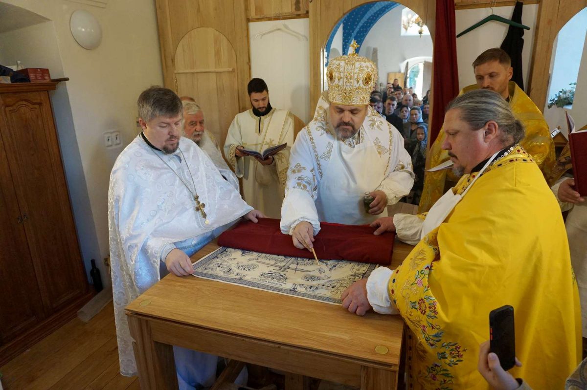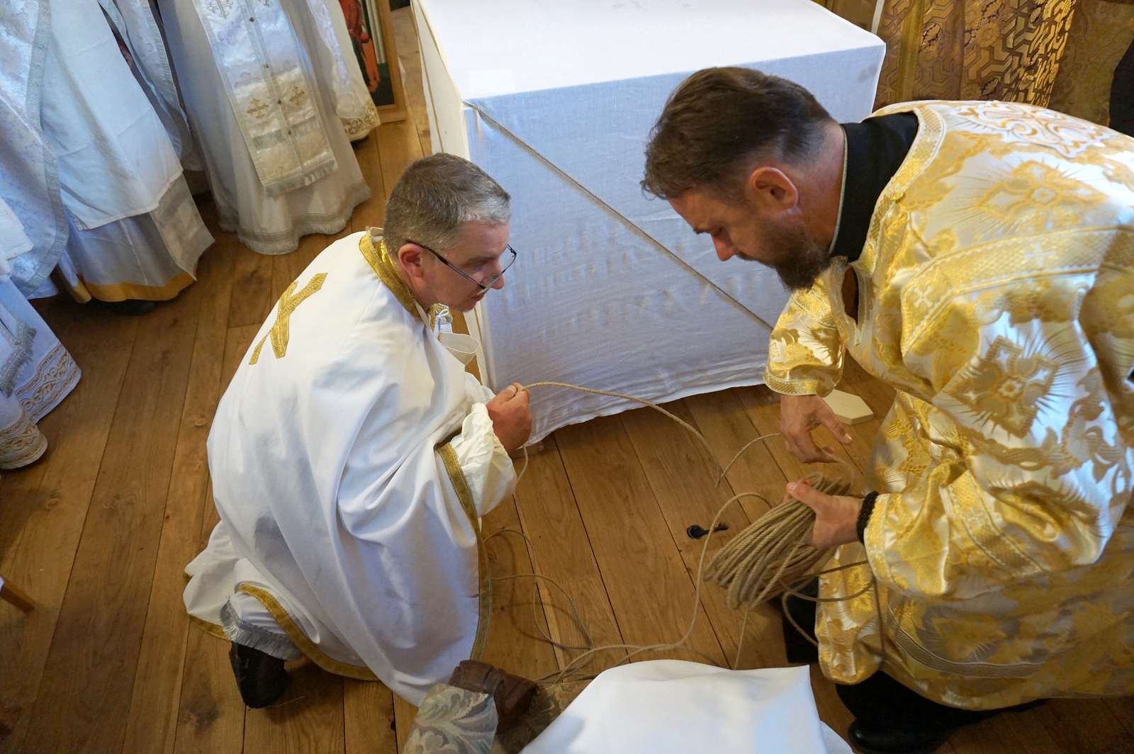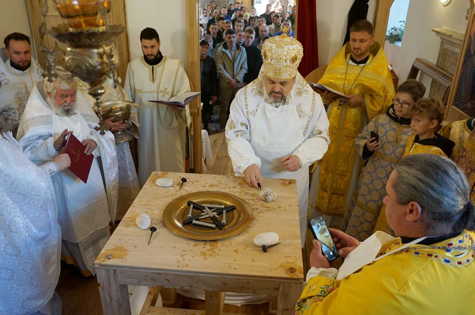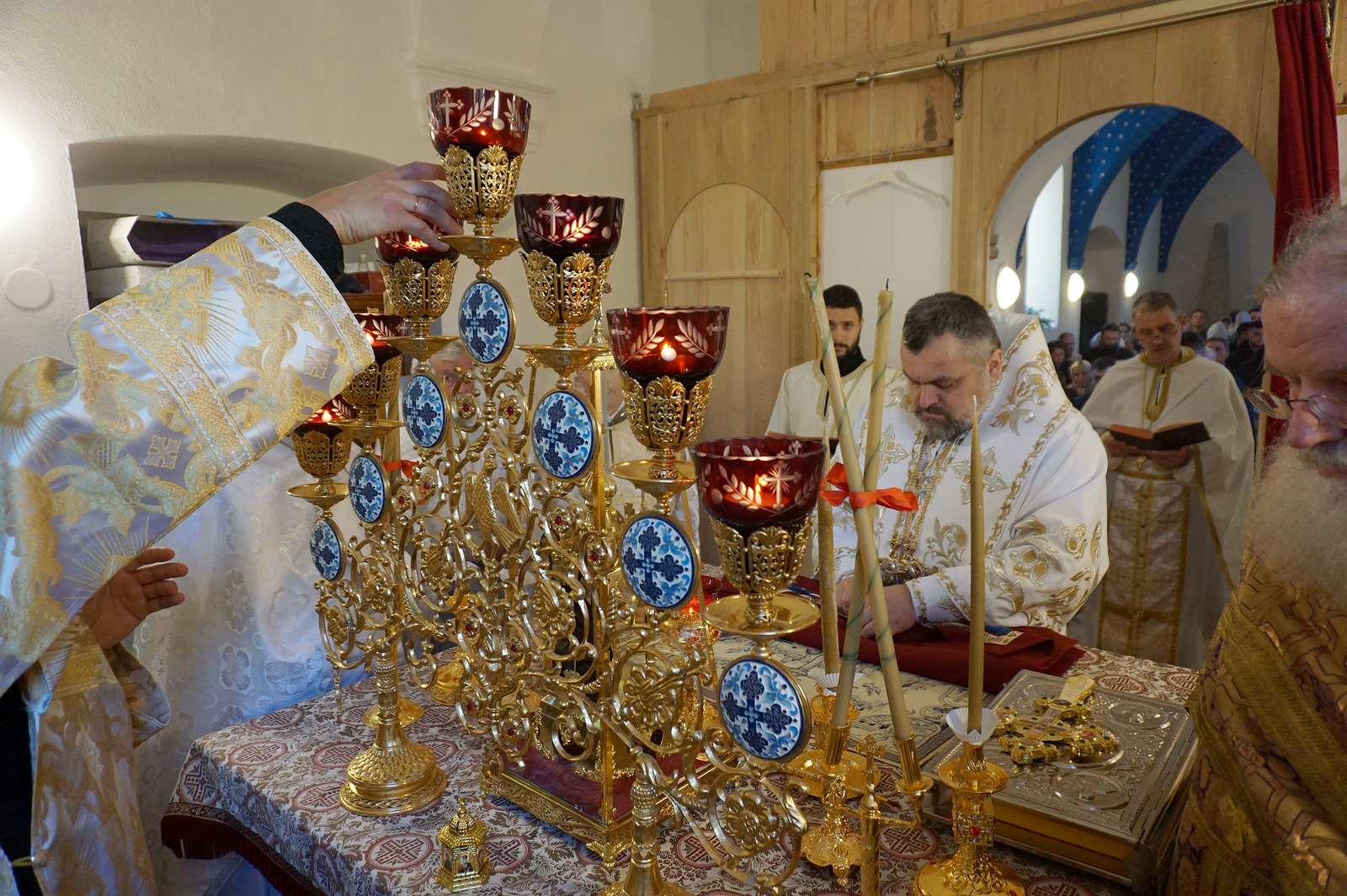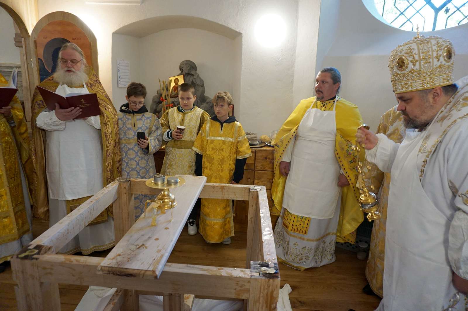 V pátek 3. října jsme se tedy dobrali k dlouho očekávané události – posvěcení oltářního stolu čili mensy, kde se přináší nekrvavá oběť. V 16 hod. přijel náš Přeosvícený vladyka Izaiáš, biskup olomoucko-brněnský, s doprovodem. Přijela už i řada duchovních. Obřad velkého svěcení mohl začít. Bohoslužebný řád probíhal podle řeckého způsobu, který je trochu delší než ruský a má jiné (myslím, že logičtější) pořadí jednotlivých součástí. S požehnáním vladyky jsme nechali oponu ikonostasu rozhrnutou a královskou bránu otevřenou. Věřící byli vyzváni, aby se shromáždili hned pod ambonem a zblízka mohli pozorovat celý postup obřadu.