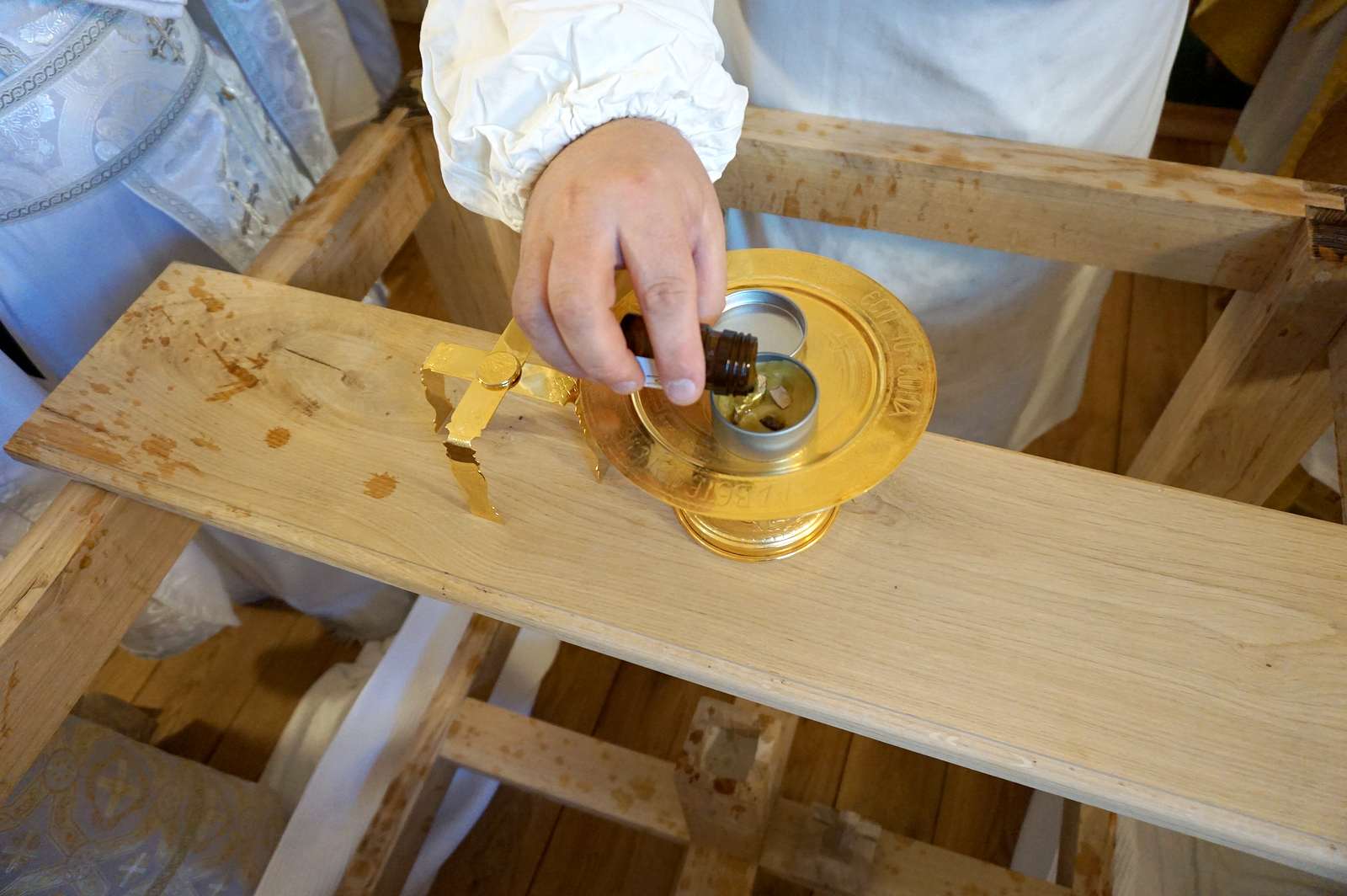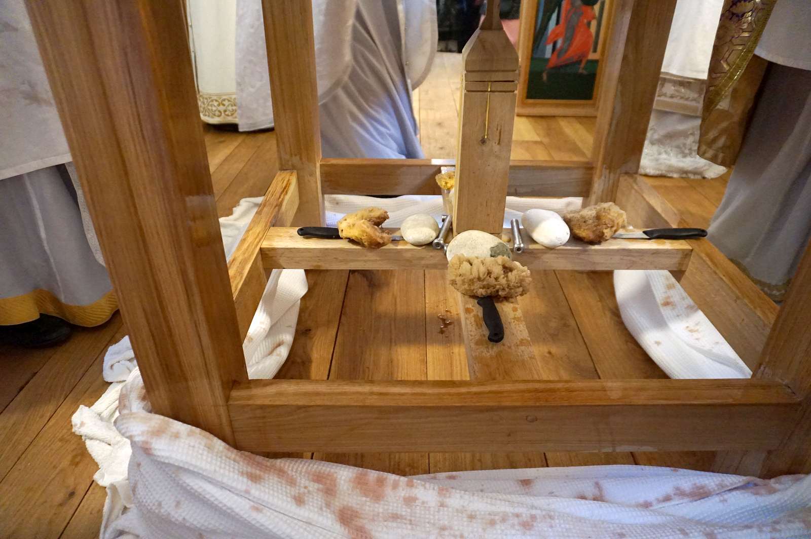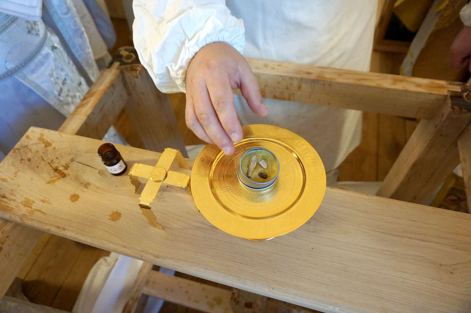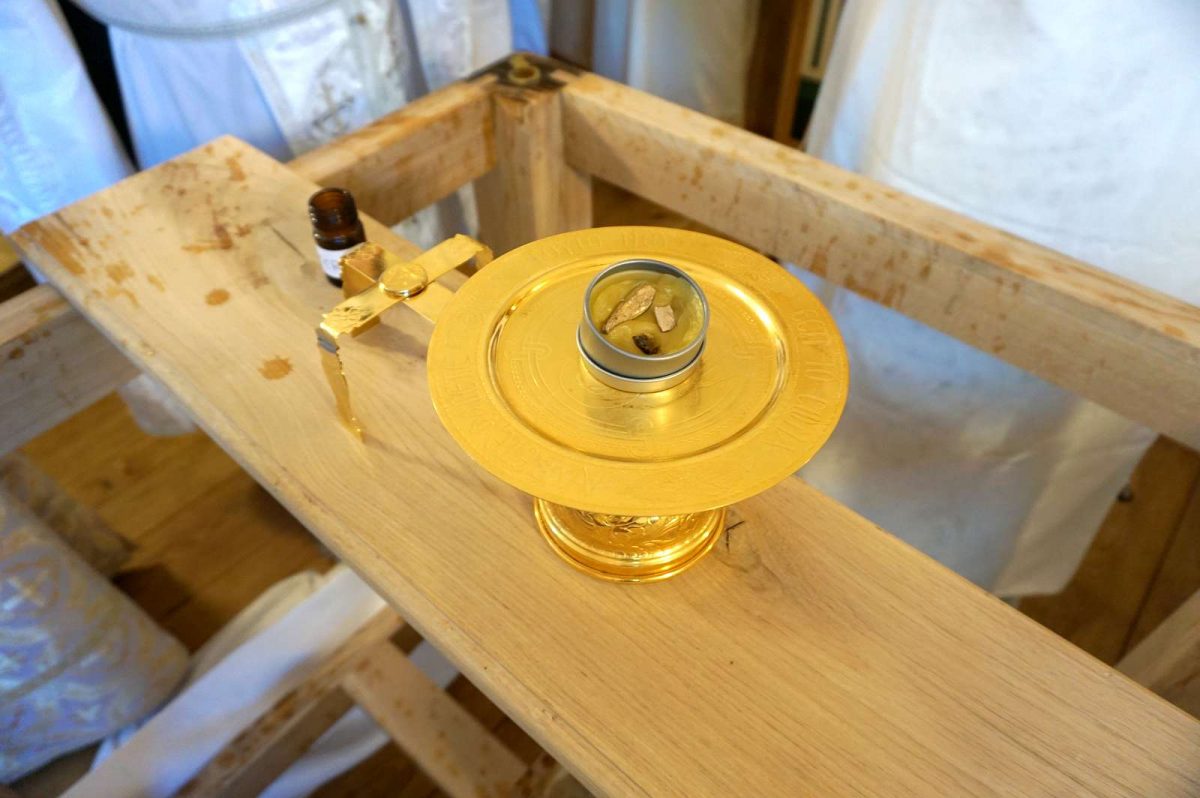 Po úvodních modlitbách přistoupil vladyka s duchovními ke zbudování prestolu. Na místě byly vztyčeny čtyři sloupy – nohy těžkého obětního stolu, které byly na podlaze zafixovány proti posunutí, aby se prestol nemohl pohnout. Uprostřed nich, uvnitř prestolu, byla ještě kratší, pátá noha, opatřená schránkou ve formě dutiny se stříškou. Prestol z dubových hranolů má takovou váhu, že jej nezvedne jeden člověk; přenést jej mohou jen dva silní muži.