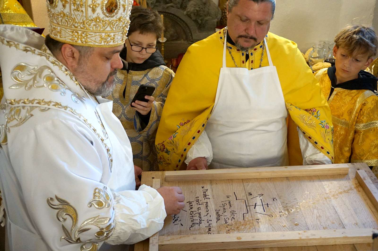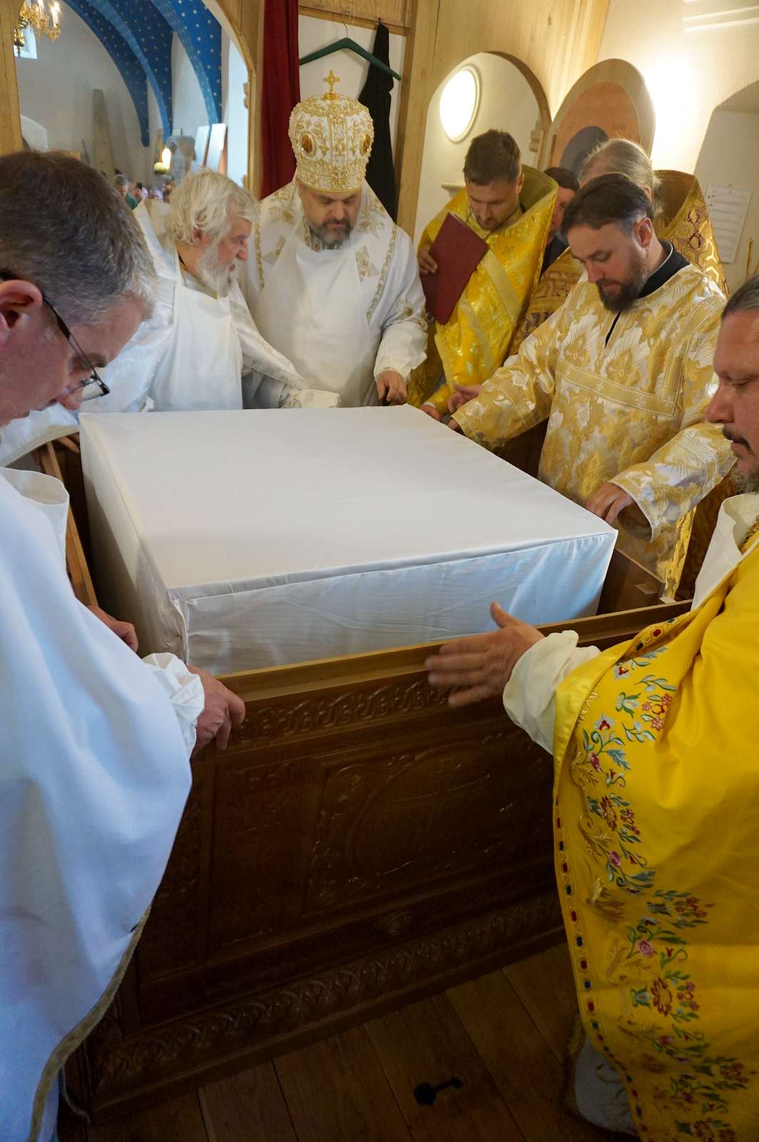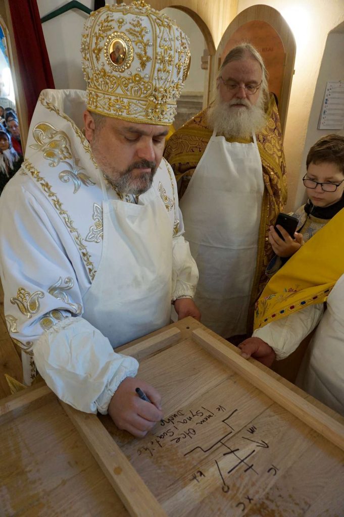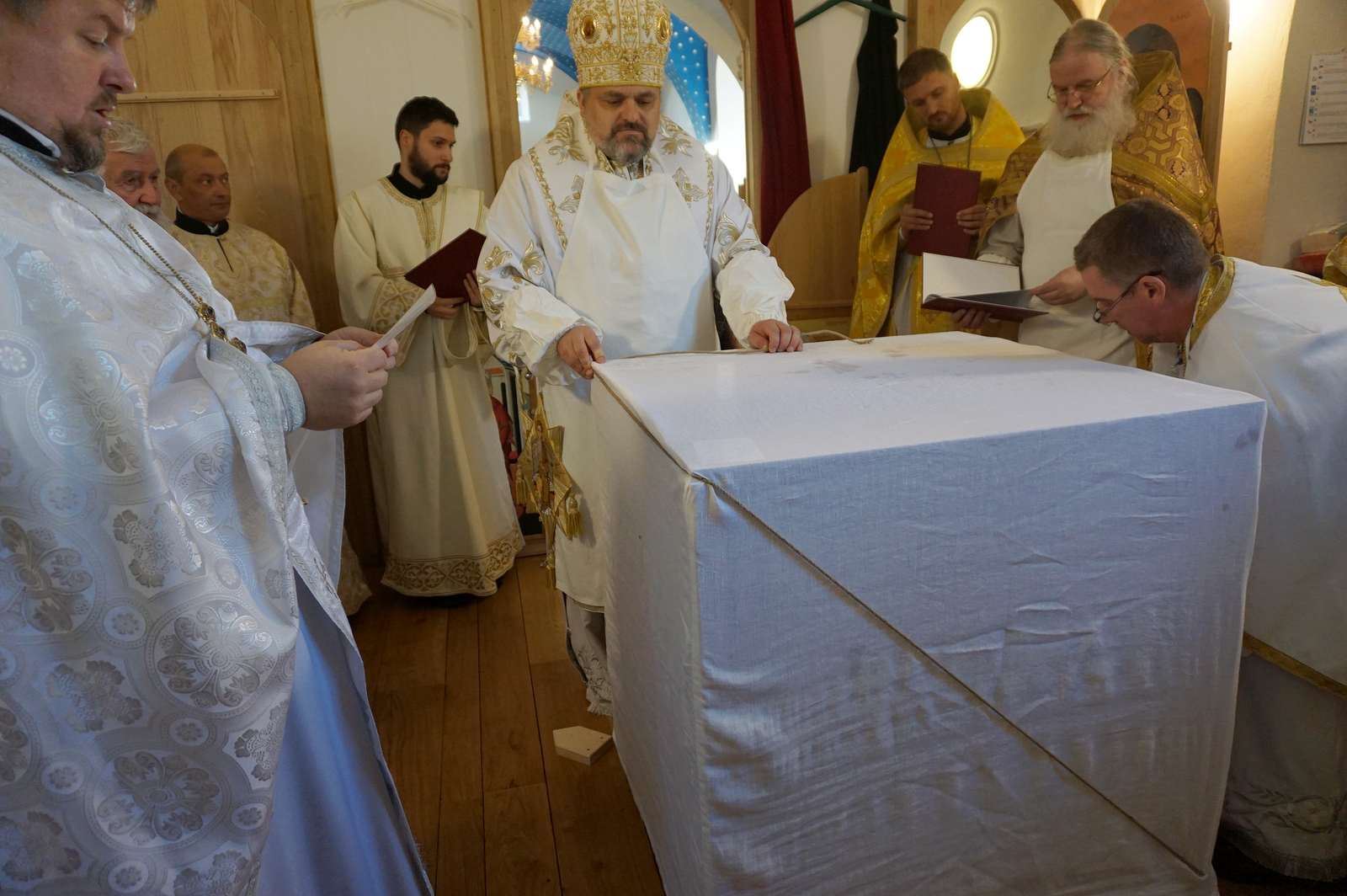Připravili jsme také kovovou válcovou schránku, do níž byla vložena pamětní listina, jejíž slavnostní text přečetl duchovní správce všem přítomným, a vladyka ji poté stvrdil svým podpisem, k němuž připojili podpisy i všichni přítomní duchovní. Po vložení srolované listiny do kovové patrony, tam byly nasypány lístečky a vloženy zápisy se jmény všech přítomných věřících. Kapsle byla pevně uzavřena a zasunuta do páté prestolní nohy, zasypána pískem a zalita voskomastixem; na to pak byla vložena další kovová schránka, v níž byly částečky z ostatků tří mučedníků: sv. Olympia (prvomučedníka římského), svatých palestinských ctihodných mučedníků (umučených v r. 614 Peršany) a mučedníka sv. Maxima Gorlického (z Polska); do antiminsů pak vkládal vladyka ostatky mučedníka Eugenia. Svaté ostatky zalil vladyka svatým myrem, poté schránku uzavřel, vložil do páté nohy a zalil voskomastixem a vstup do dutiny zapečetil stříškou.