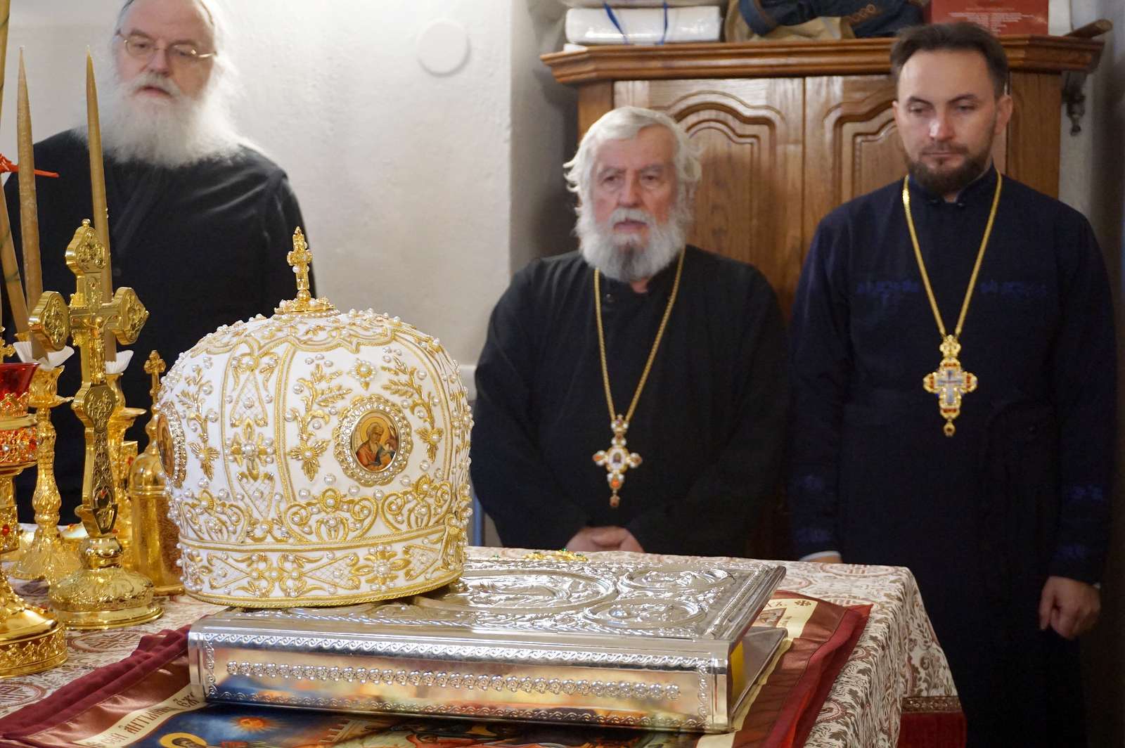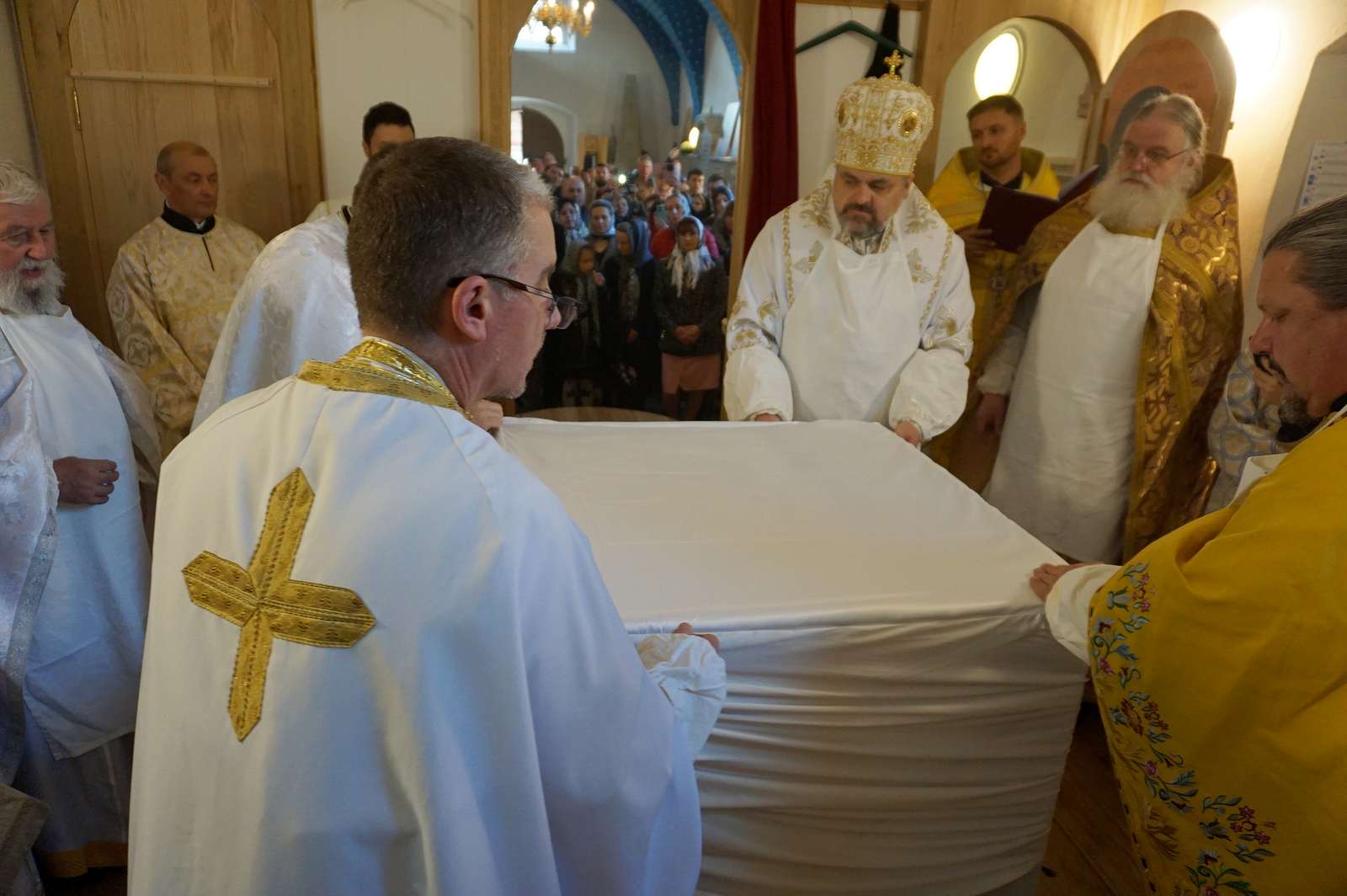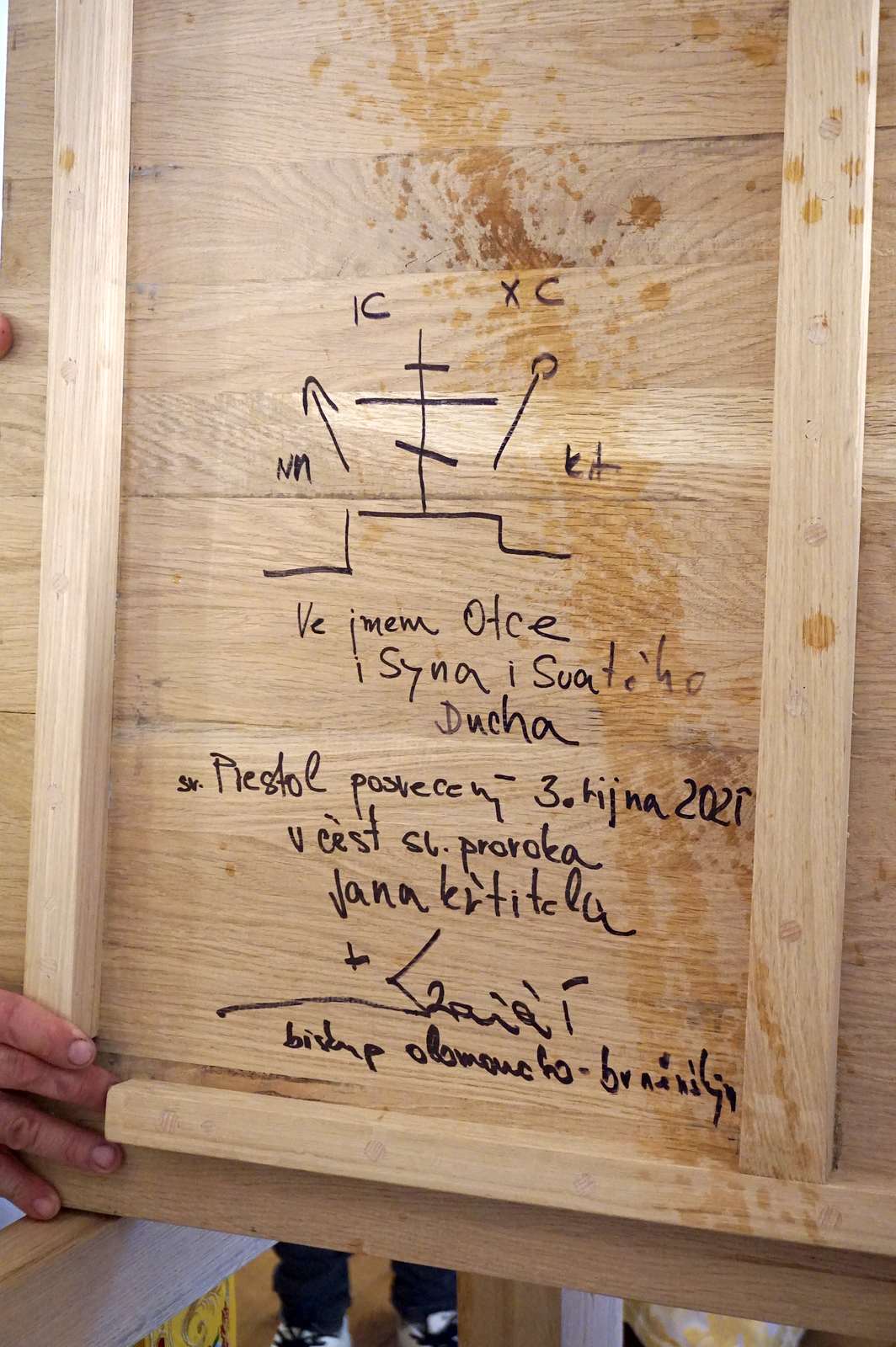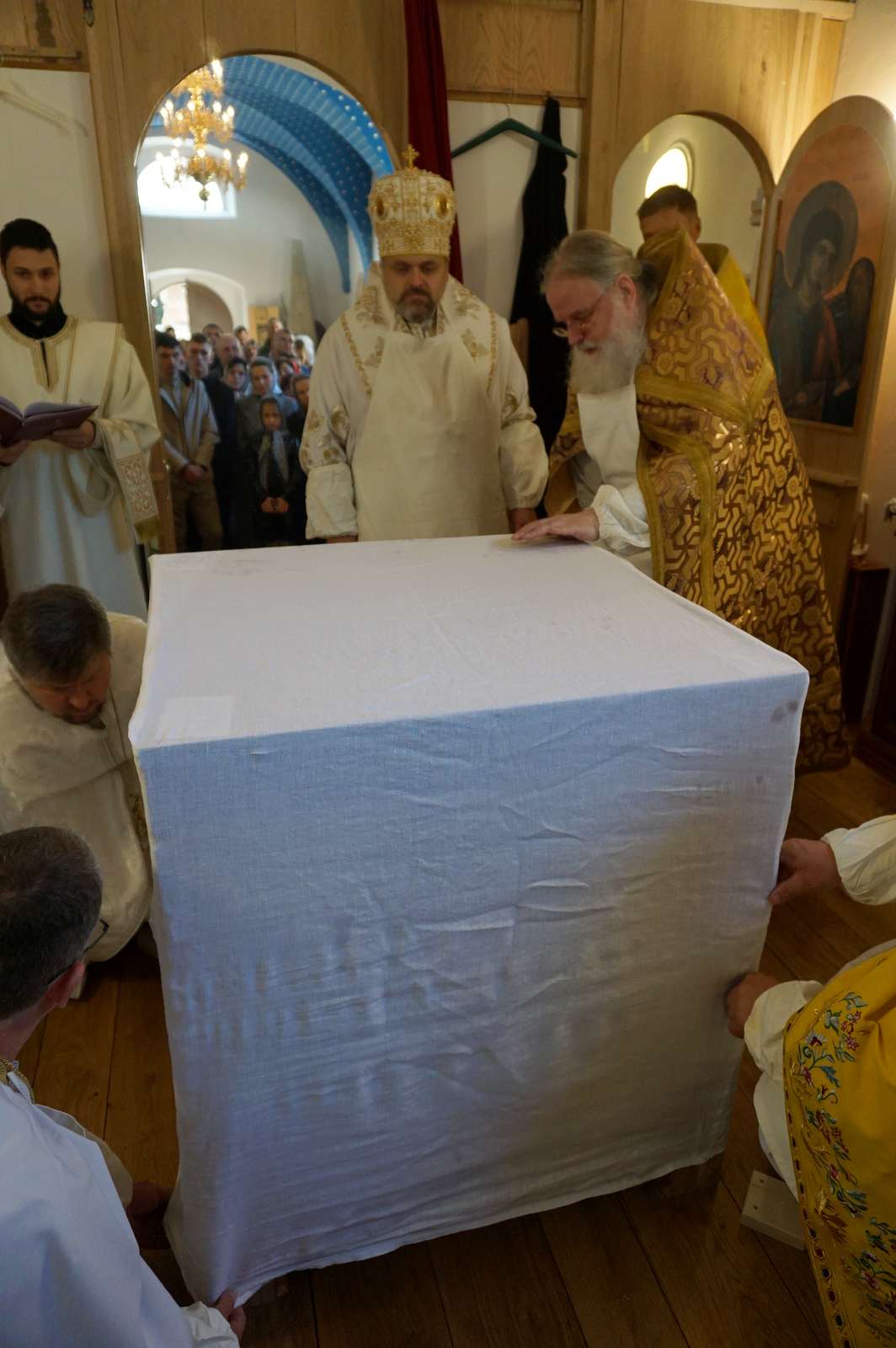 Připravili jsme také kovovou válcovou schránku, do níž byla vložena pamětní listina, jejíž slavnostní text přečetl duchovní správce všem přítomným, a vladyka ji poté stvrdil svým podpisem, k němuž připojili podpisy i všichni přítomní duchovní. Po vložení srolované listiny do kovové patrony, tam byly nasypány lístečky a vloženy zápisy se jmény všech přítomných věřících. Kapsle byla pevně uzavřena a zasunuta do páté prestolní nohy, zasypána pískem a zalita voskomastixem; na to pak byla vložena další kovová schránka, v níž byly částečky z ostatků tří mučedníků: sv. Olympia (prvomučedníka římského), svatých palestinských ctihodných mučedníků (umučených v r. 614 Peršany) a mučedníka sv. Maxima Gorlického (z Polska); do antiminsů pak vkládal vladyka ostatky mučedníka Eugenia. Svaté ostatky zalil vladyka svatým myrem, poté schránku uzavřel, vložil do páté nohy a zalil voskomastixem a vstup do dutiny zapečetil stříškou.