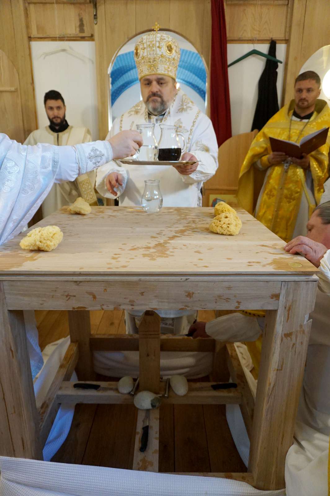 Přináší se džbán s horkou vodou, vladyka polévá prestol a kněží připravenými čtyřmi mořskými houbami prestol omývají – desku, nohy, všechno. Po osušení prestolu bere vladyka do rukou dva džbánky – jeden s růžovou vodou a jeden s červeným vínem. Posvětí je a slévá oba džbány do jednoho, načež polévá prestol touto směsí na způsob kříže. Kněží holými dlaněmi roztírají víno po prestolu, a pak houbami; potírají i nohy prestolu. Nakonec zbylou tekutinu osuší novými utěrkami.