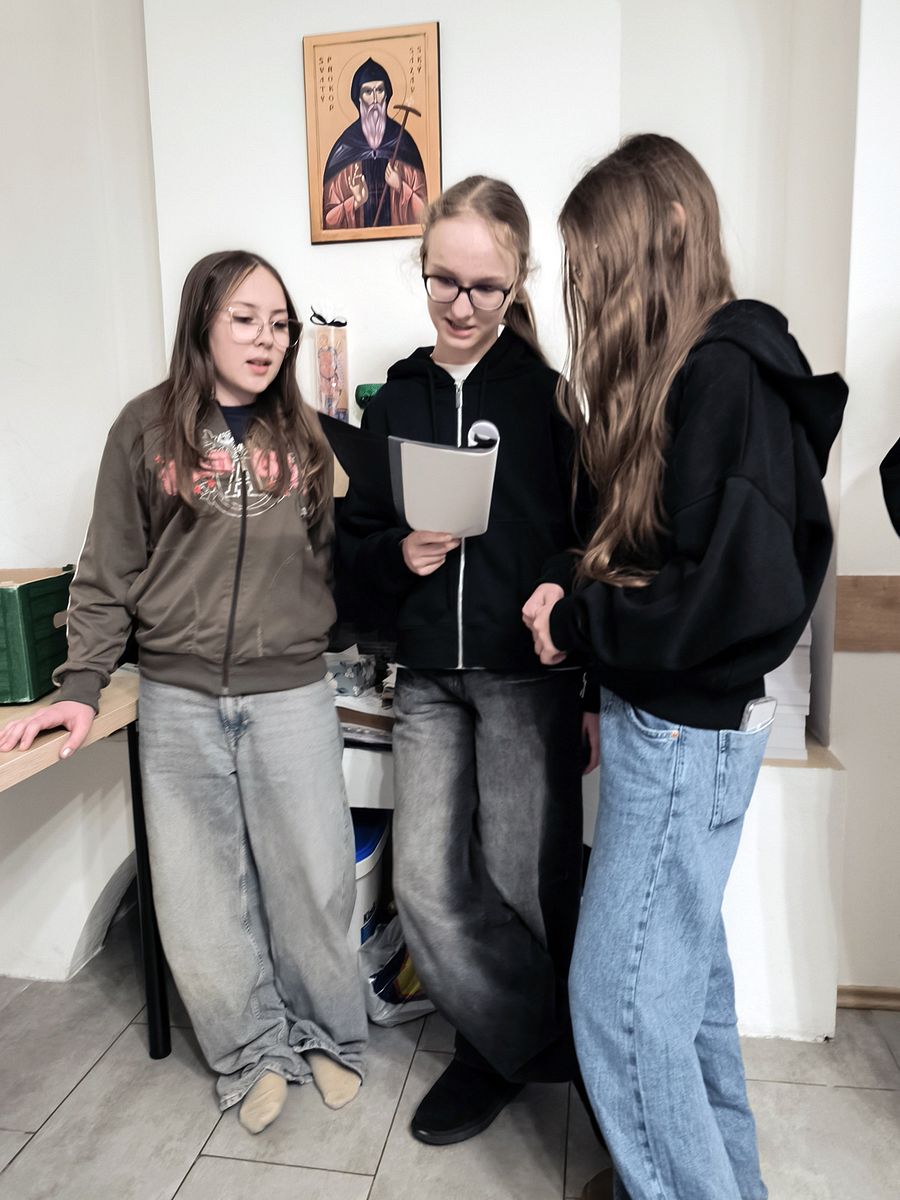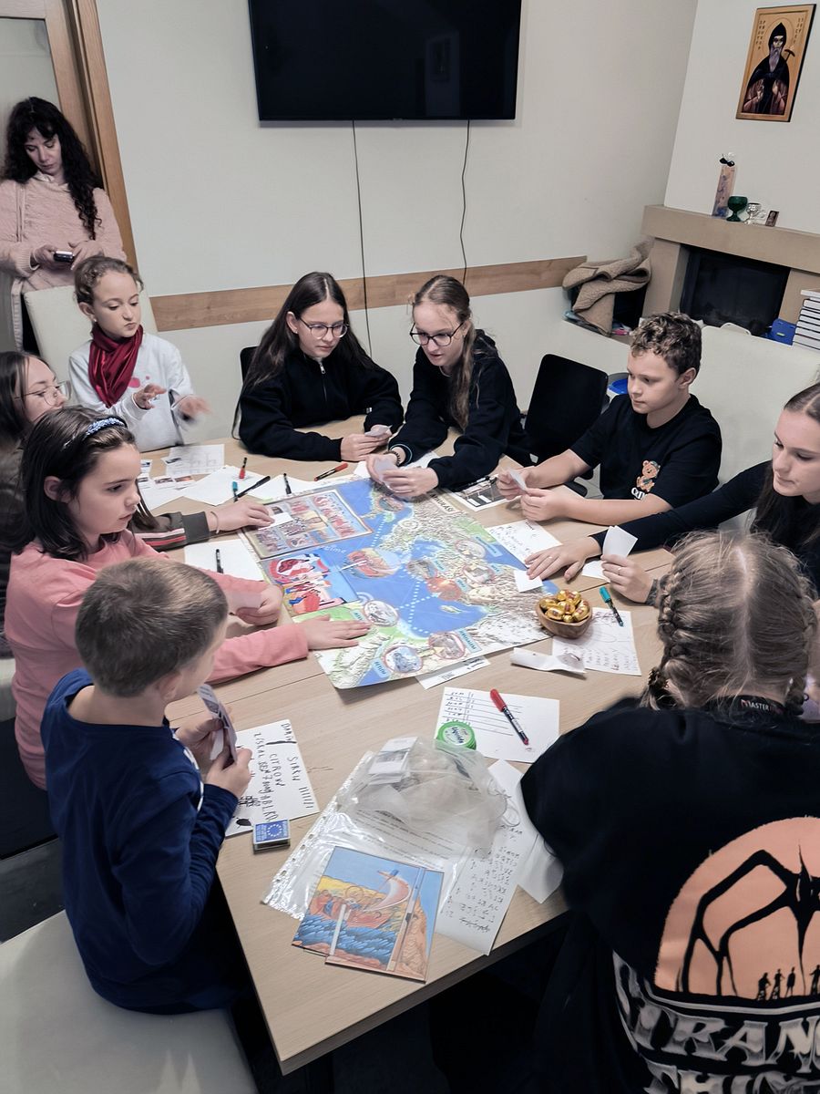 Zahráli jsme si deskovou hru AZ Kvíz. Otázky v této hře byly vybrány z životopisů sv. Rostislavova, ct. Joba Počájevského a sv. Dimitrie Soluňského. Přečetli jsme si Podobenství o rybářské síti. Povídali jsme si o tom, kdo je ve skutečnosti lepší a úloze pokory v lidském životě. Vyložili jsme si význam jednoho z Blahoslavenství, a to „Blahoslavení chudí duchem, neboť jejich je království nebeské.“ Střídali jsme se ve vyprávění příběhu, který měly děti dovést do dobrého konce a organizátor se ho snažil dovést opačným směrem. Krátkou hříčku, ve které si měly děti zapamatovat skupinu písmen jsme rozvedli ve tvoření jmen světců. Hodinu jsme si zpestřili hou Autobus.