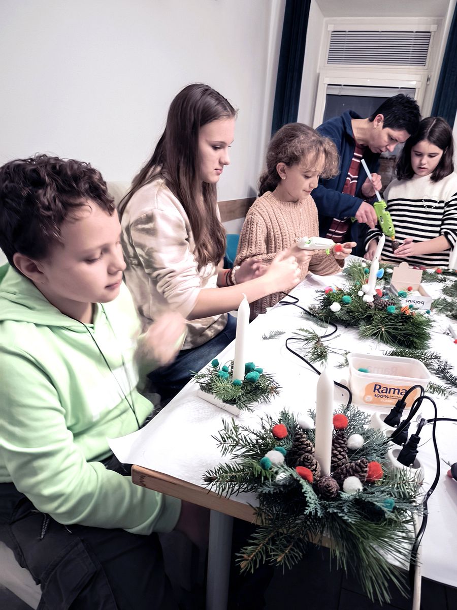 Pokračovali jsme v nacvičování zpěvu koled. Naučili jsme se zpívat Půjdem spolu do Betléma, Jak jsi krásné neviňátko, Pásli ovce Valaši, Nesem vám noviny a další české koledy. Pod vedením paní Inny, která pro náš chrám vytváří krásnou květinovou výzdobu, jsme vyrobili vánoční ozdobu. Na dřevěnou podložku jsme umístili svíčku, tu obklopili jemnými jedlovými větvičkami, přidali šišky a vlněné bavlnky. Hotovou ozdobu pokryli dekorativním sněhem.