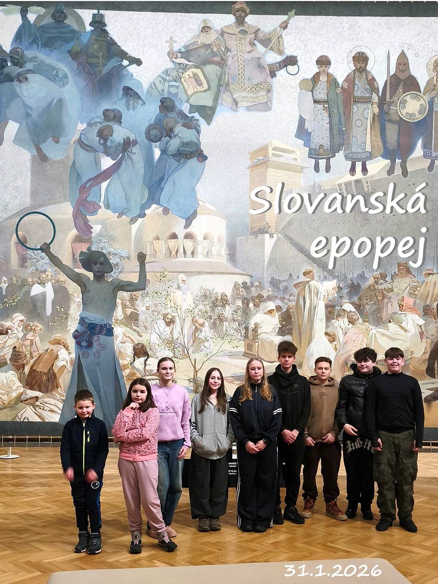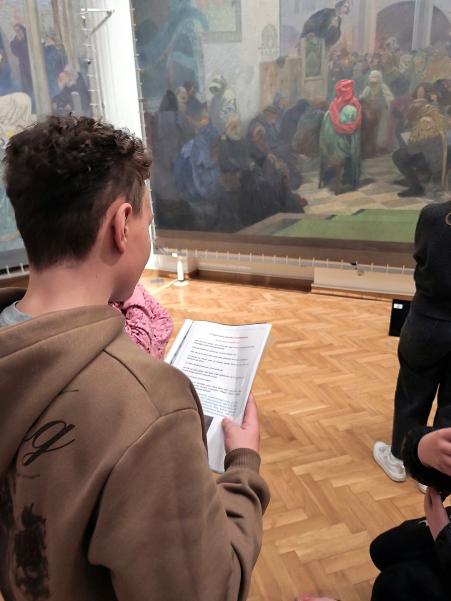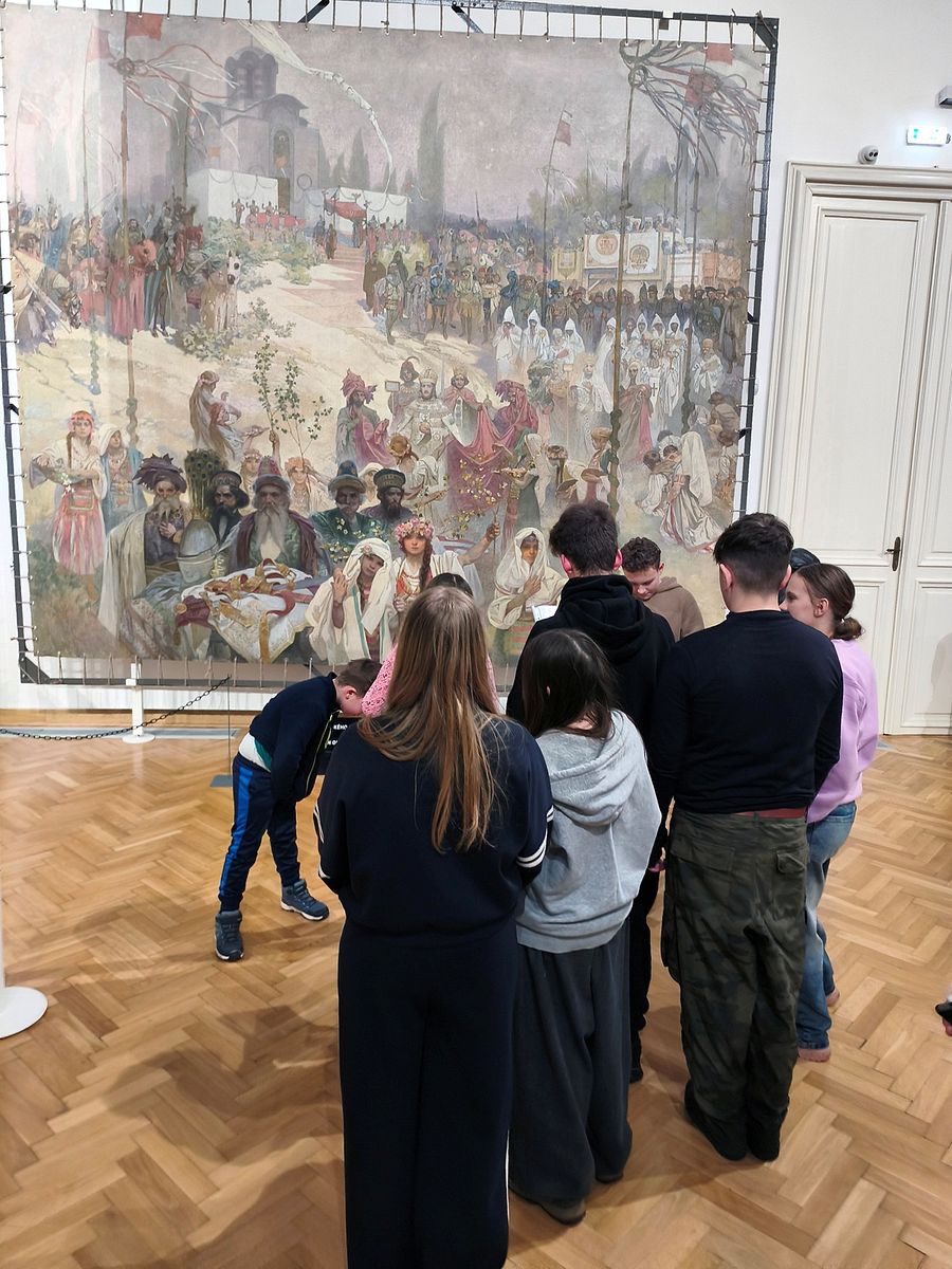 Slovanská epopej má celkem dvacet velkorozměrových obrazů, které zobrazují události z historie slovanských národů, zejména českého a moravského. U vybraných obrazů jsme se zaslavili déle. Ke každému z nich jedno dítě přečetlo ostatním text o události, kterou zobrazuje. U ostatních obrazů jsme plnili tichou aktivitu, ve které jsme hledali na plátně nějaký drobný, ale výrazný předmět. Některé obrazy byly o událostech, o kterých jsme si povídali už dříve na hodinách náboženství. Takže to pro nás bylo i takové malé opakování.