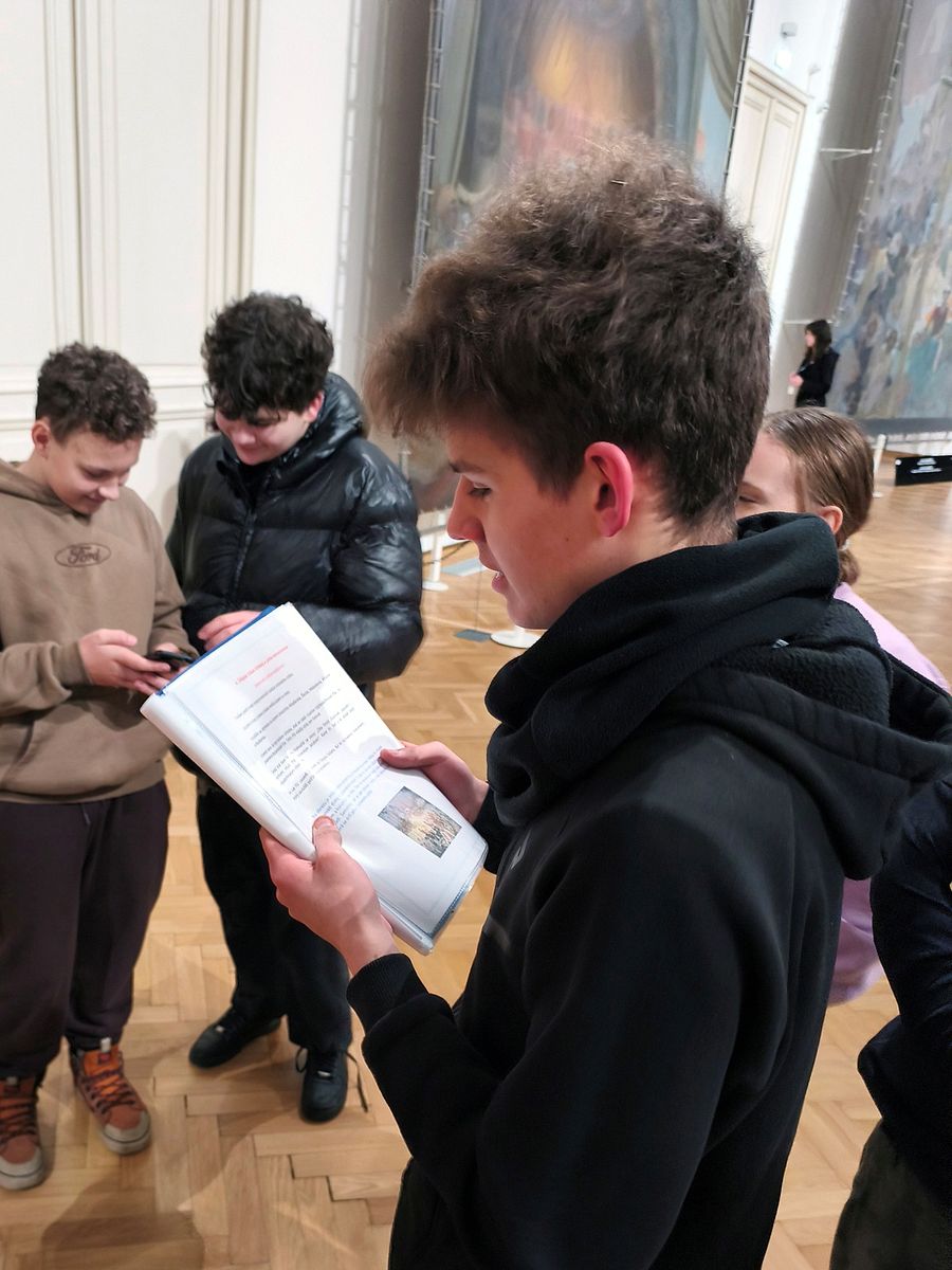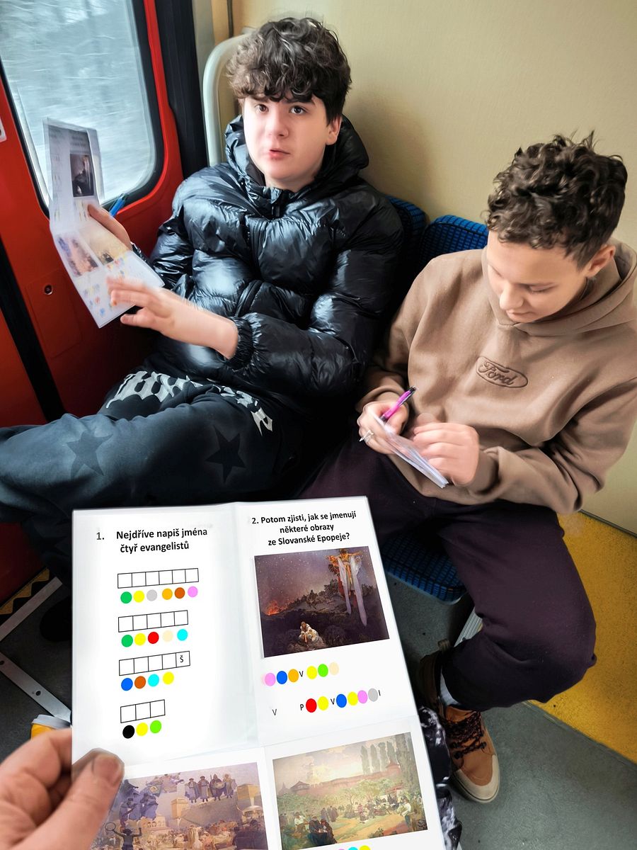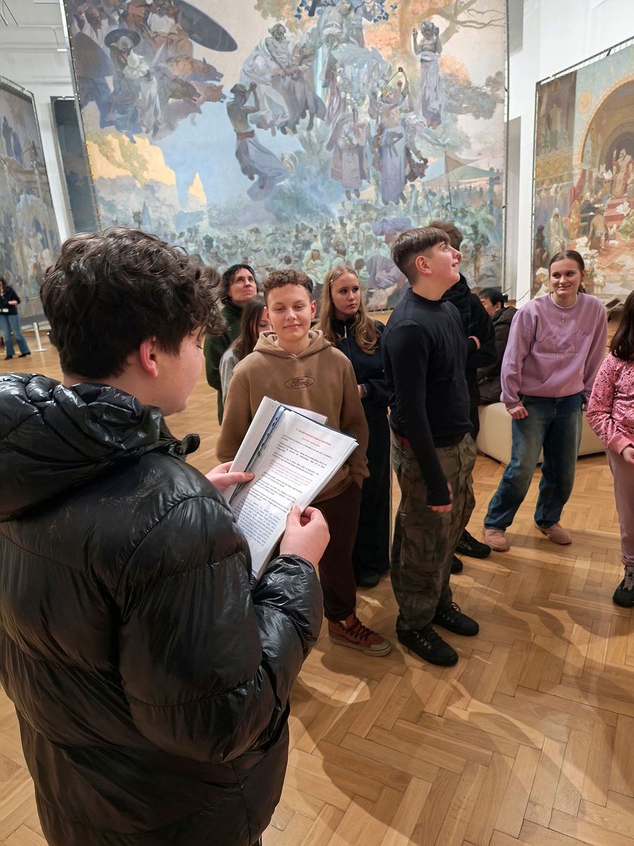 Slovanská epopej má celkem dvacet velkorozměrových obrazů, které zobrazují události z historie slovanských národů, zejména českého a moravského. U vybraných obrazů jsme se zaslavili déle. Ke každému z nich jedno dítě přečetlo ostatním text o události, kterou zobrazuje. U ostatních obrazů jsme plnili tichou aktivitu, ve které jsme hledali na plátně nějaký drobný, ale výrazný předmět. Některé obrazy byly o událostech, o kterých jsme si povídali už dříve na hodinách náboženství. Takže to pro nás bylo i takové malé opakování.