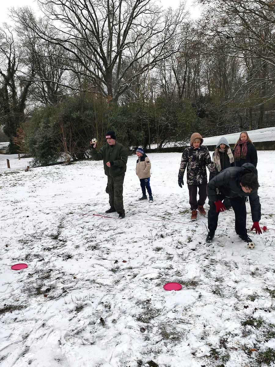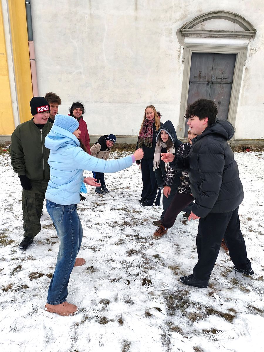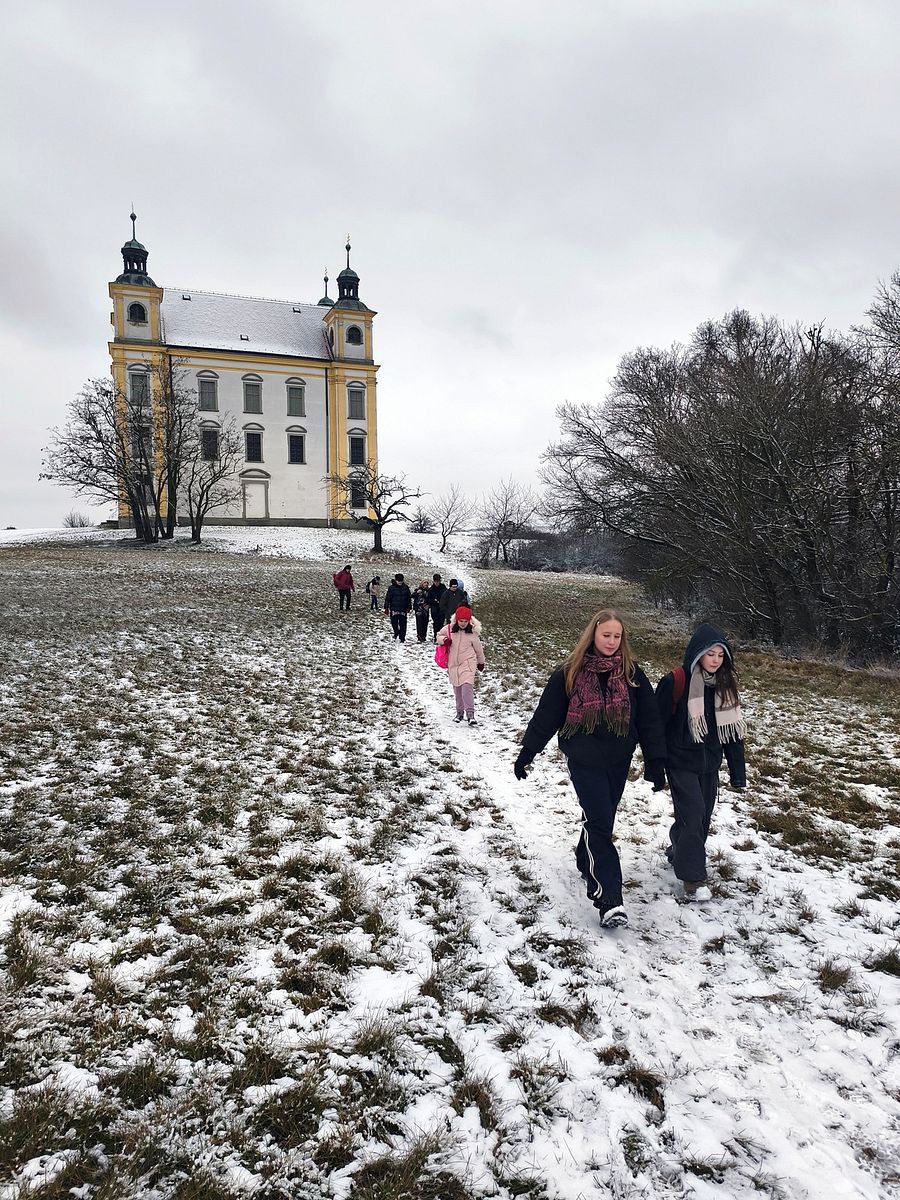 U kaple sv. Floriana jsme pro si pro zahřátí zahráli Hry „Štěstí“ a Kámen, nůžky, papír – chyť ho“.  Zimní krajinou jsme pokračovali v cestě až do údolí říčky Rokytné. To už jsme byli blízko našeho cíle. V zámeckém altánu jsme se naobědvali a zasportovali si při kolektivních aktivitách s míčem. Protože nás čekala náročná prohlídka výstavy, raději jsme se předtím v hříčce „Vyřvávaná“ vydováděli, abychom byli na výstavě co nejklidnější.